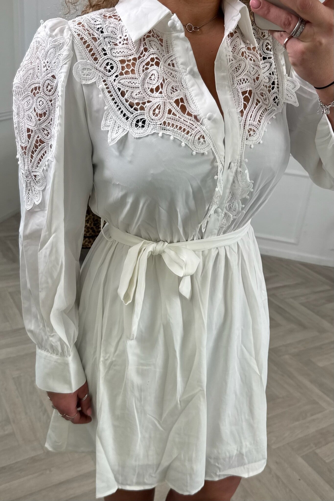 Deze prachtige jurk heeft leuke lace details en een elastieke taille. Shop hem in white!