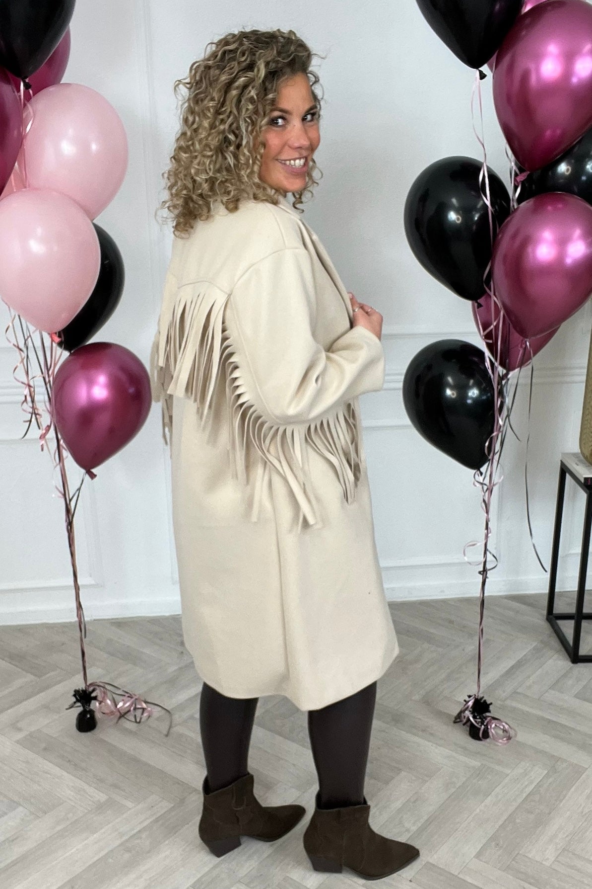 Wauw! hoe enig is deze fringe jas?! Perfect voor nu! Shop de musthave fringe coat in beige!