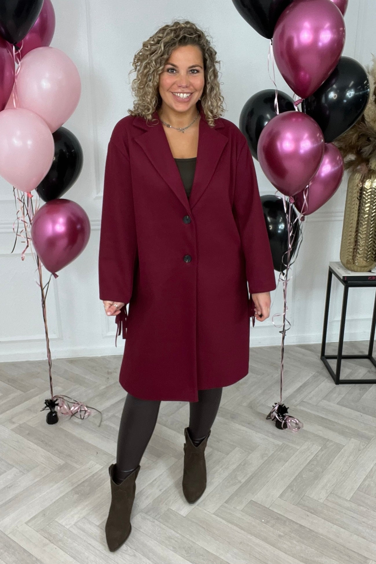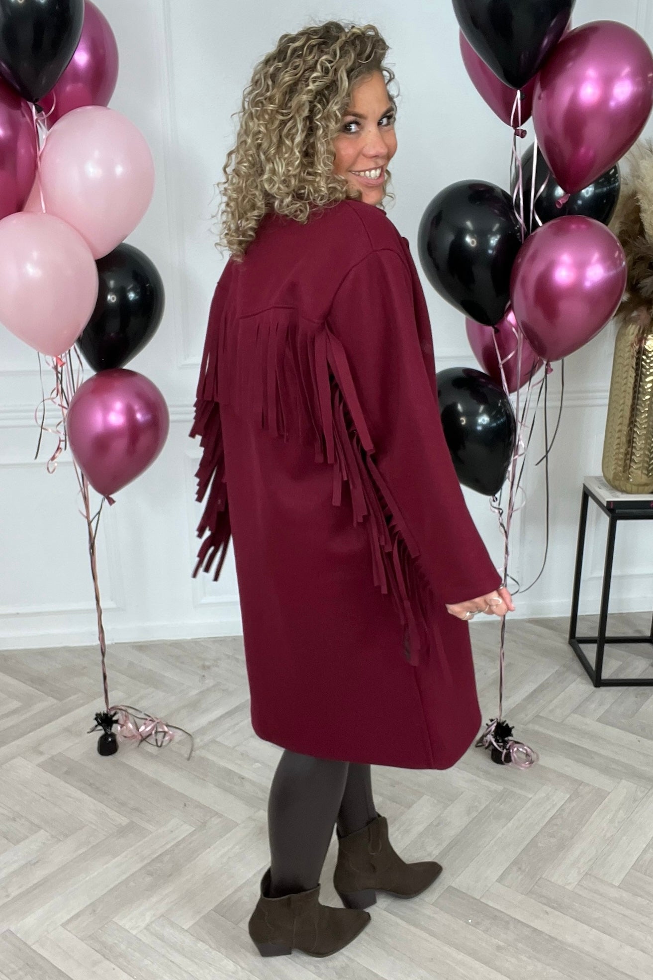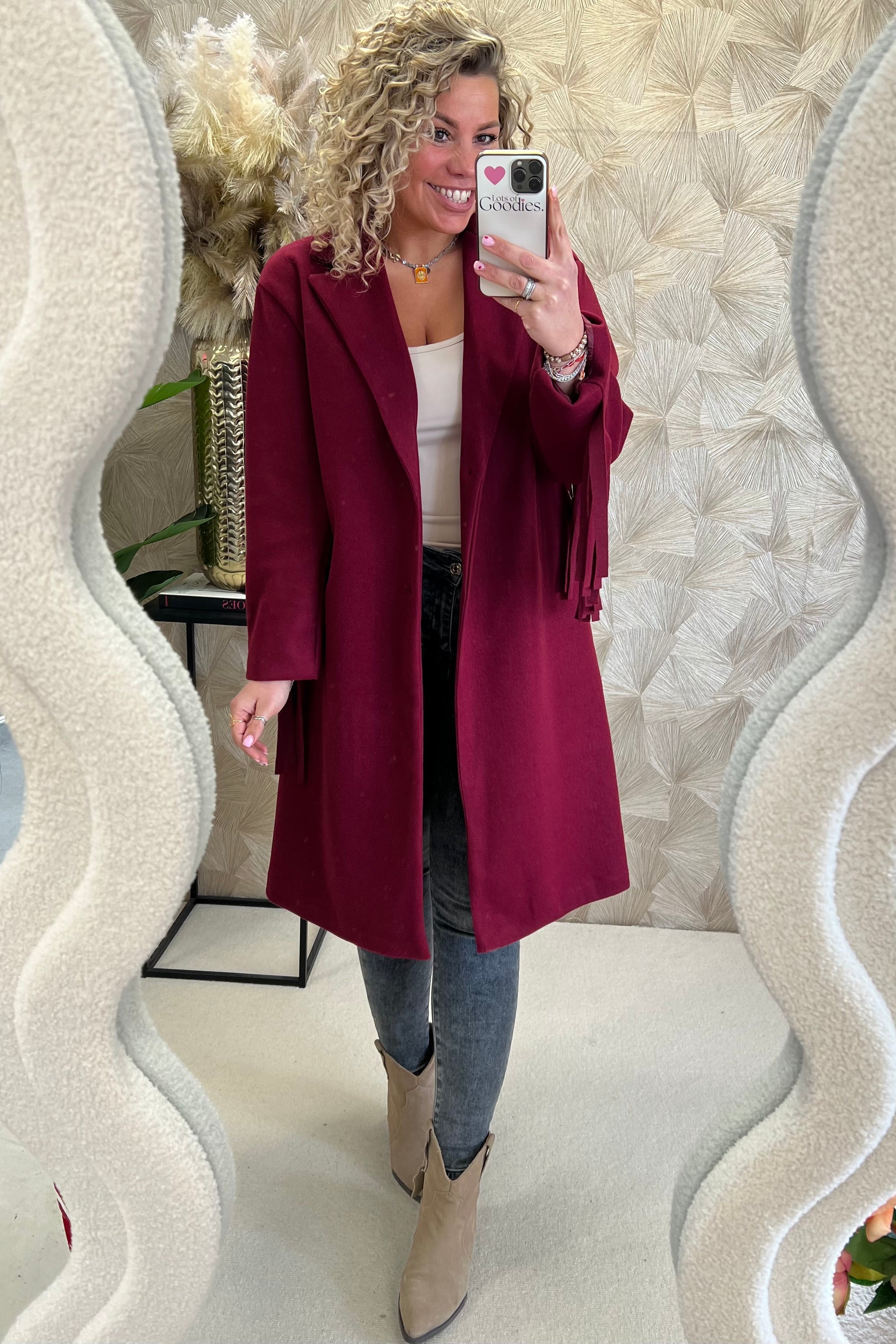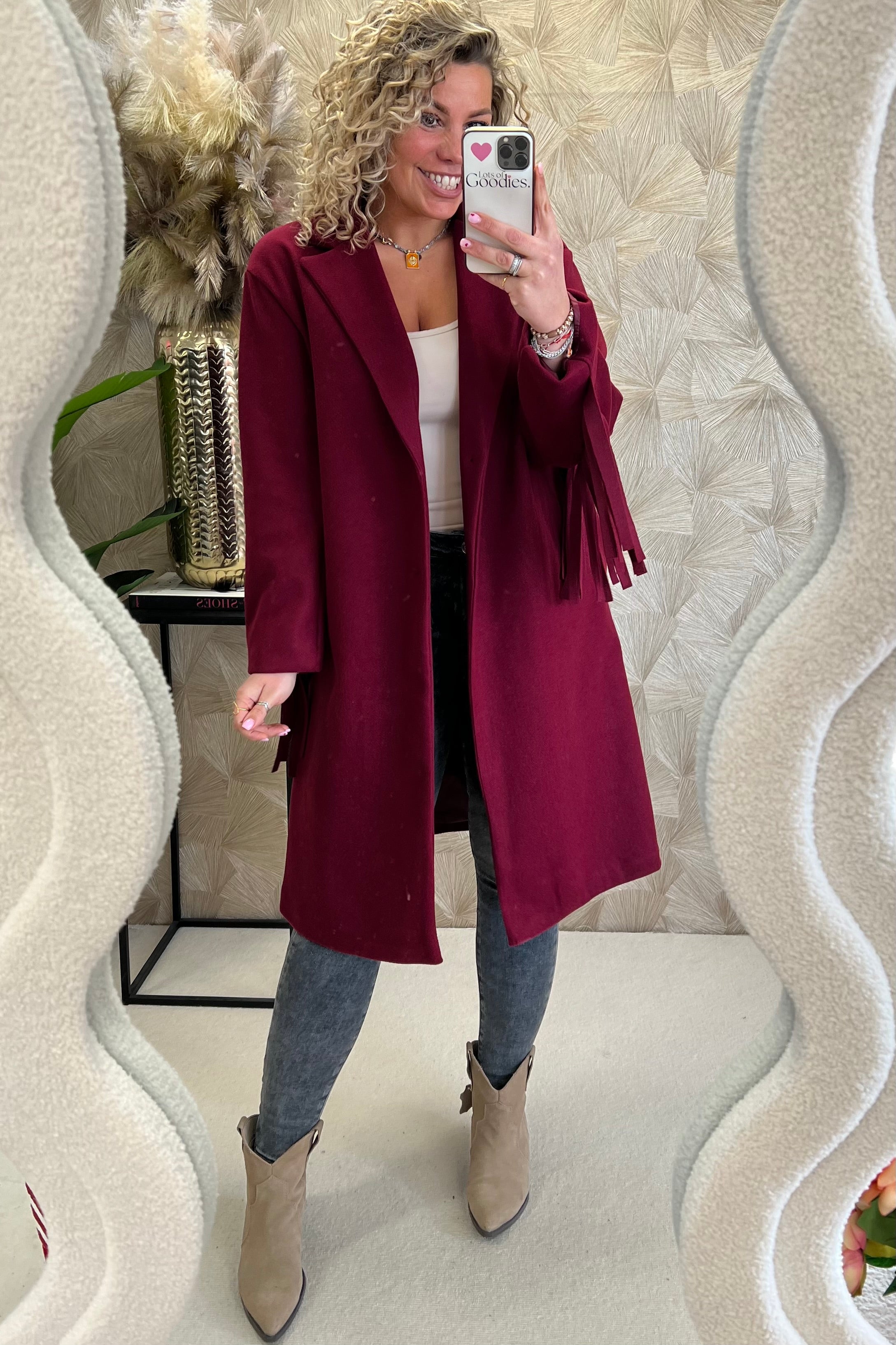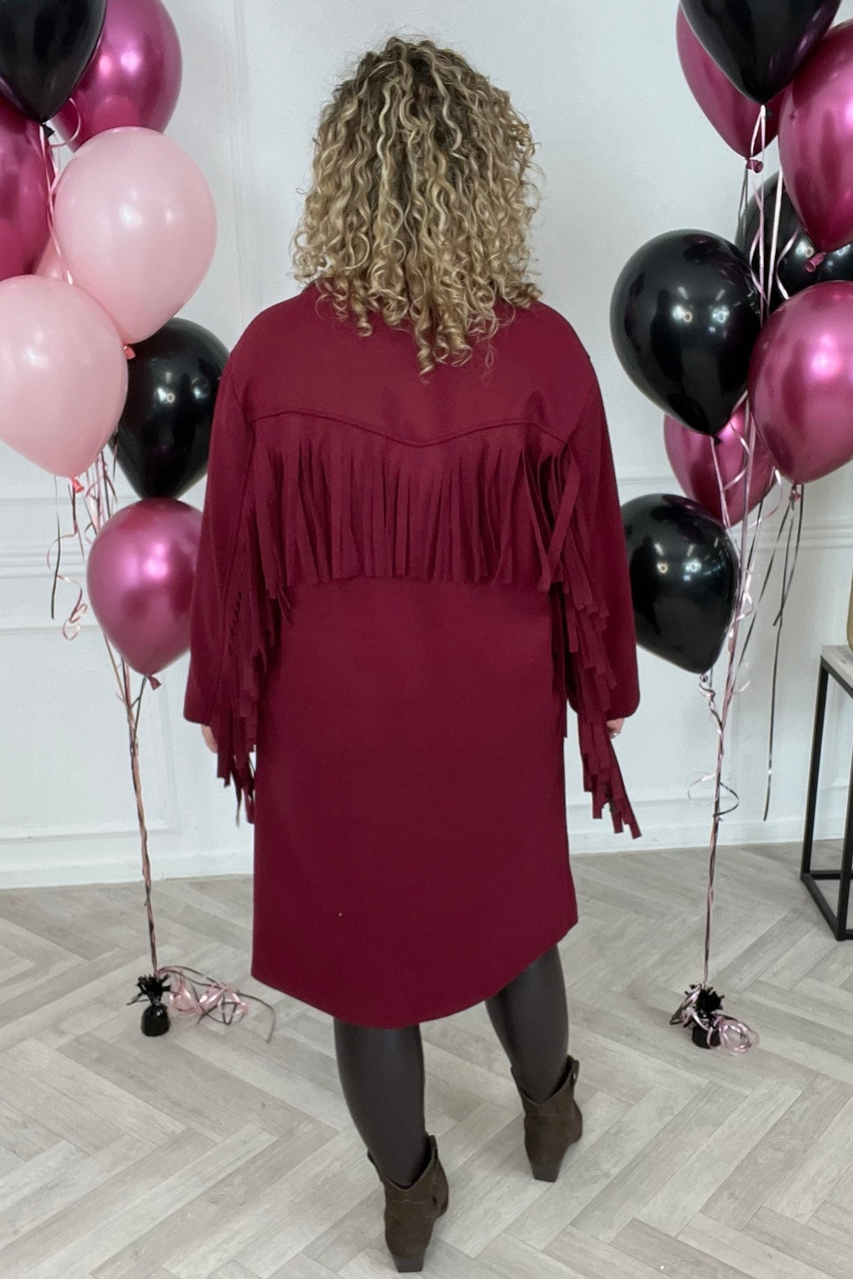 Wauw! hoe enig is deze fringe jas?! Perfect voor nu! Shop de musthave fringe coat in bordeaux!