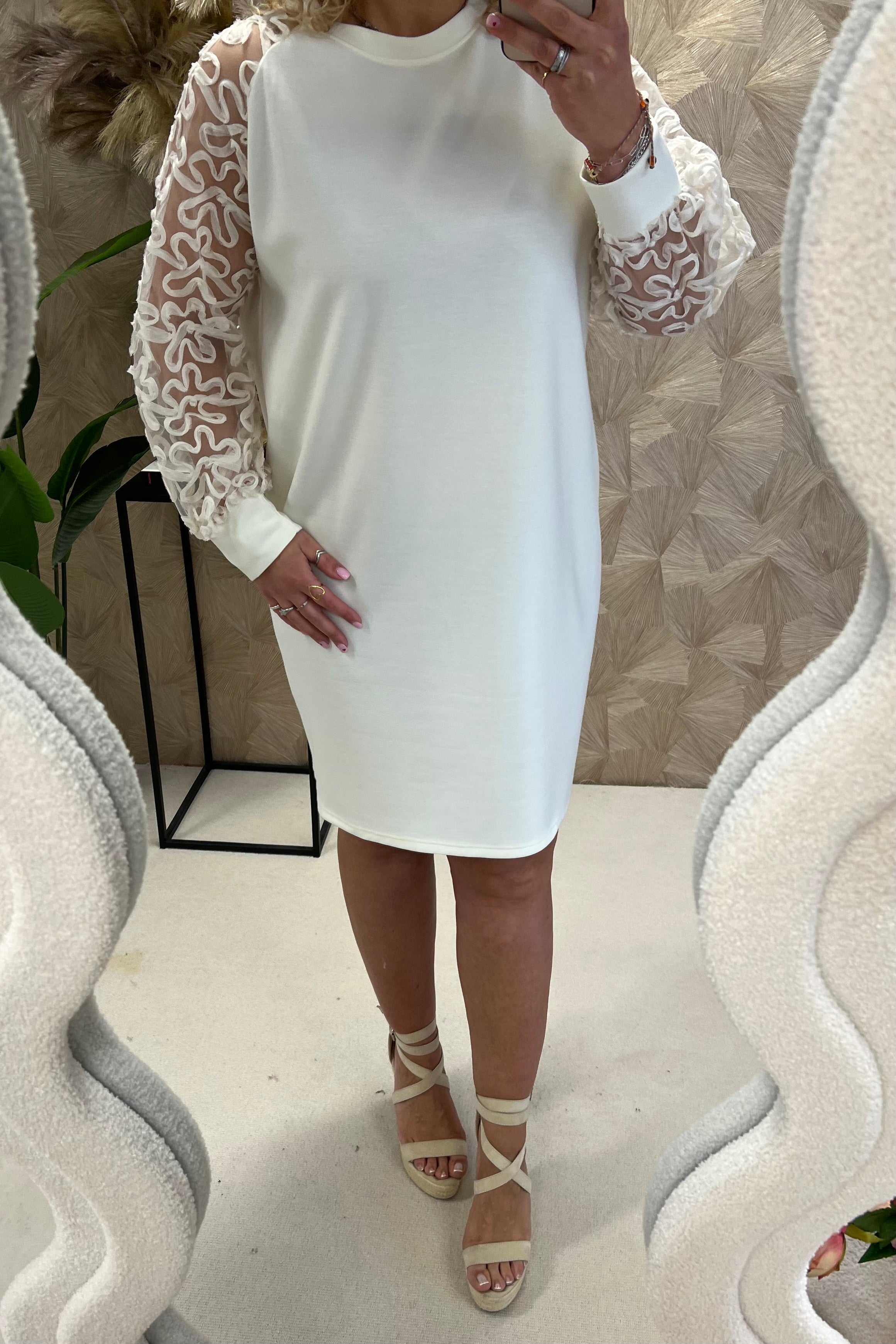 Deze heerlijke sweaterdress met lace mouwen zit heerlijk en ziet er prachtig uit! Shop hem in creme!