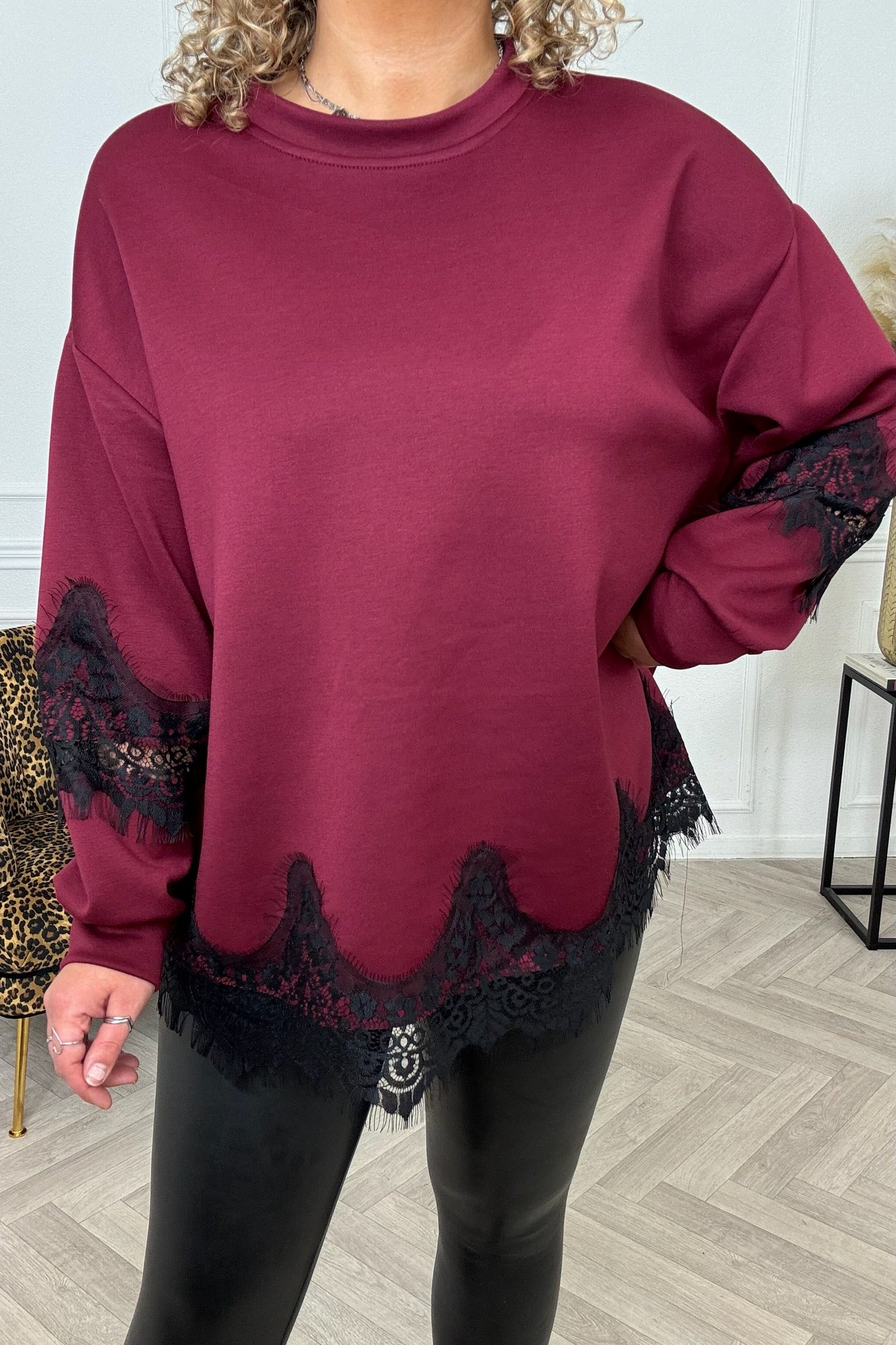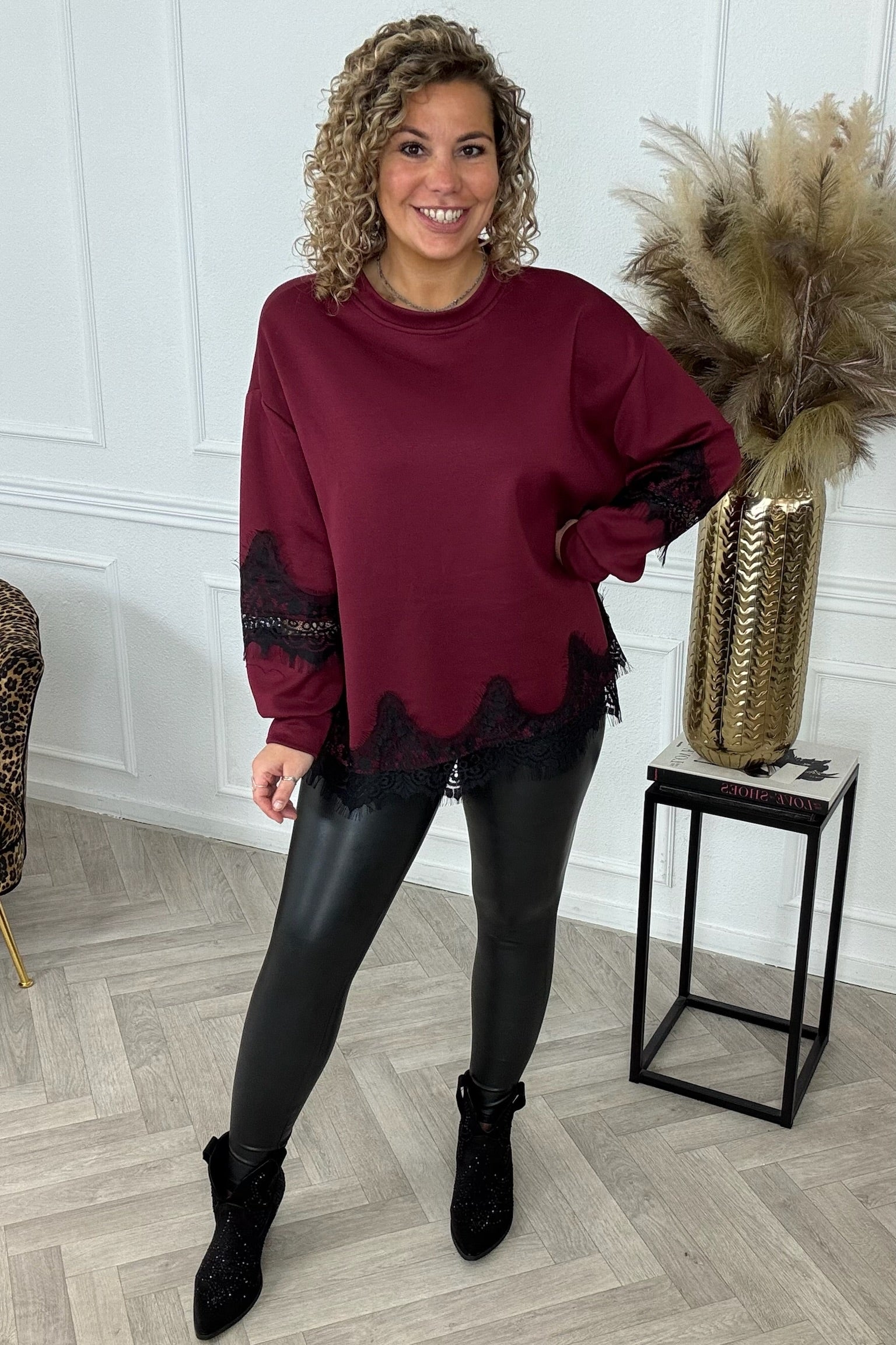 Een super leuke sweater met lace aan de onderkant, en halverwege de mouw. Het geeft net dat beetje extra! Shop de musthave lace sweater nu in bordeaux.