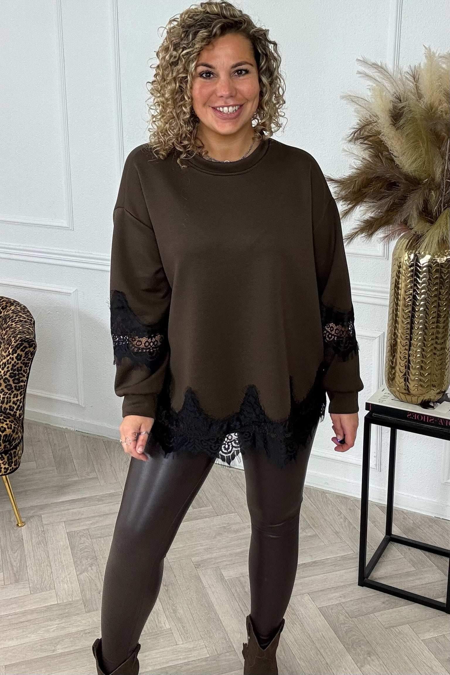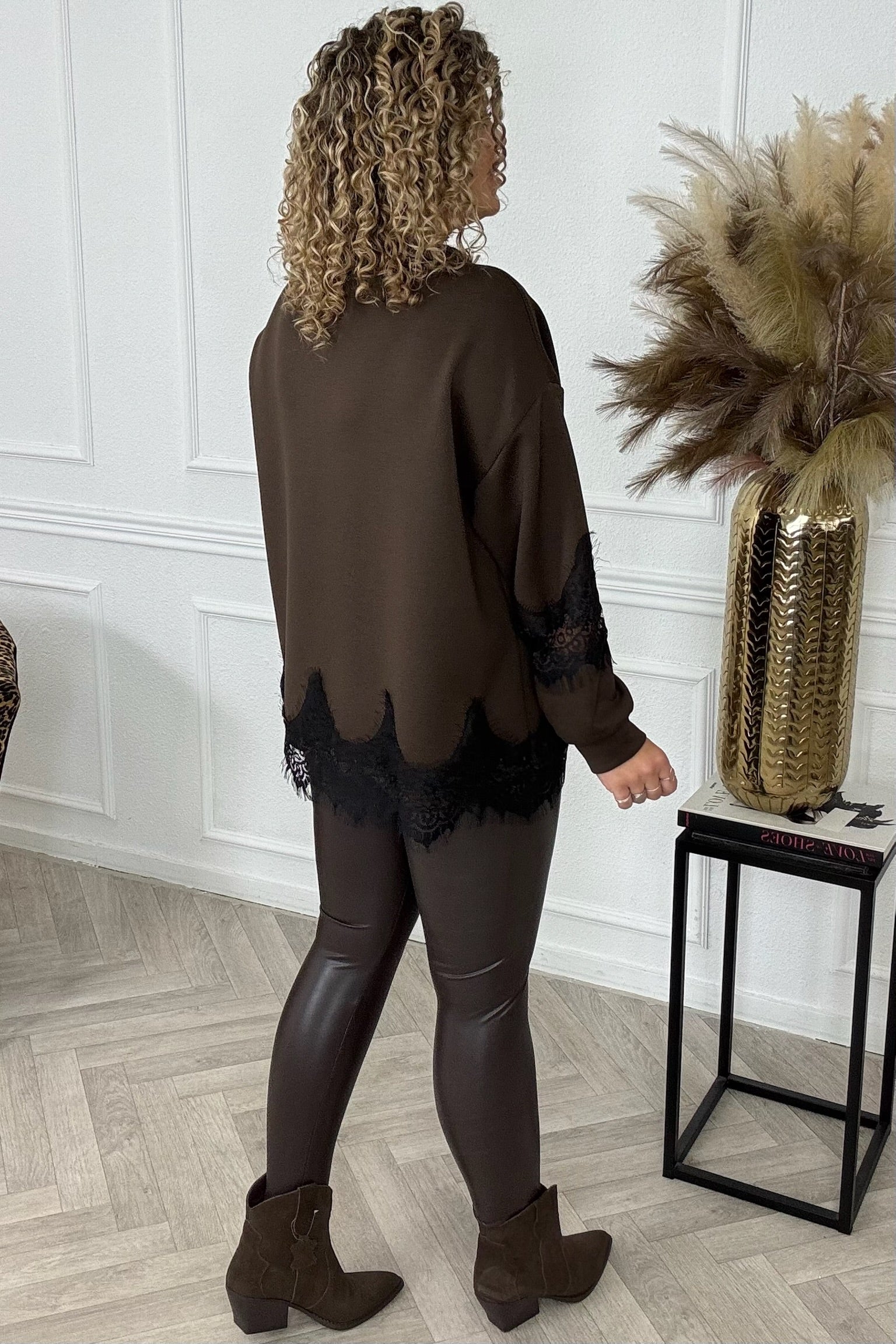Een super leuke sweater met lace aan de onderkant, en halverwege de mouw. Het geeft net dat beetje extra! Shop de musthave lace sweater nu in brown.