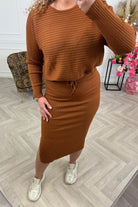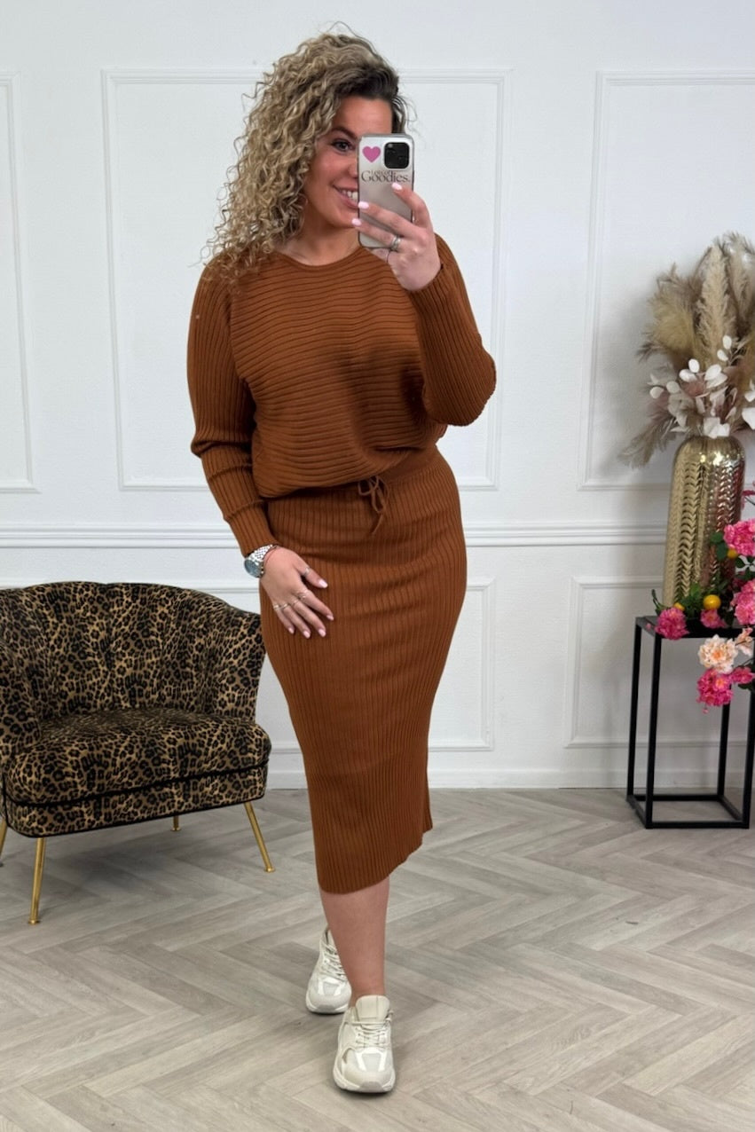 Deze heerlijke set bestaat uit een van rib stof sweater en een midi rok met split, beide heerlijk zacht en comfy! Shop hem in Camel!