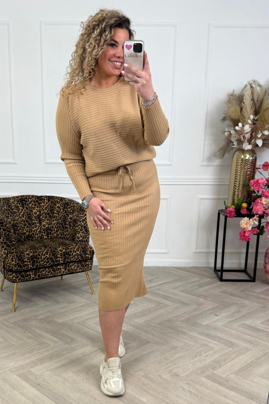 Deze heerlijke set bestaat uit een van rib stof sweater en een midi rok met split, beide heerlijk zacht en comfy! Shop hem in Caramel!