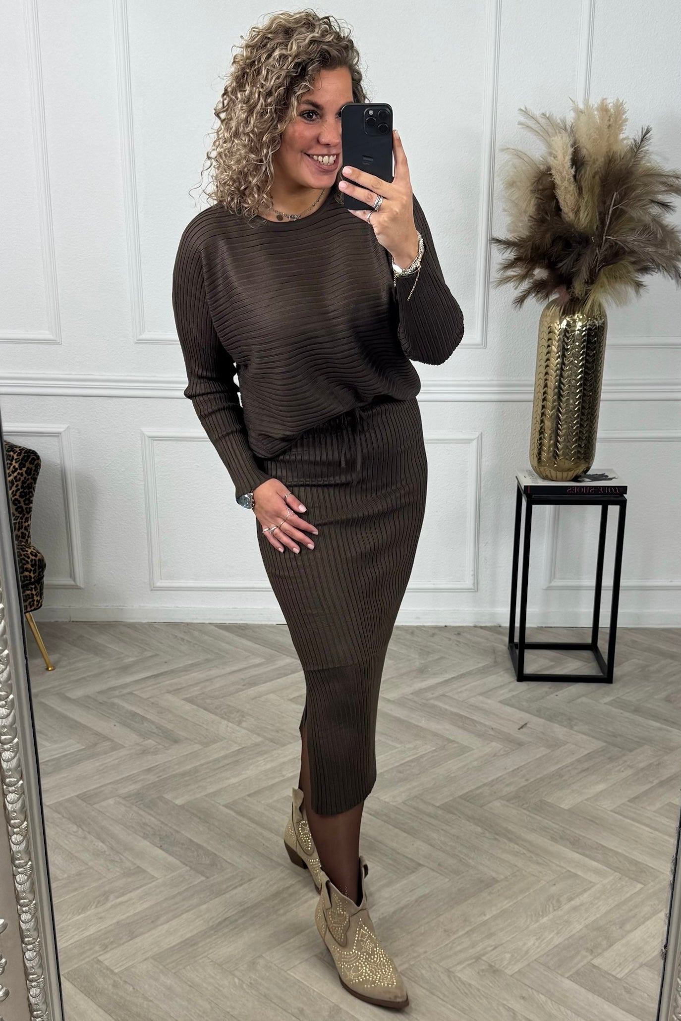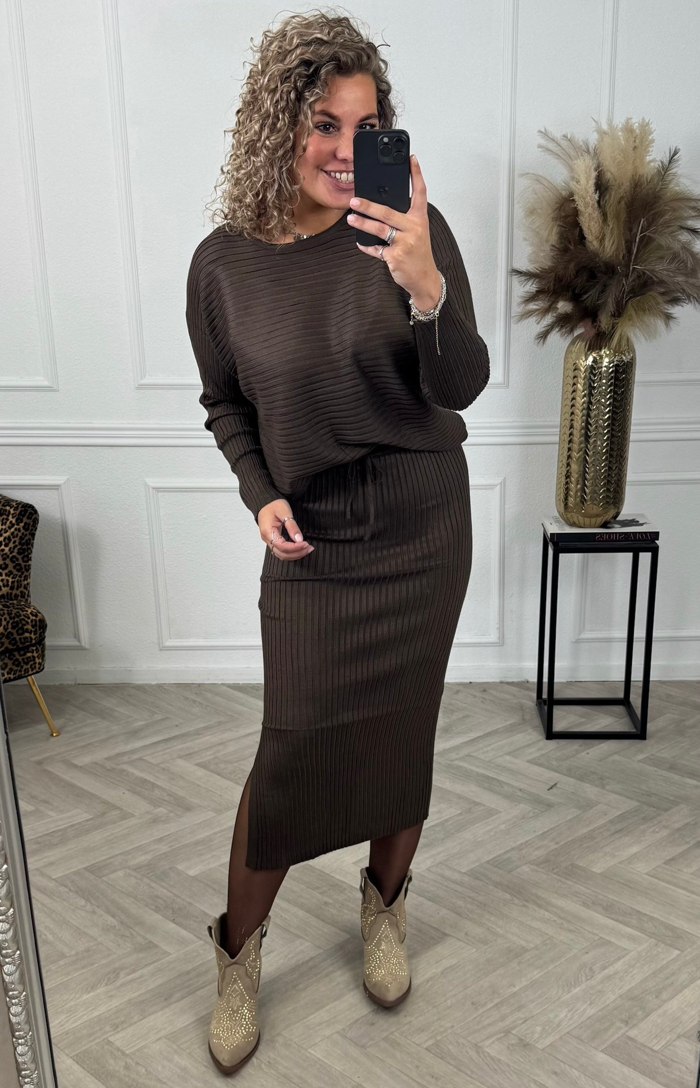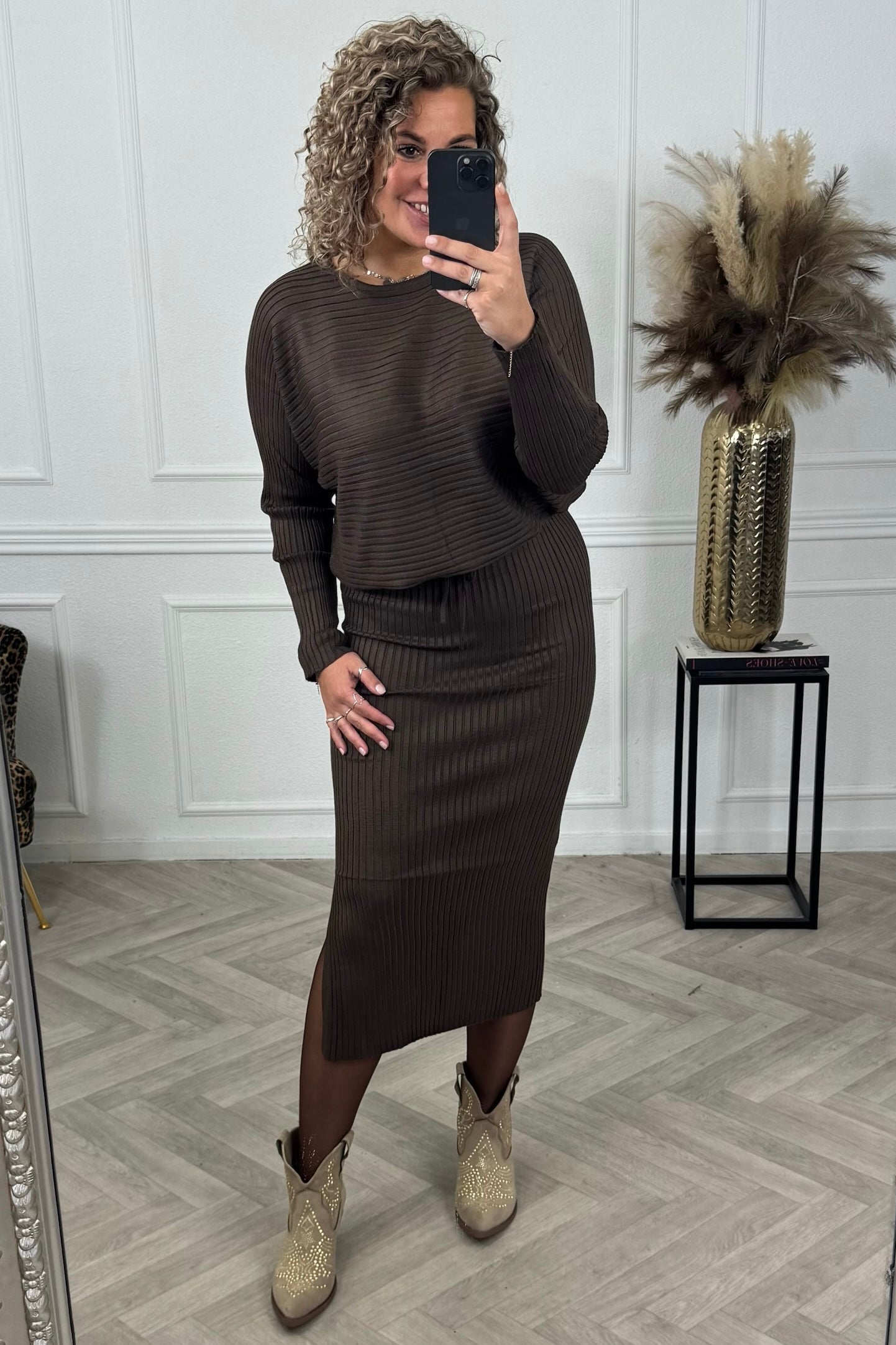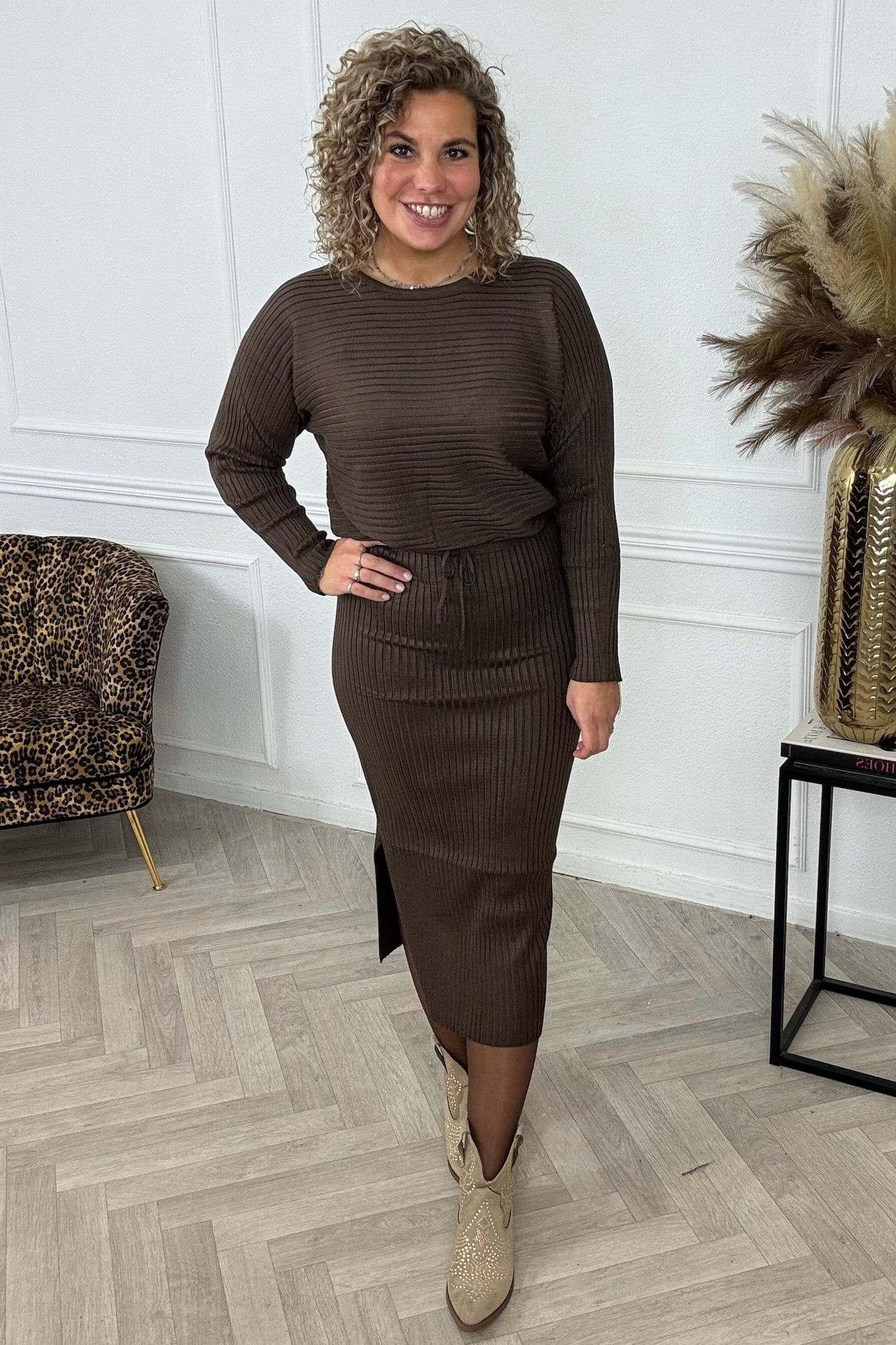 Deze heerlijke set bestaat uit een van rib stof sweater en een midi rok met split, beide heerlijk zacht en comfy! Shop hem in chocolate!