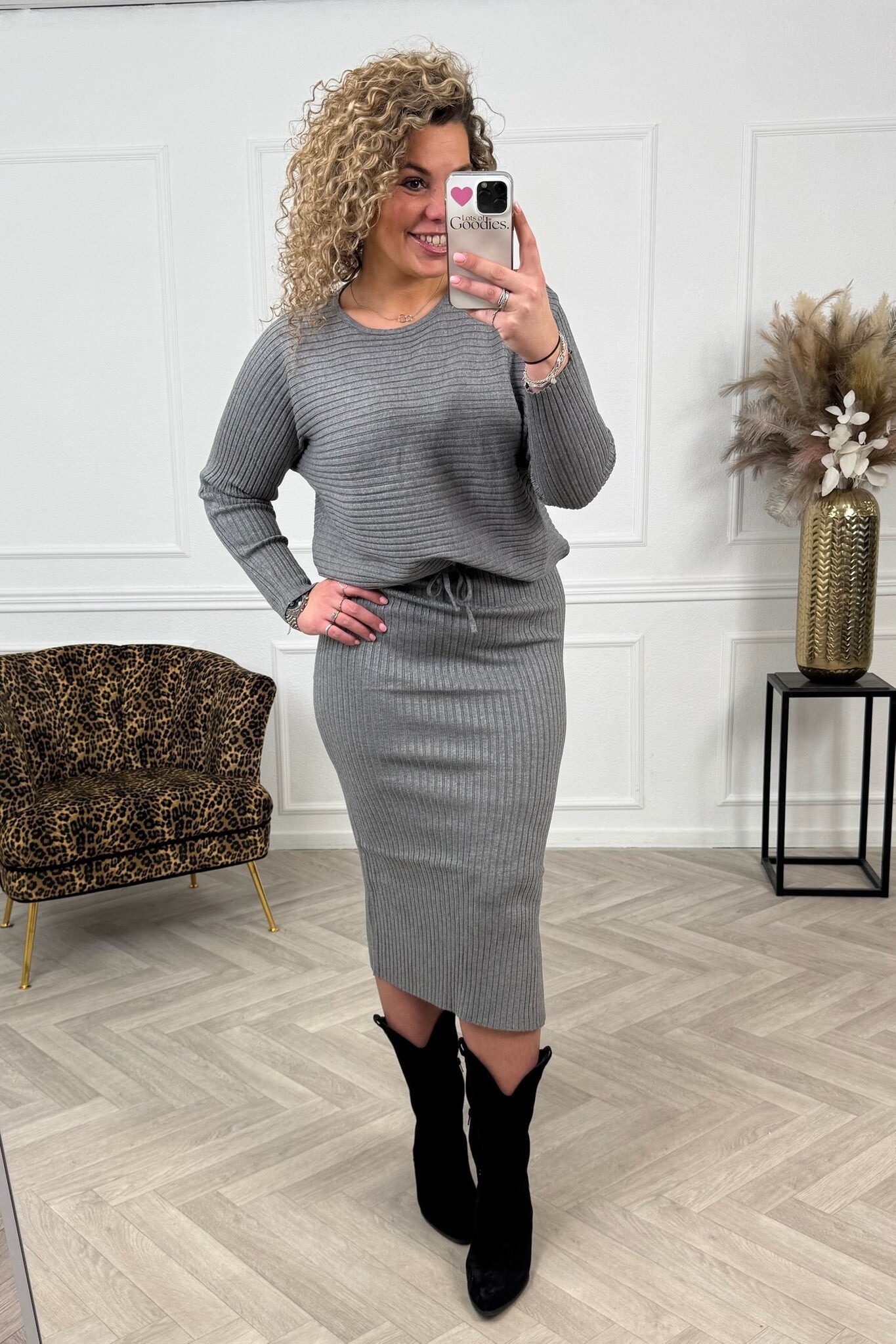 Deze heerlijke set bestaat uit een van rib stof sweater en een midi rok met split, beide heerlijk zacht en comfy! Shop hem in grey!