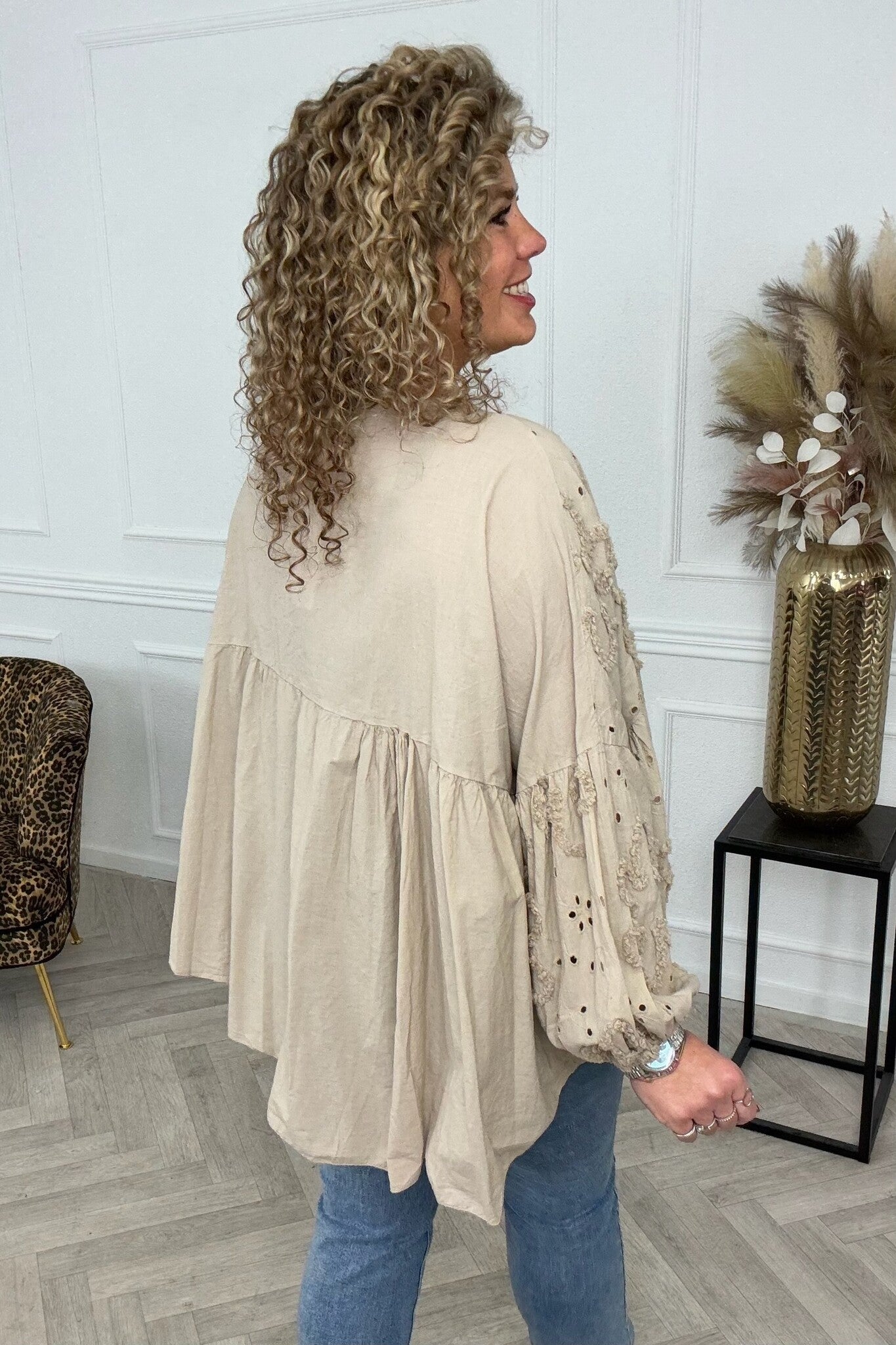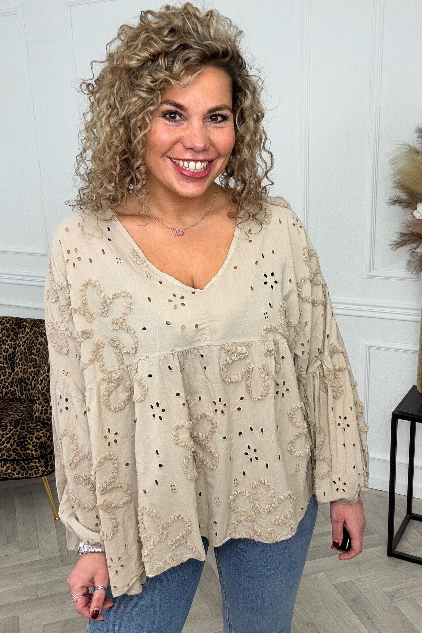 We hebben een super vrolijke blouse binnen met een v-nek en een bloemetjes patroon. We love it! Shop hem nu in beige.