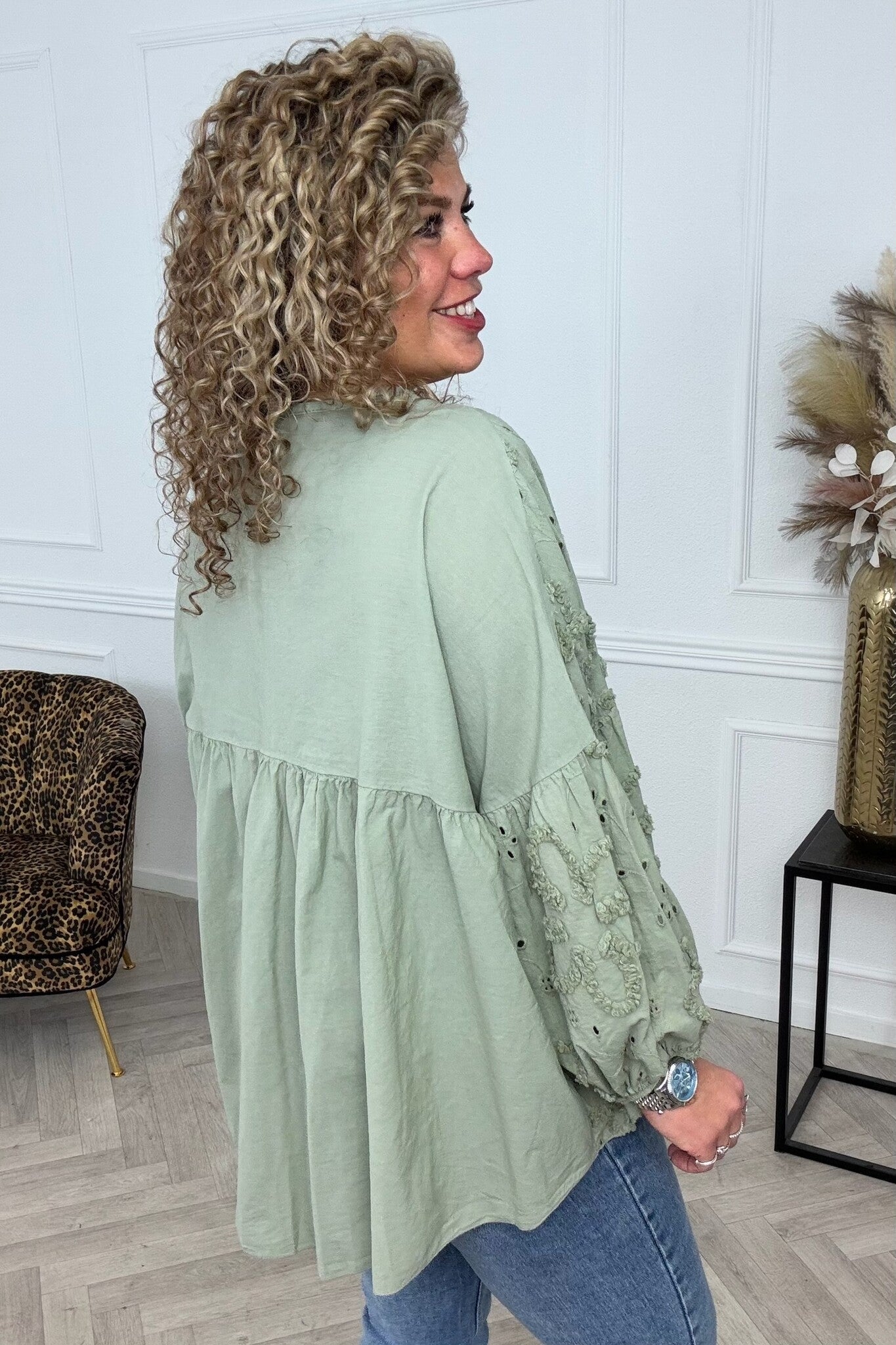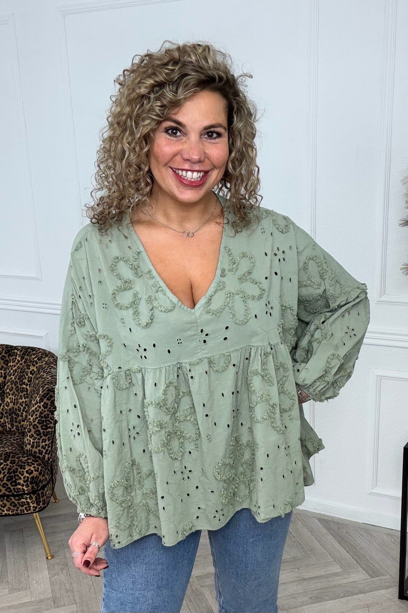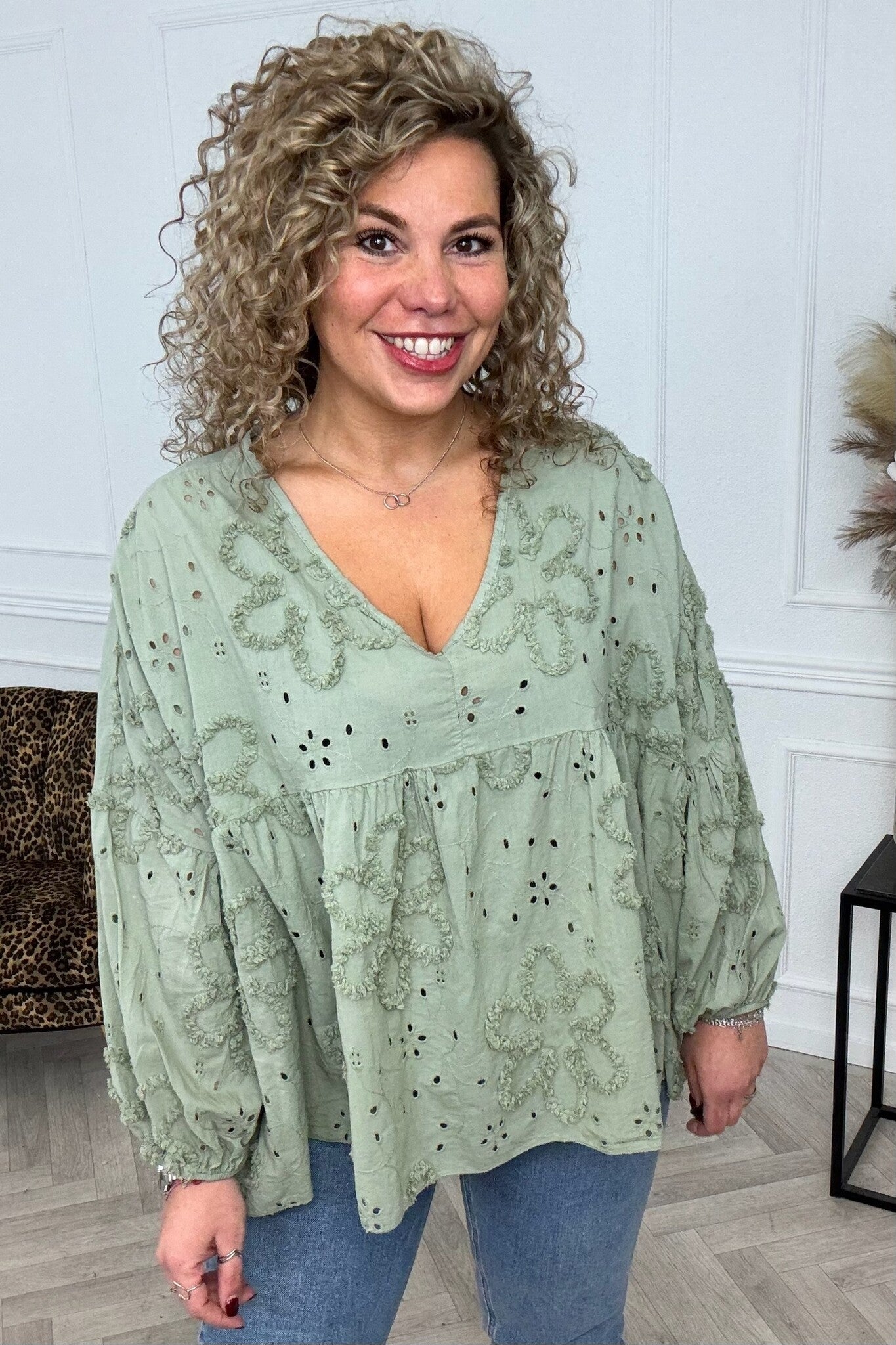 We hebben een super vrolijke blouse binnen met een v-nek en een bloemetjes patroon. We love it! Shop hem nu in sage.