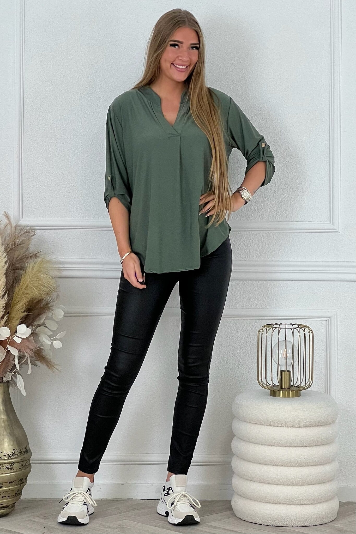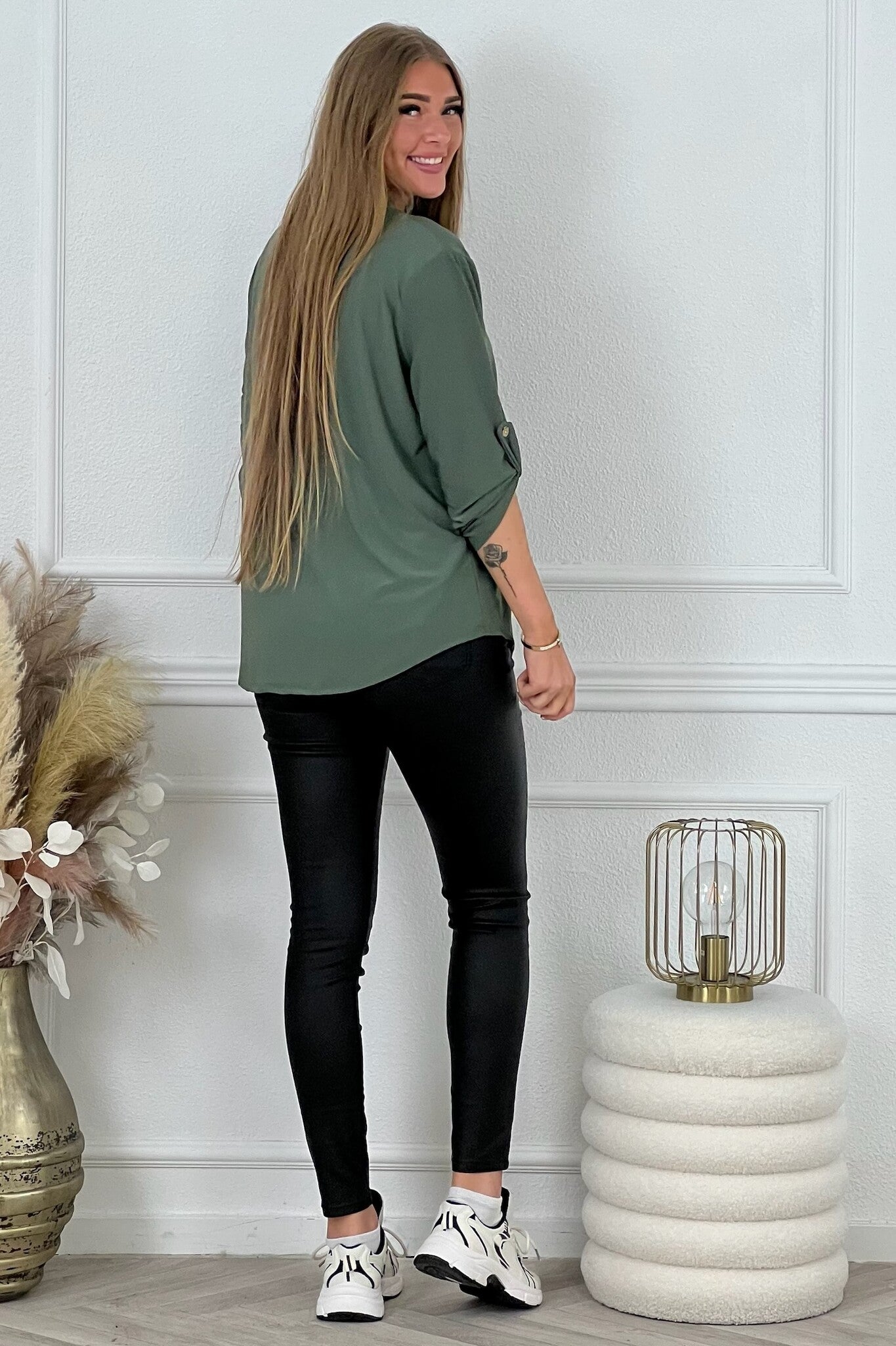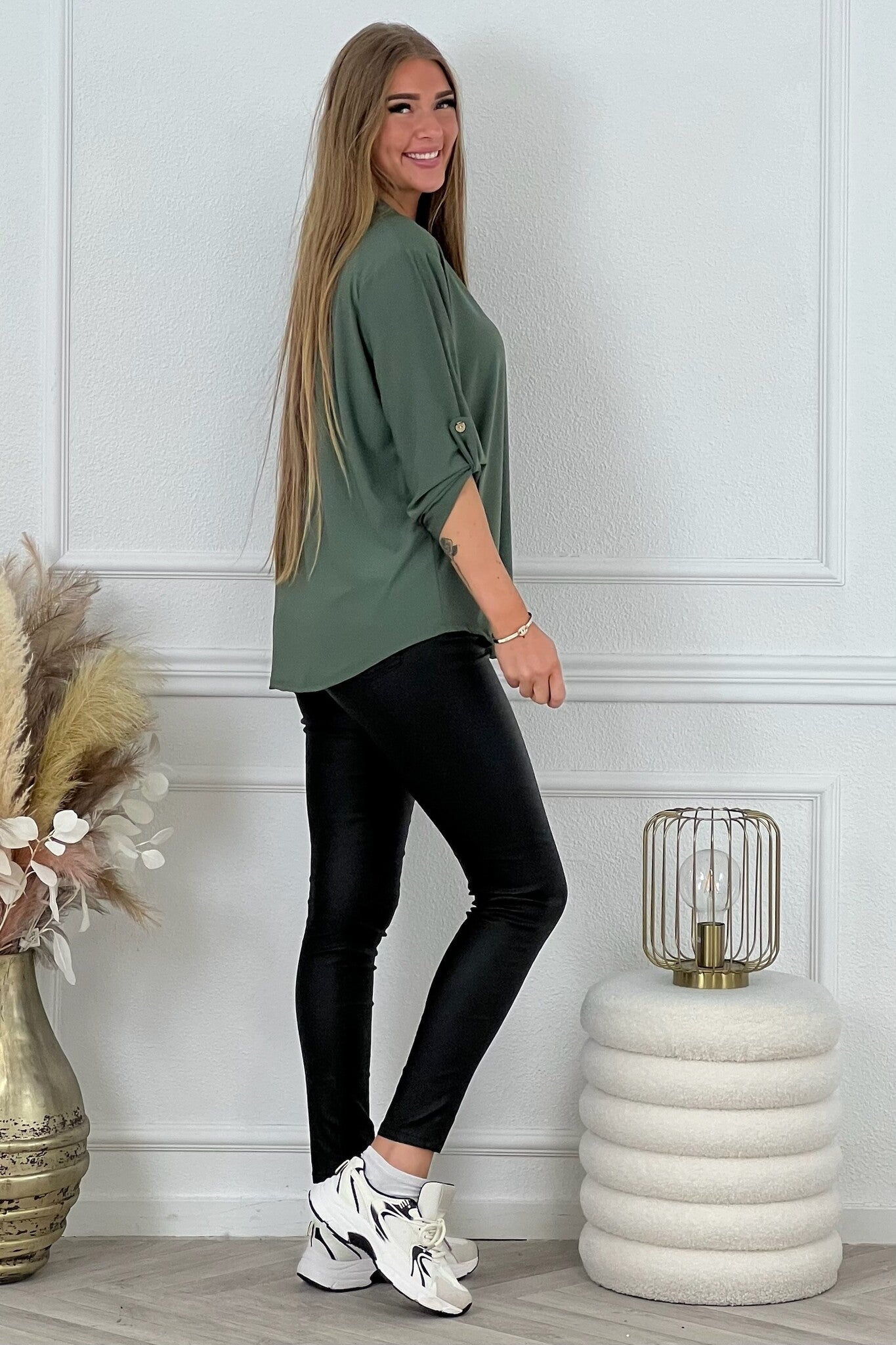 Een mooi blousje met V hals en een opgestroopt mouwtje met knoop! Je shopt ze in diverse kleuren, bijvoorbeeld armygreen!