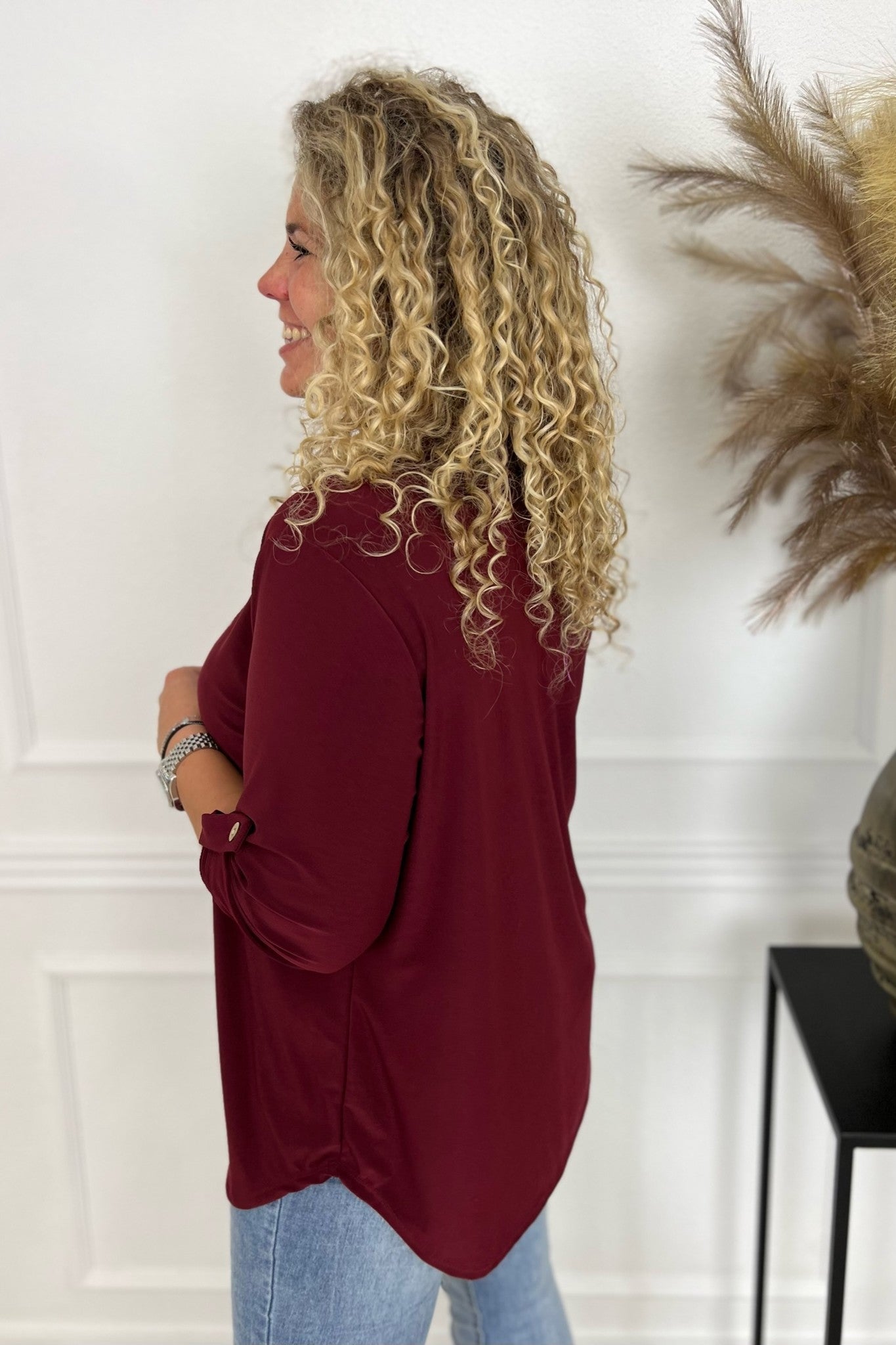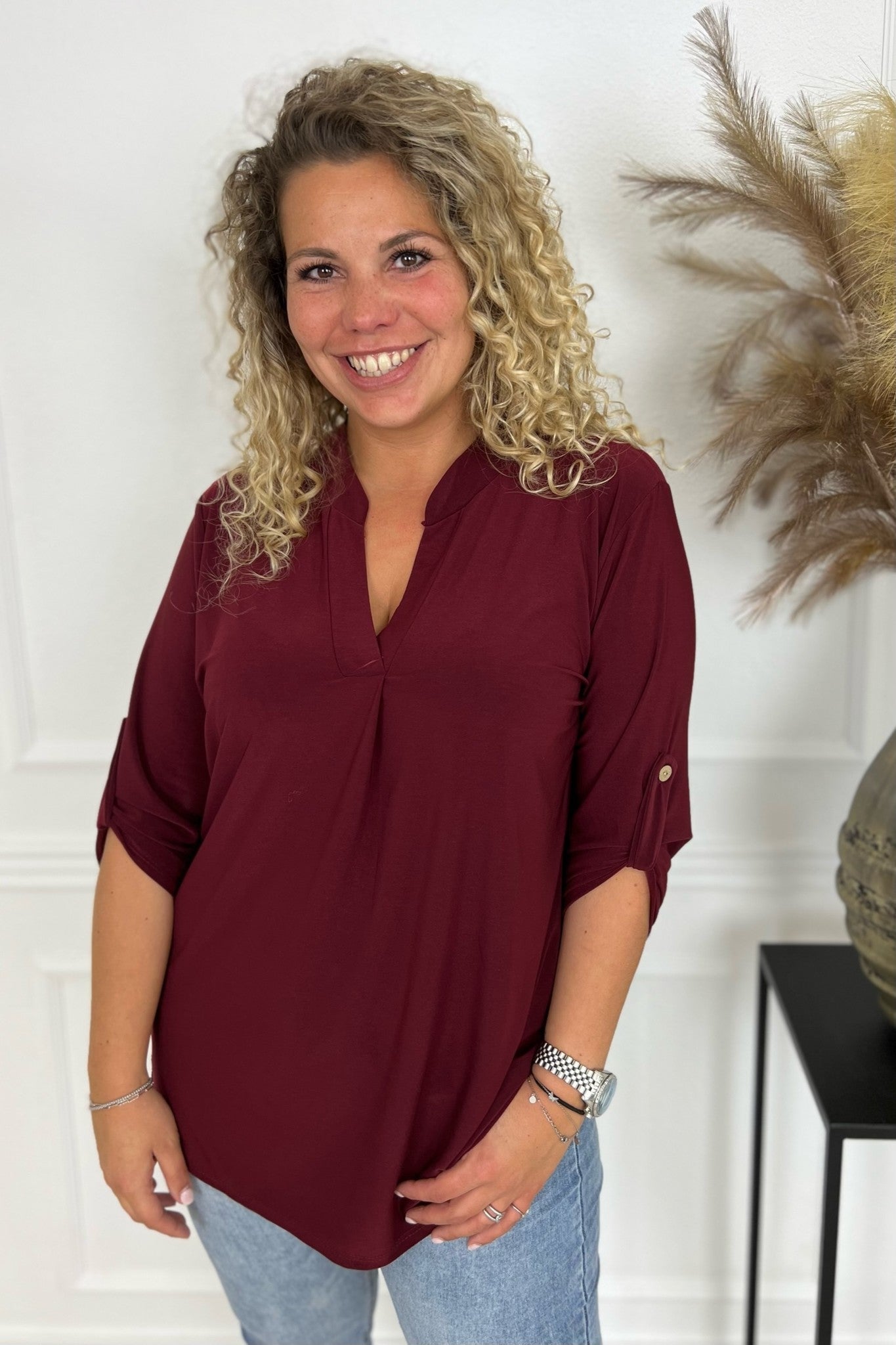 Een mooi blousje met V hals en een opgestroopt mouwtje met knoop! Je shopt ze regular in diverse kleuren, bijvoorbeeld bordeaux!