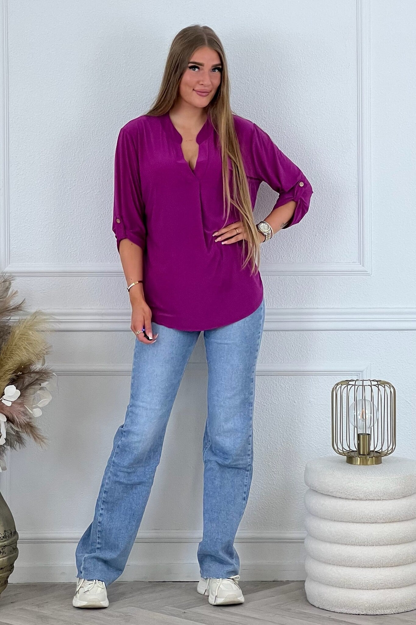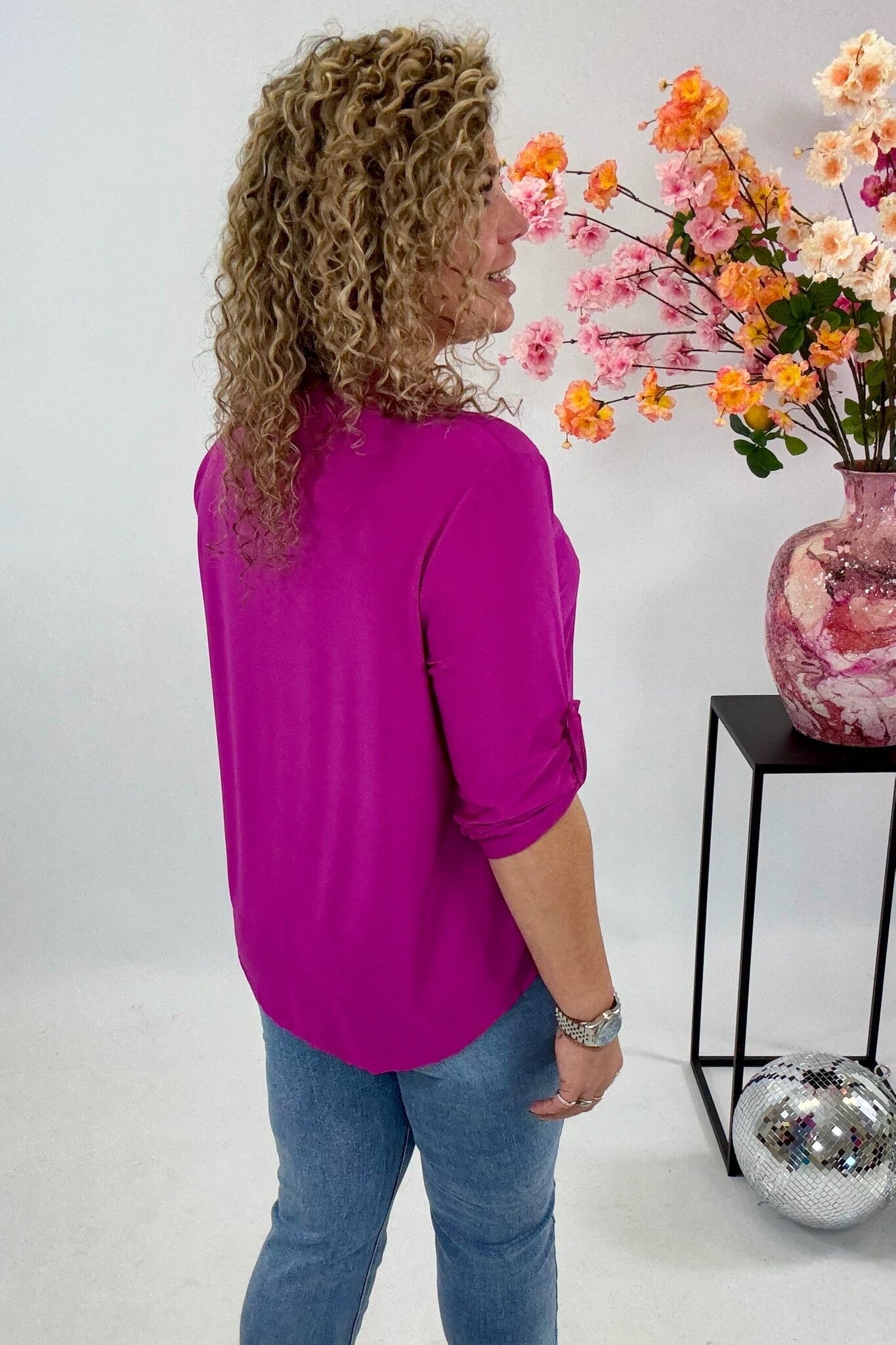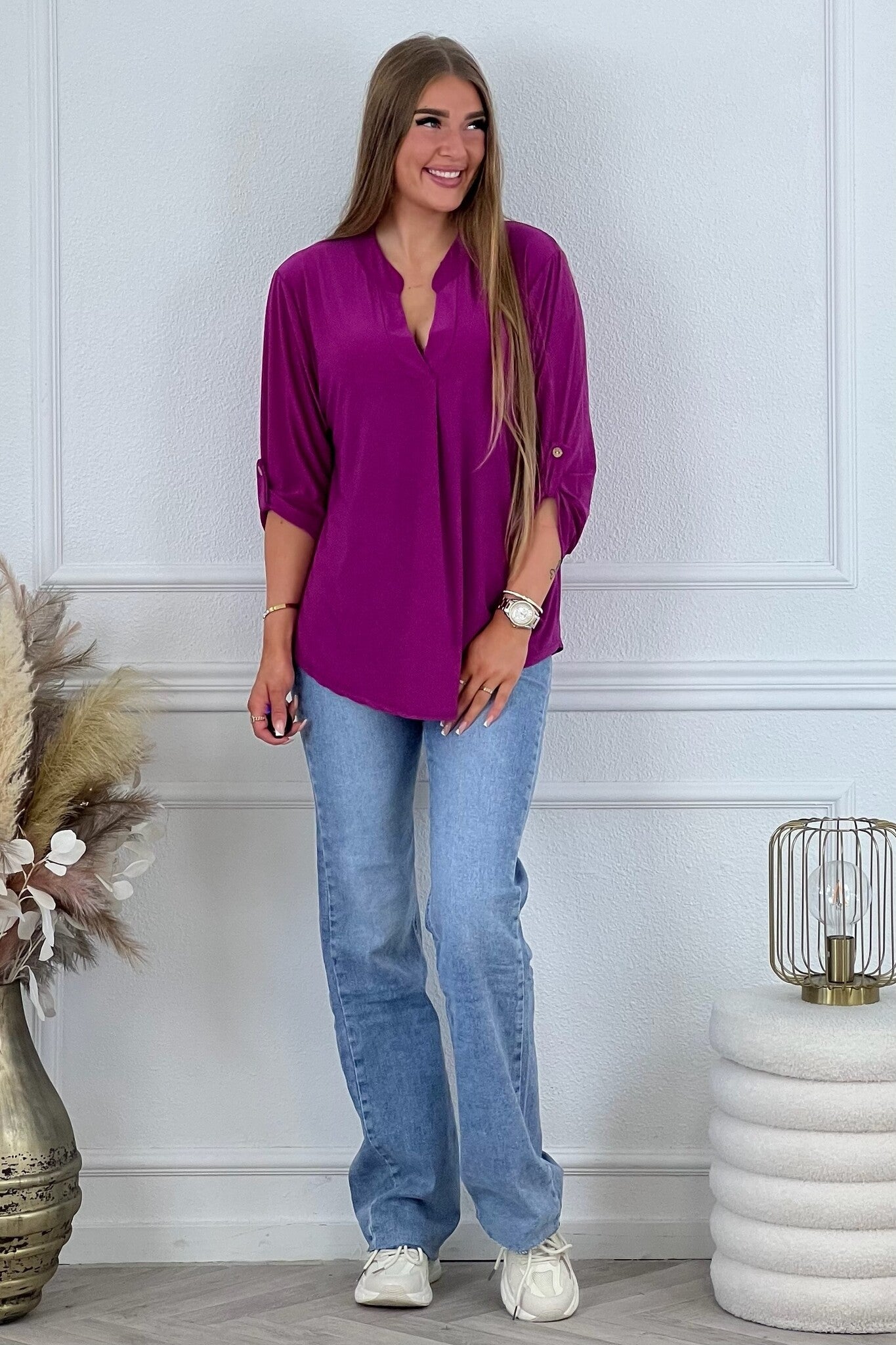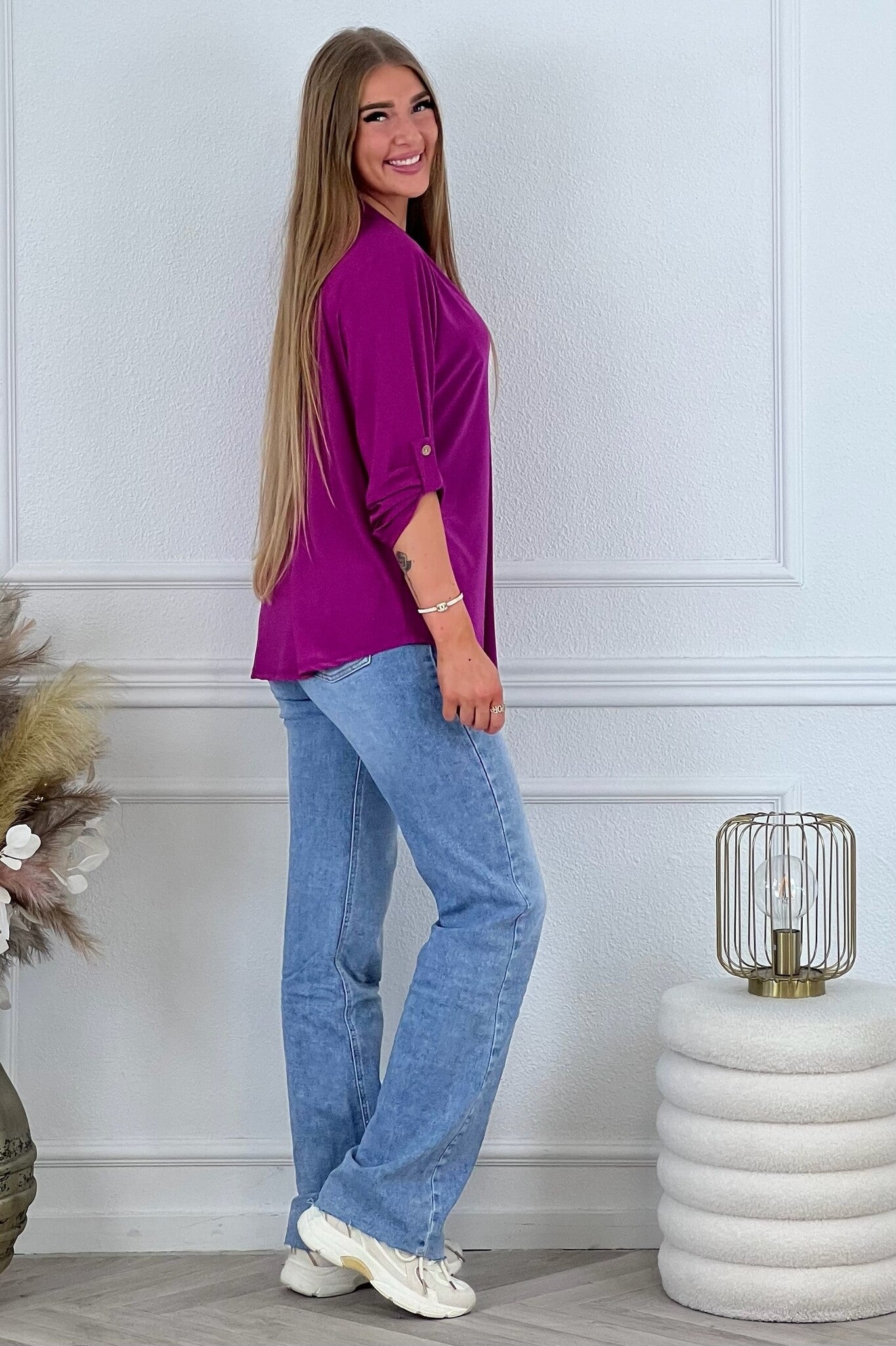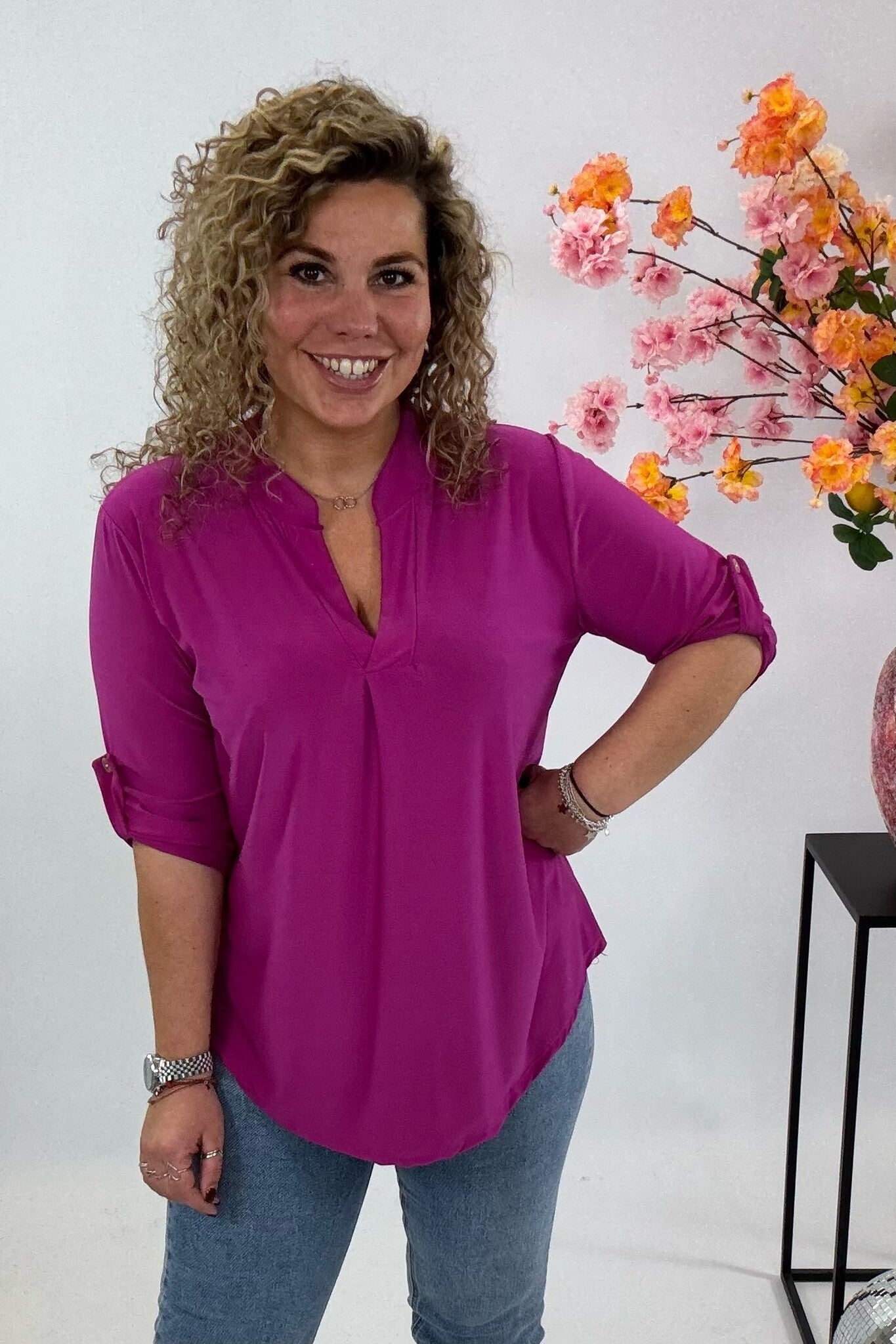 Een mooi blousje met V hals en een opgestroopt mouwtje met knoop! Je shopt ze in diverse kleuren en printjes, bijvoorbeeld magenta!