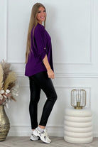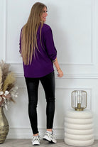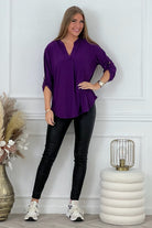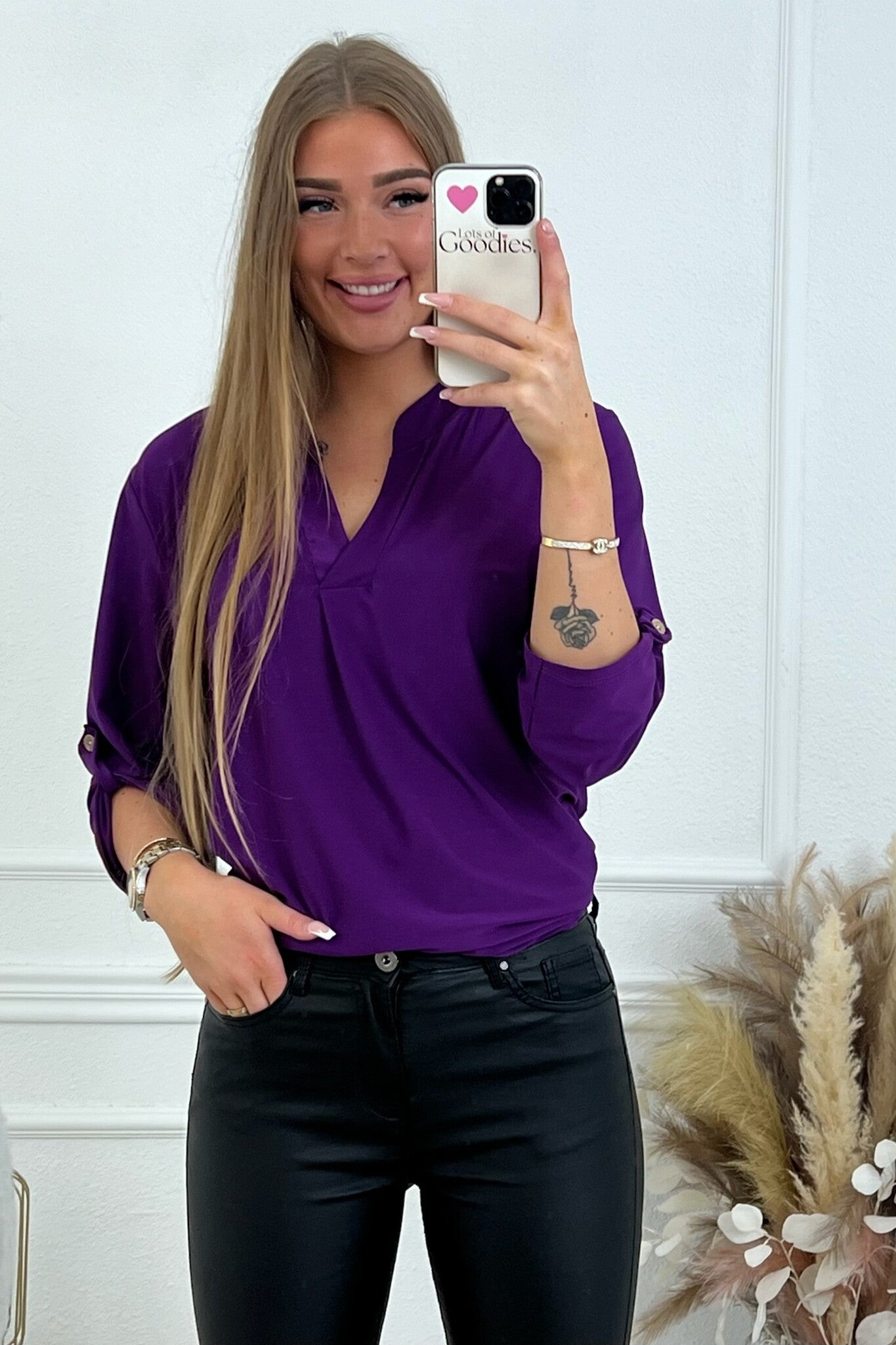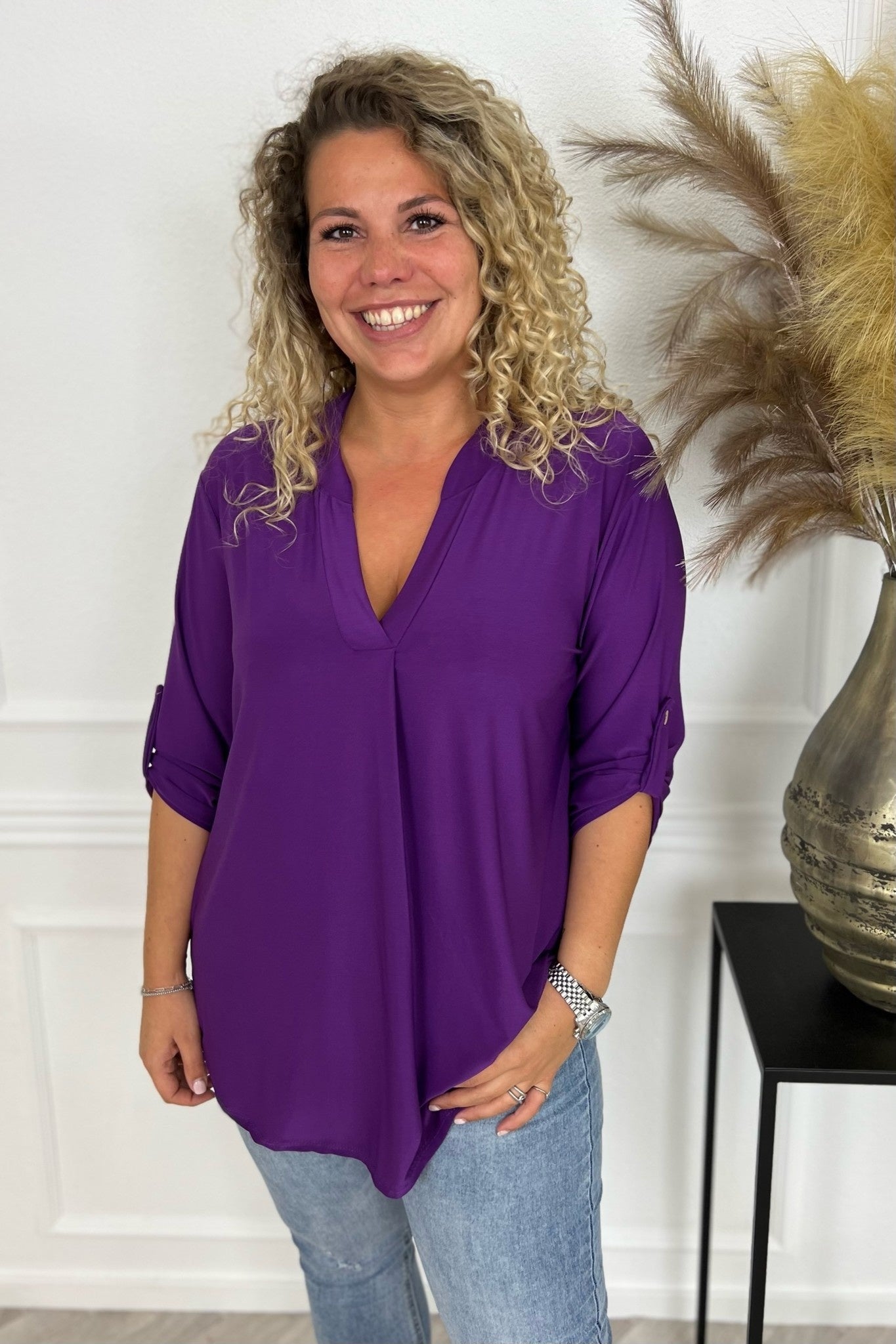 Een mooi blousje met V hals en een opgestroopt mouwtje met knoop! Je shopt ze in diverse kleuren, bijvoorbeeld purple!