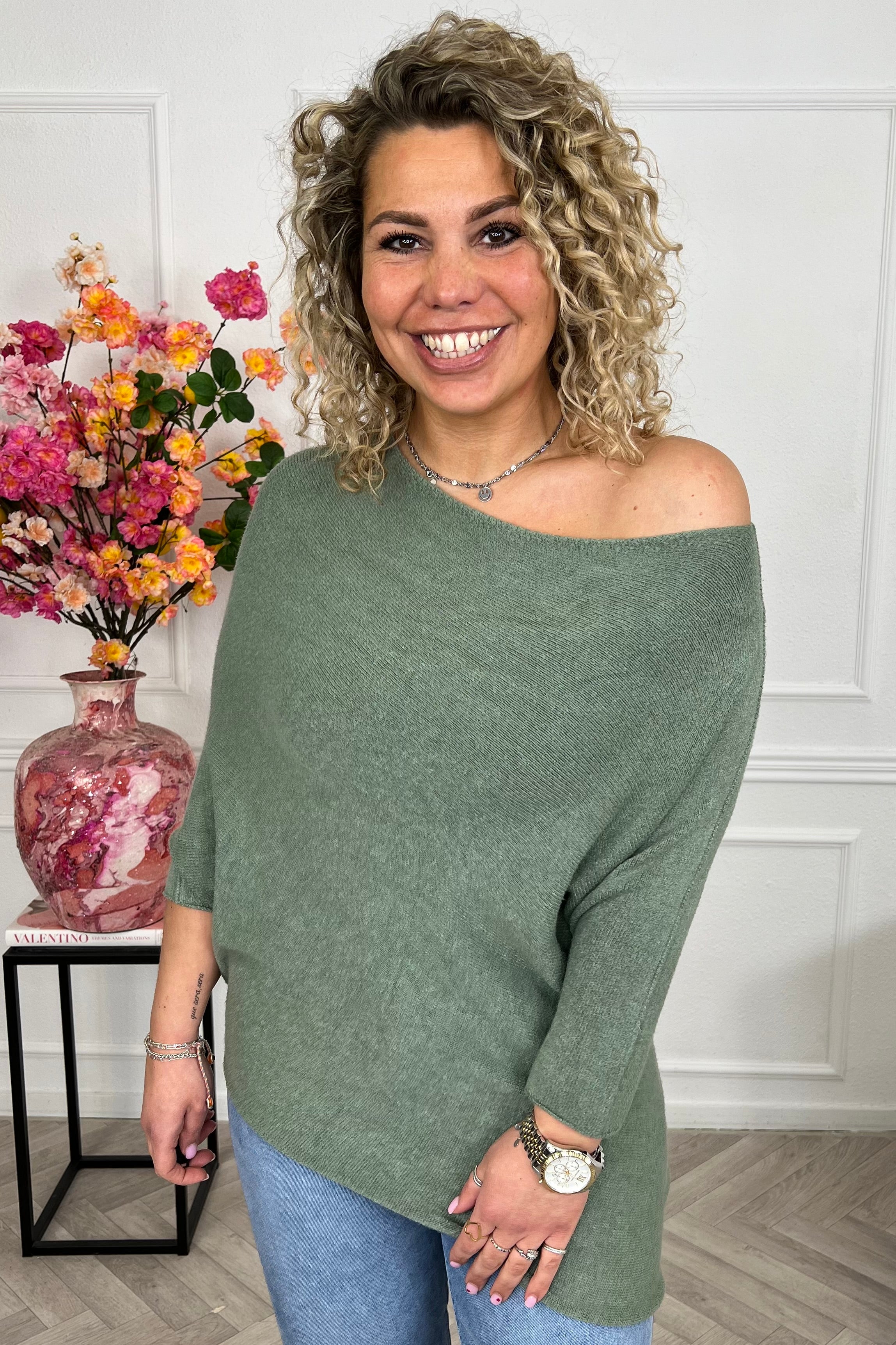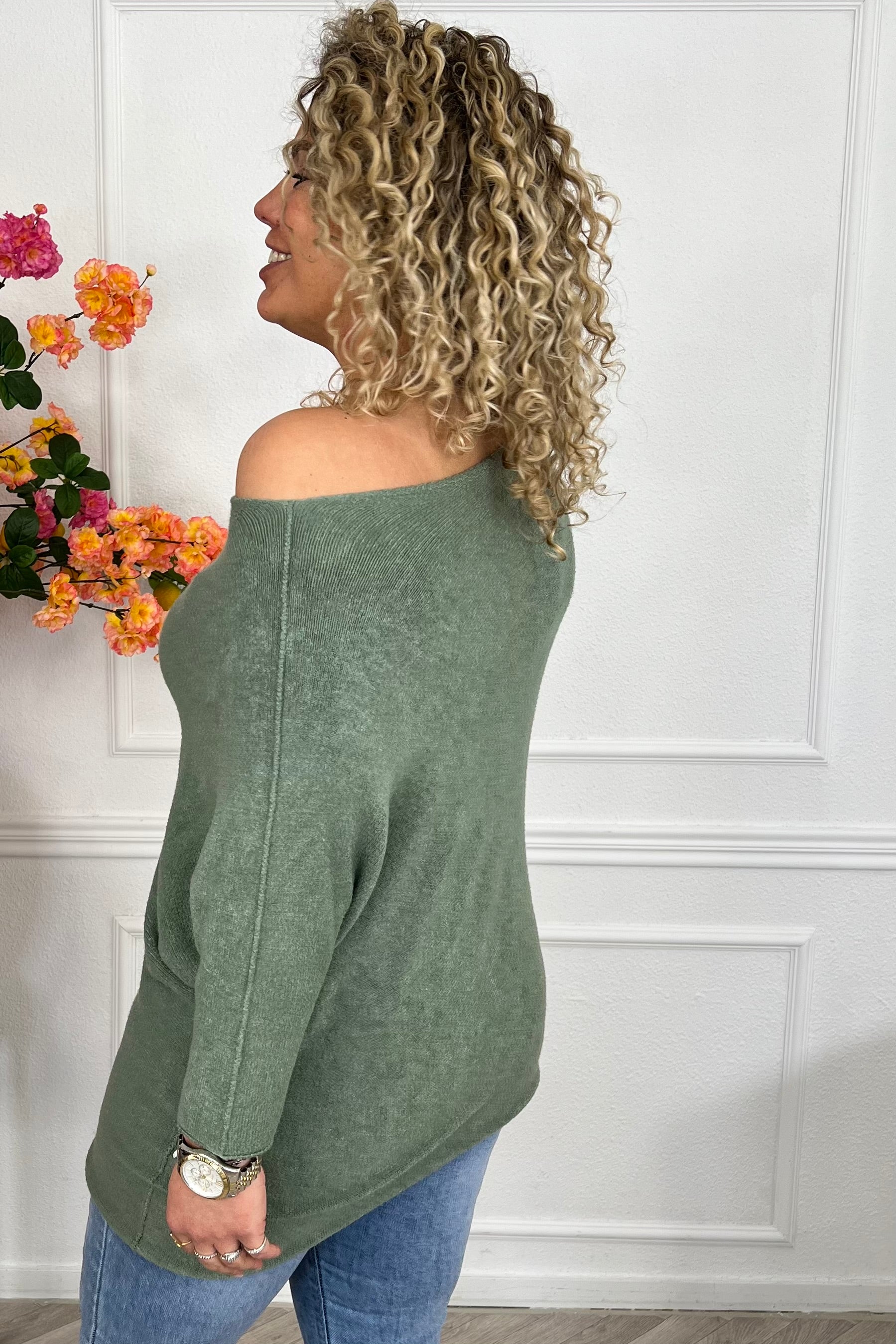 Deze heerlijke sweater draag je off shoulder en zit perfect! Shop hem nu in armygreen!