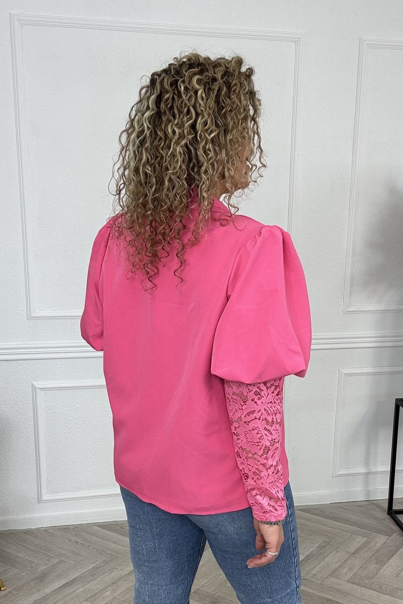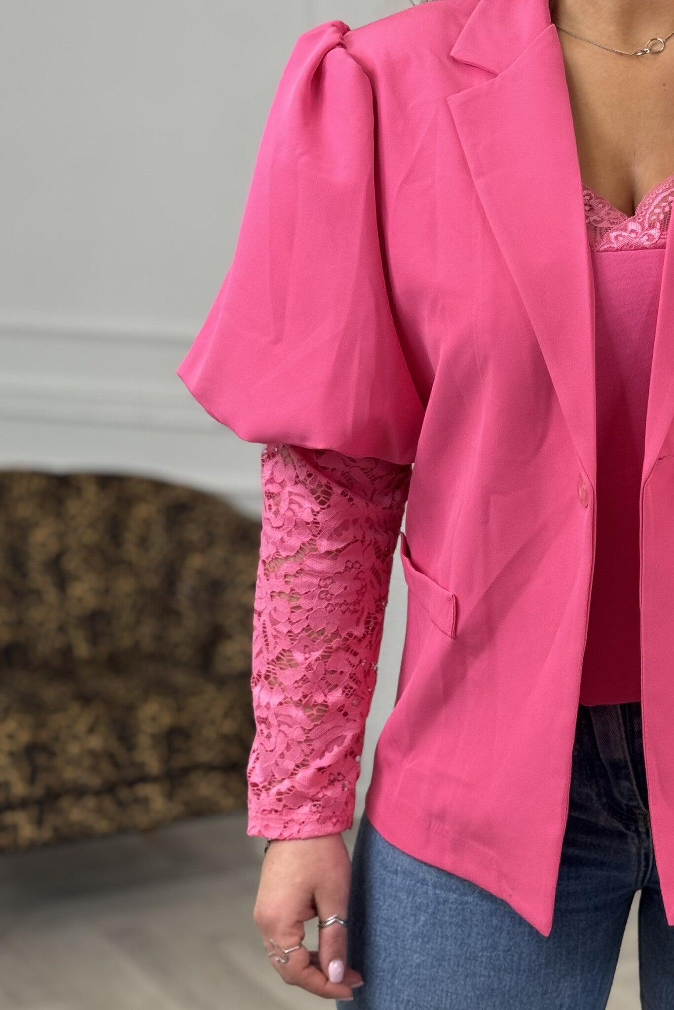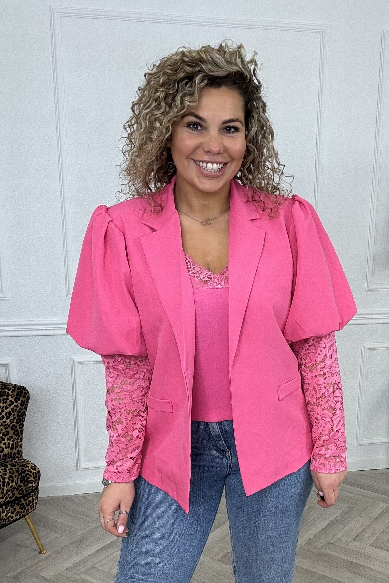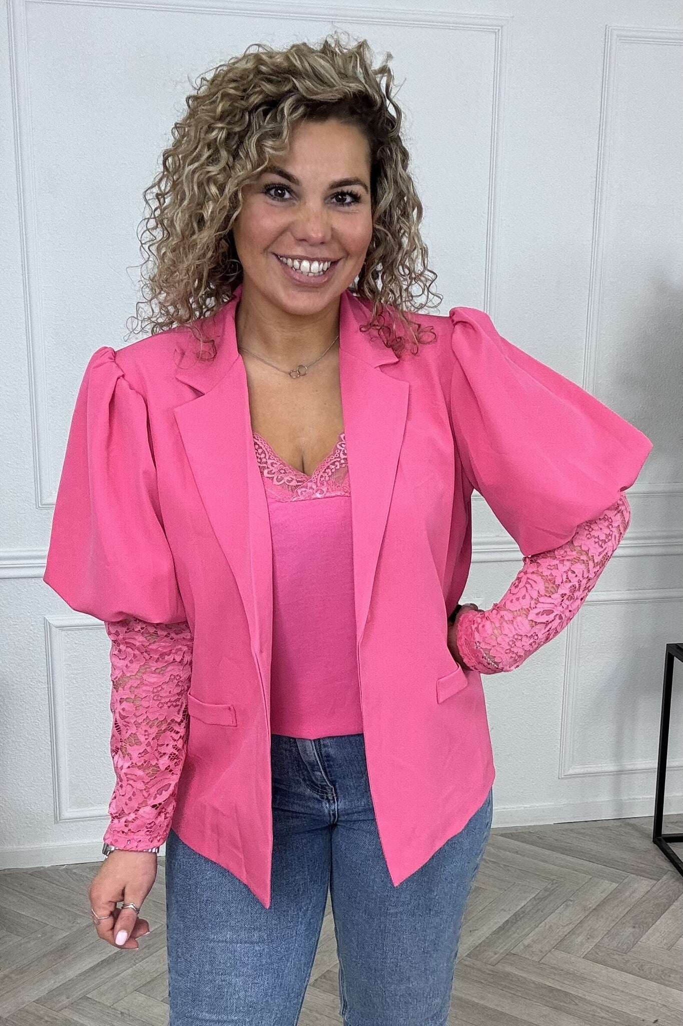 Deze prachtige blazer heeft hele leuke ballonmouwtjes en prachtige kanten mouwen. Shop hem in fuchsia!