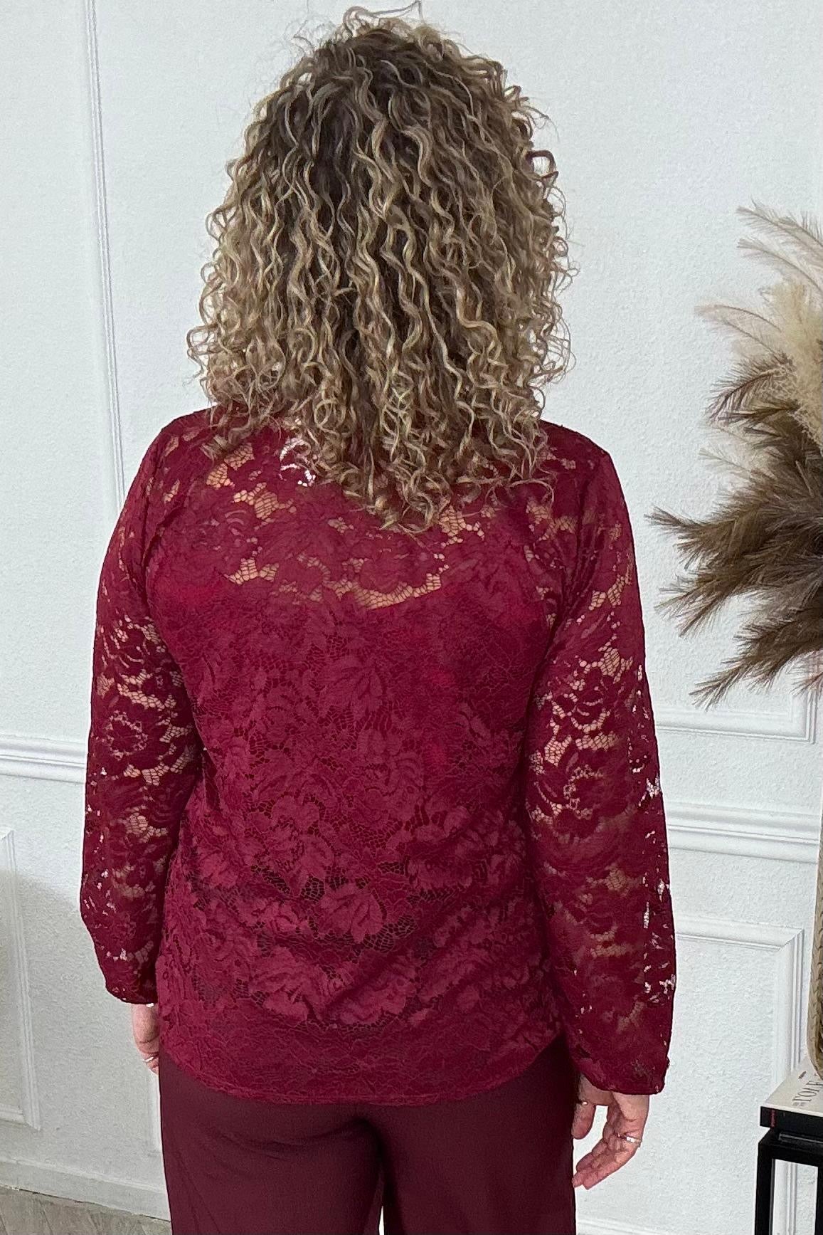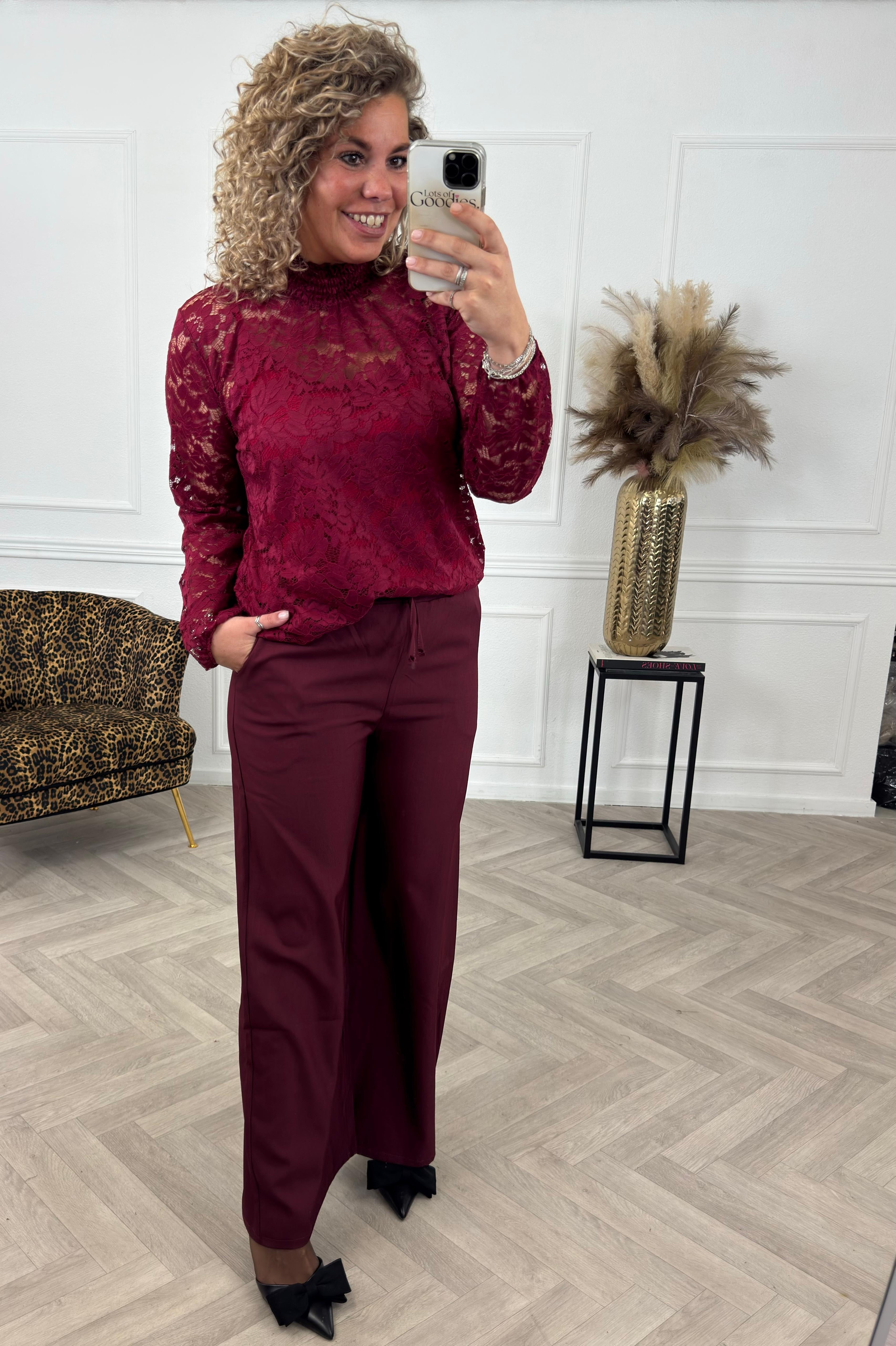 Een enige top! Er zit elastiek in de coll waardoor de top mooi aansluit. Ook is het inclusief de onder top! Shop de perfect lace coll top daarom nu snel in bordeaux!