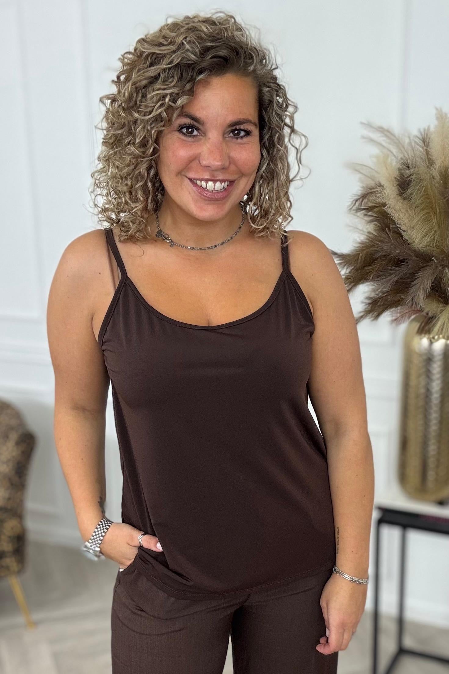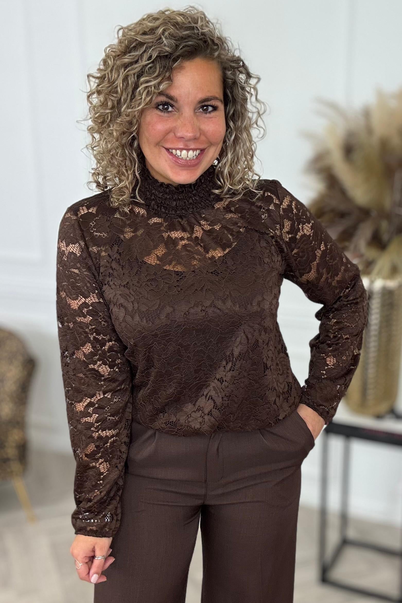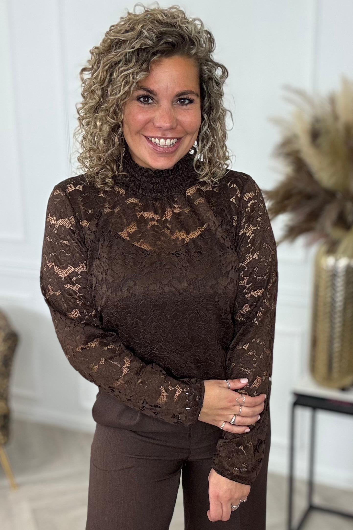 Een enige top! Er zit elastiek in de coll waardoor de top mooi aansluit. Ook is het inclusief de onder top! Shop de perfect lace coll top daarom nu snel in brown!