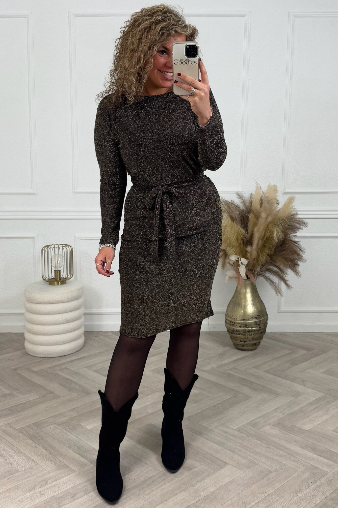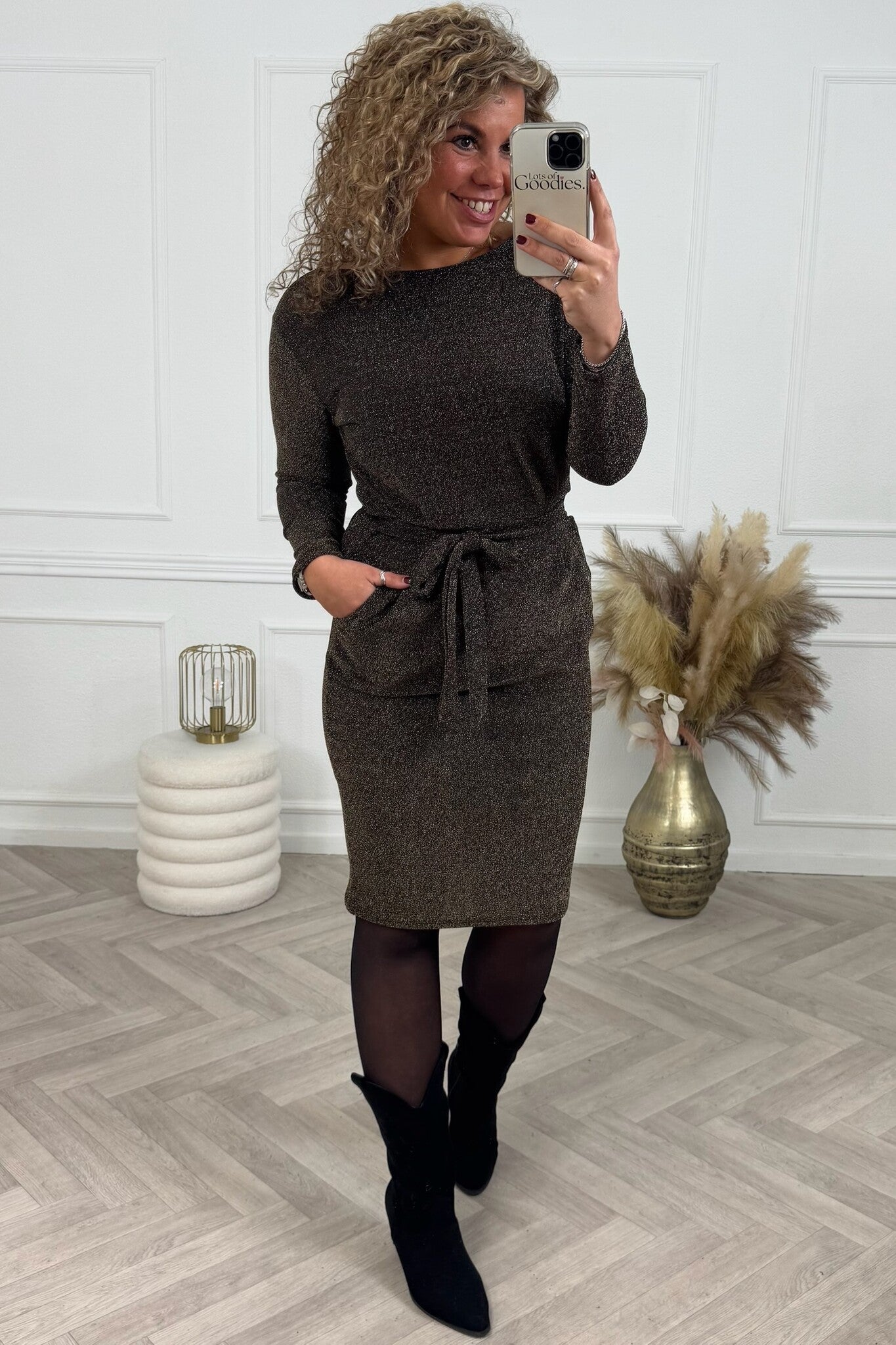 Deze jurk is het helemaal! Onze bestseller: de perfect basic dress, maar dan in een mooie bow sparkle! Shop hem online in gold!