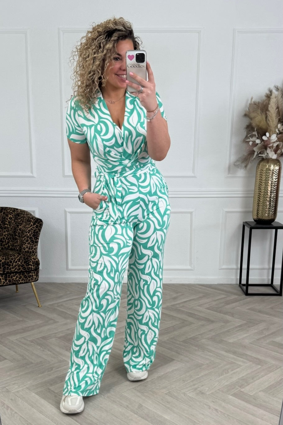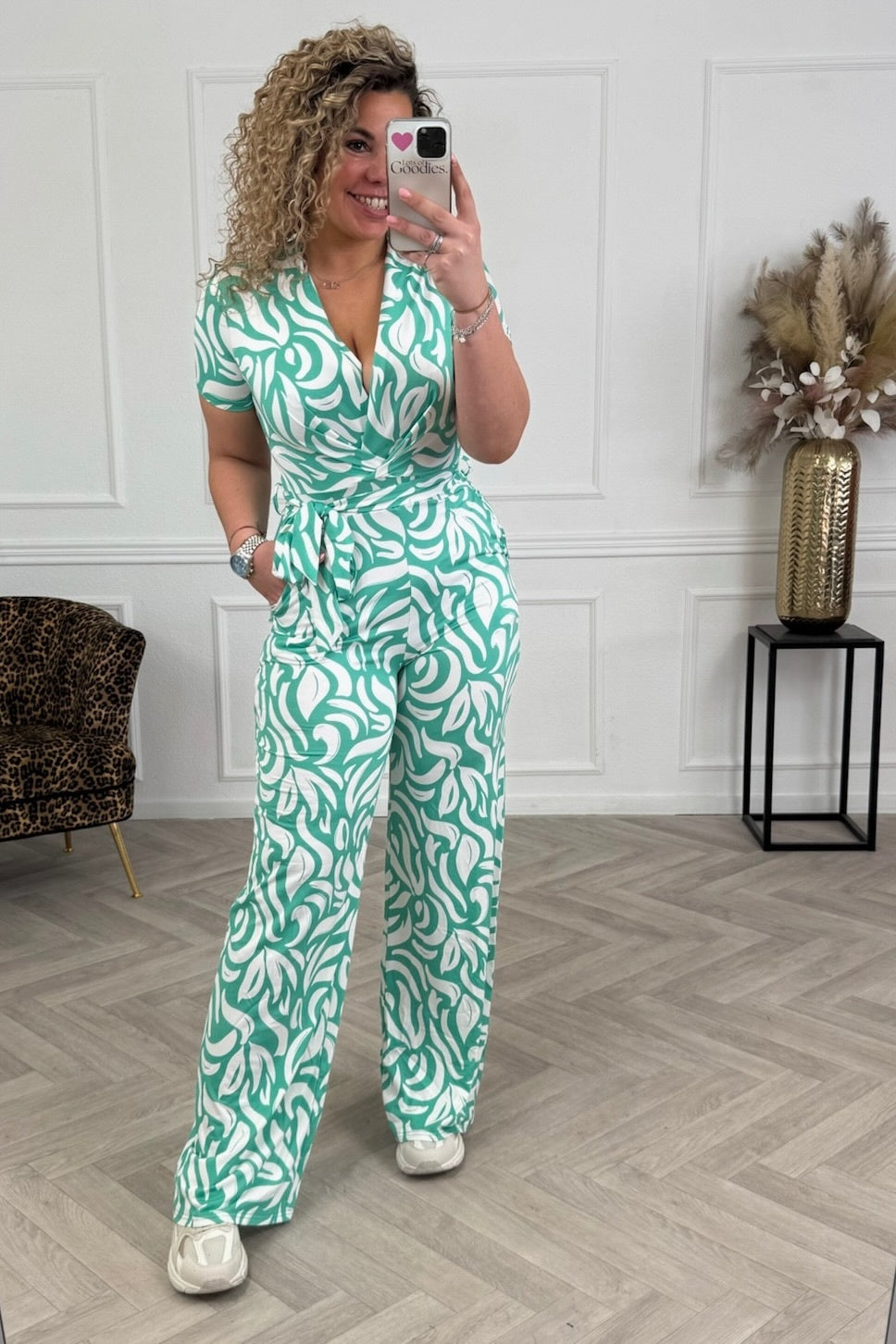 Een mooie jumpsuit met korte mouwtjes en een print van bloembladjes, met een leuke koordje om de taille! Shop hem in green!