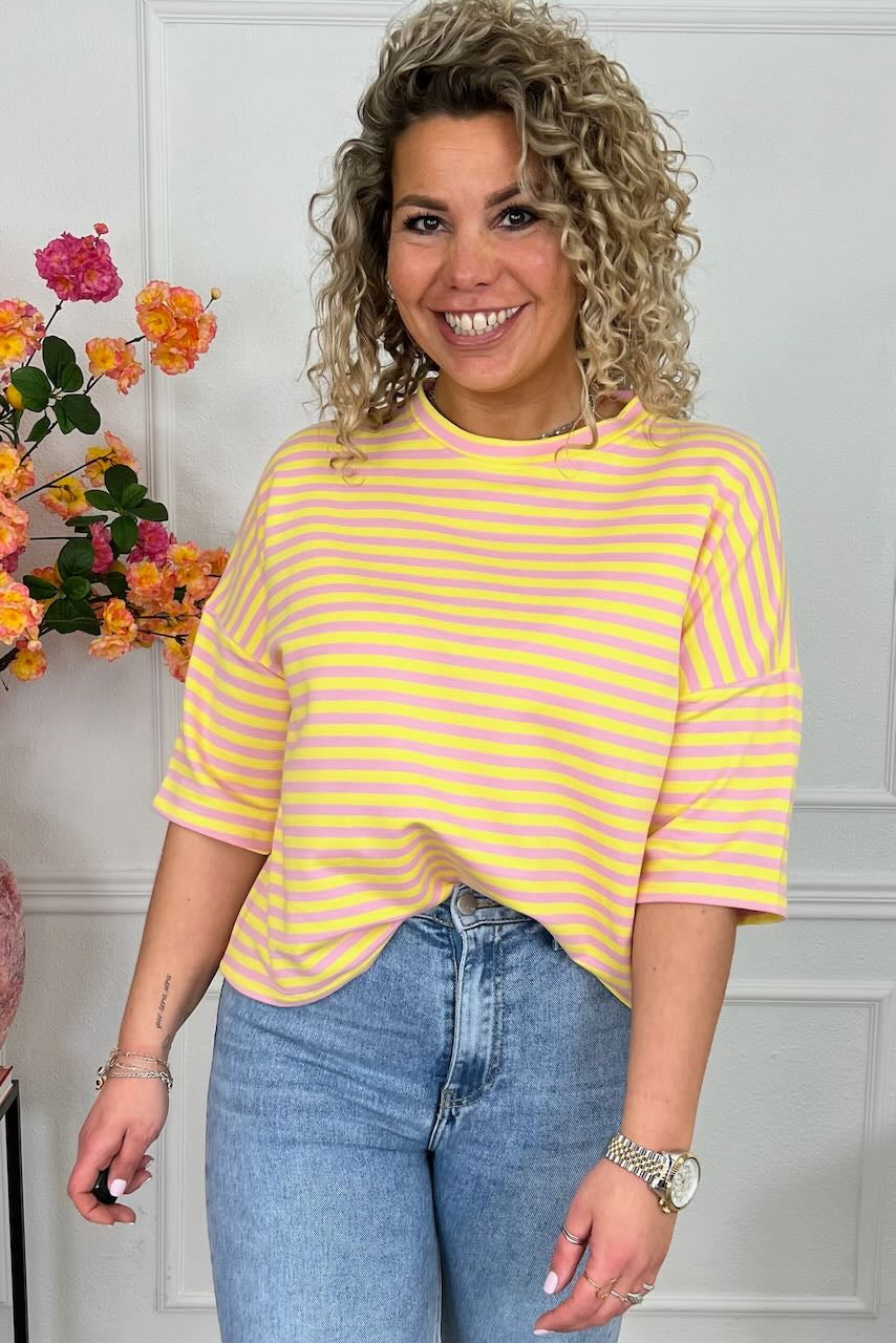 Deze prachtige gestreepte sweater met korte mouwen zit heerlijk en is helemaal on trend! Combineer hem met een leuke jeans! Shop hem in light pink/yellow!