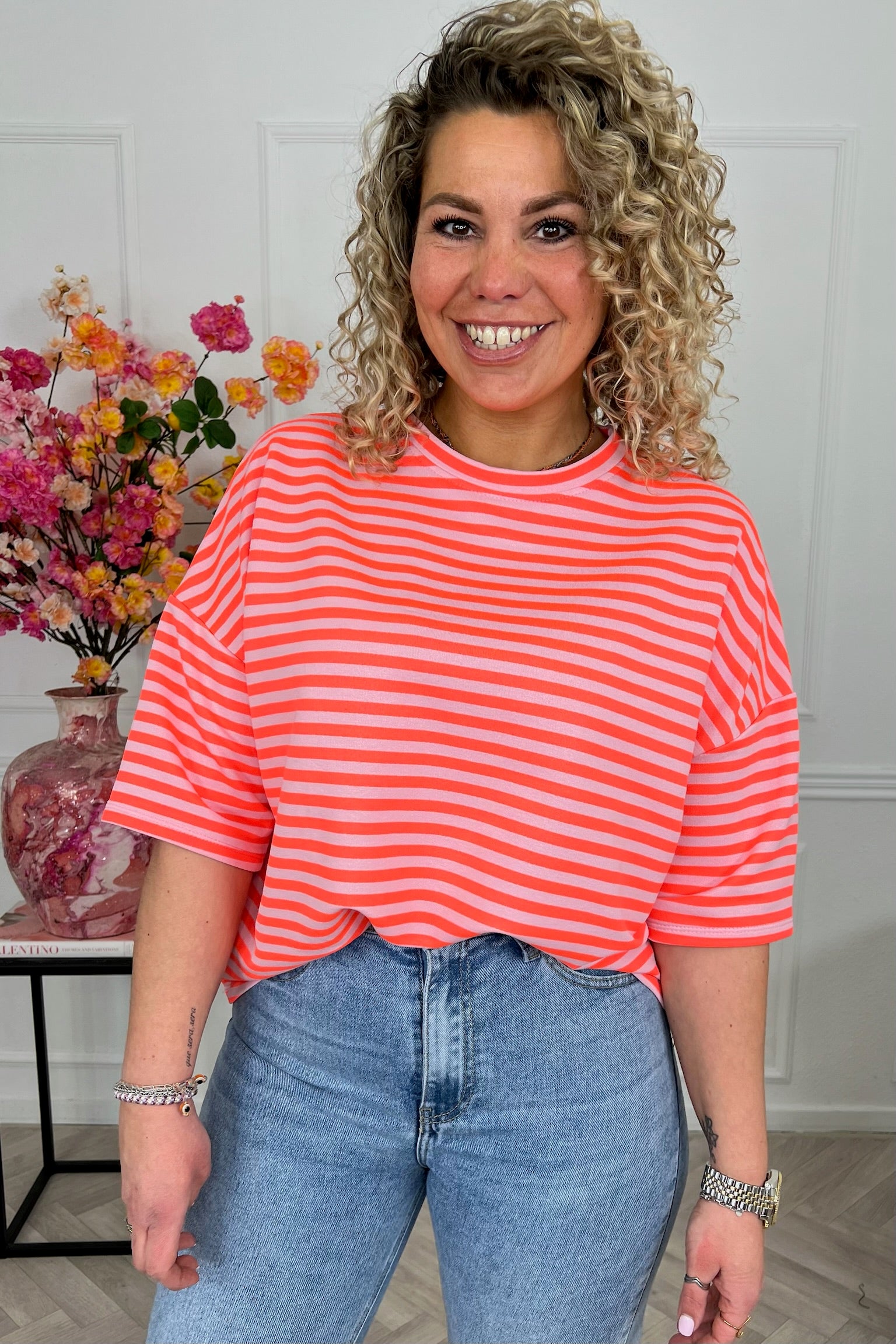 Deze prachtige gestreepte sweater met korte mouwen zit heerlijk en is helemaal on trend! Combineer hem met een leuke jeans! Shop hem in Orange/Light Pink!