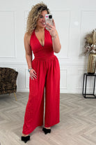 Een mooie jumpsuit zonder mouwen met een elastiek om de taille en wijde broekspijpen! Shop hem in red!