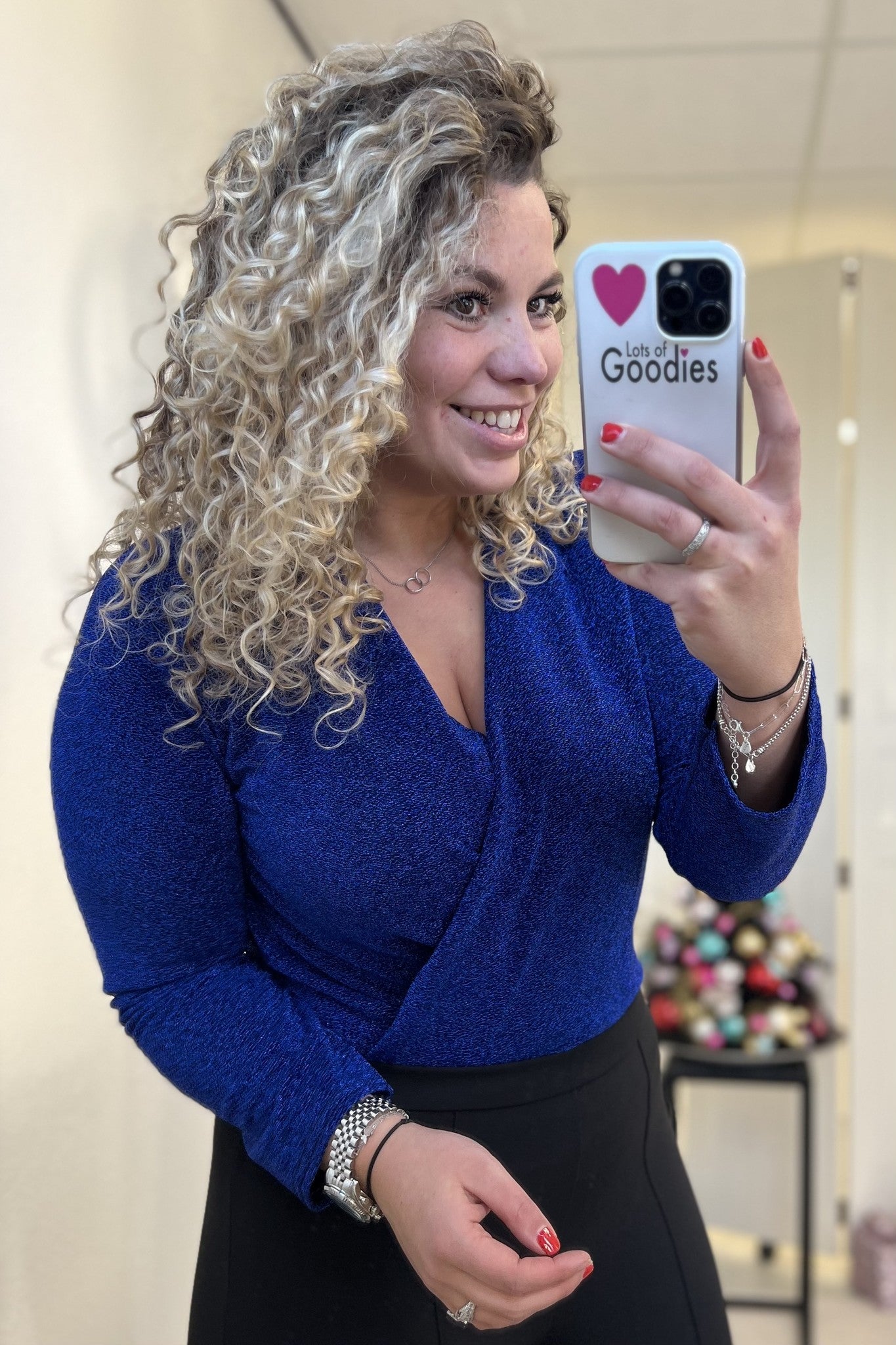 We hebben nu geweldige body met glitter, nooit meer je top uit je rok of broek! Shop hem in kobalt!