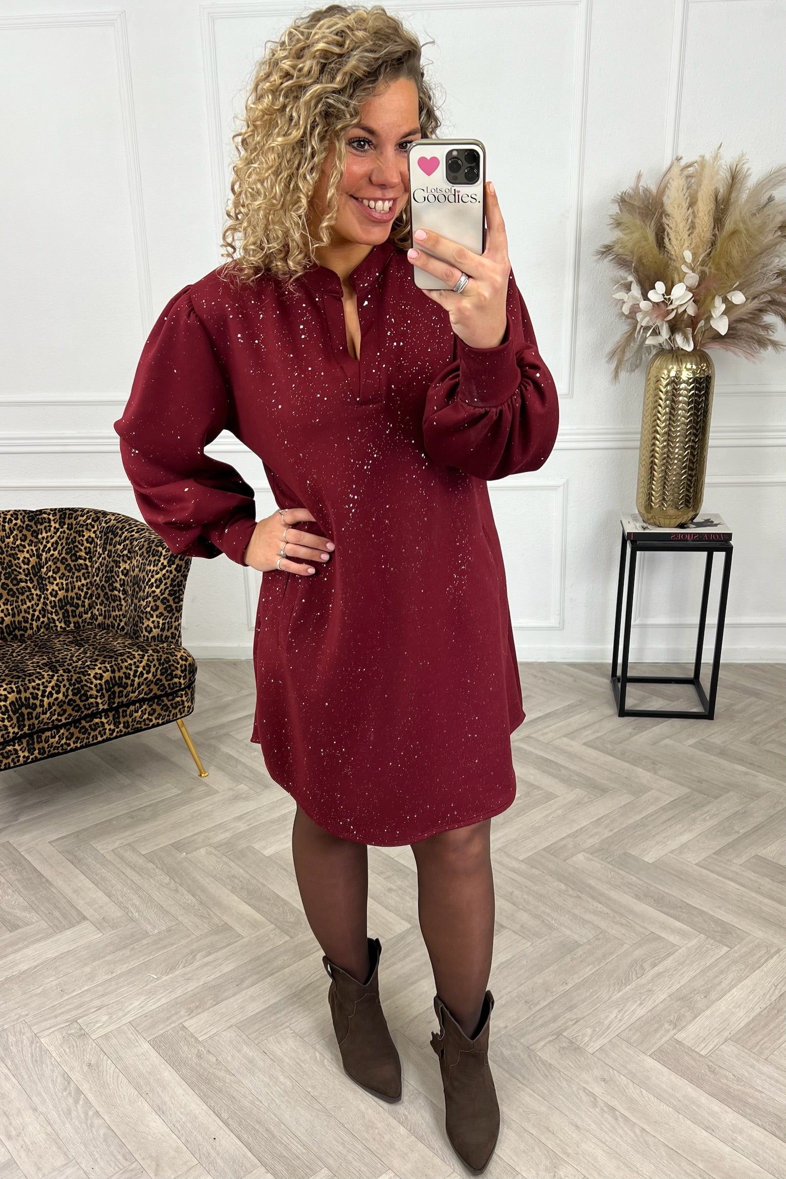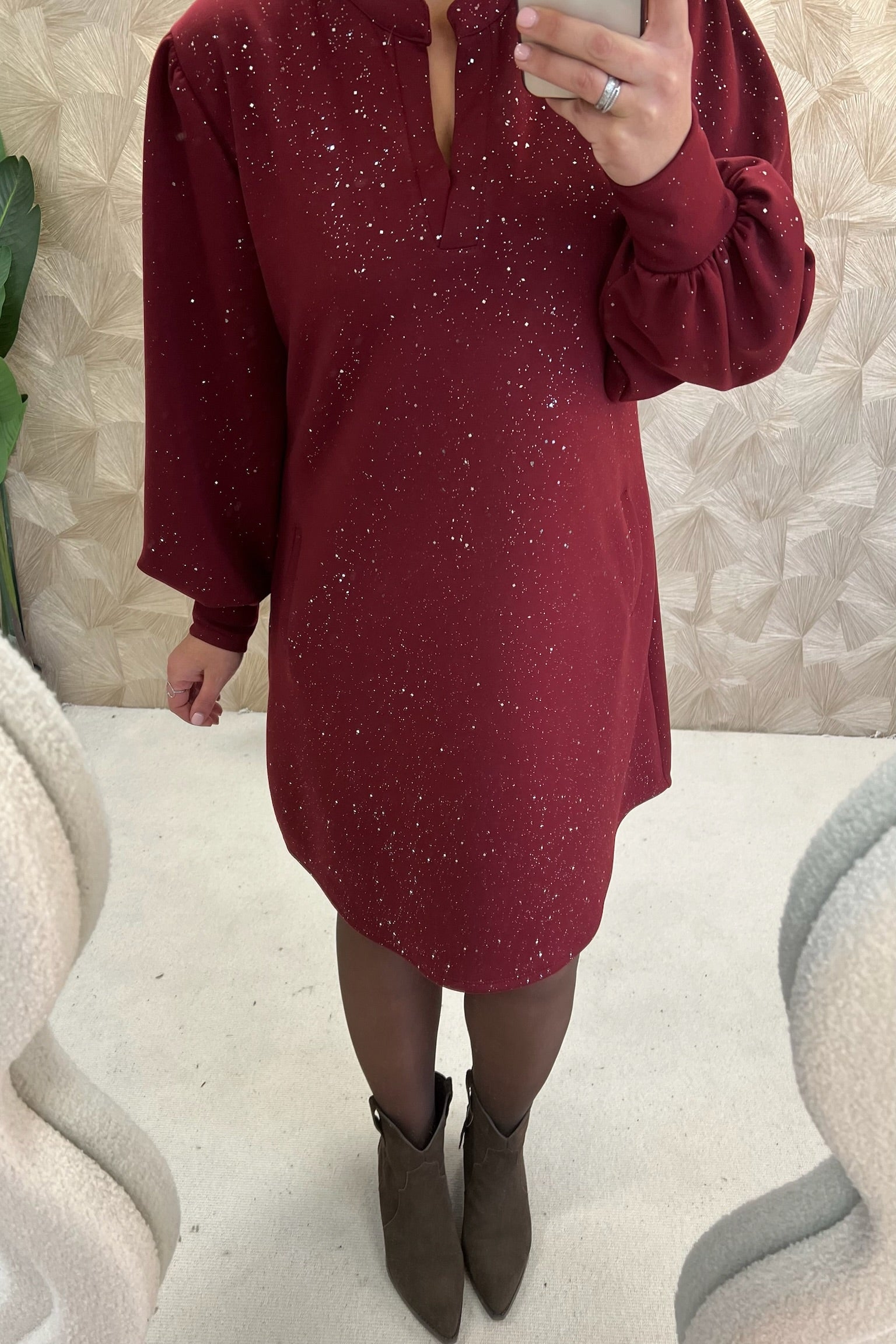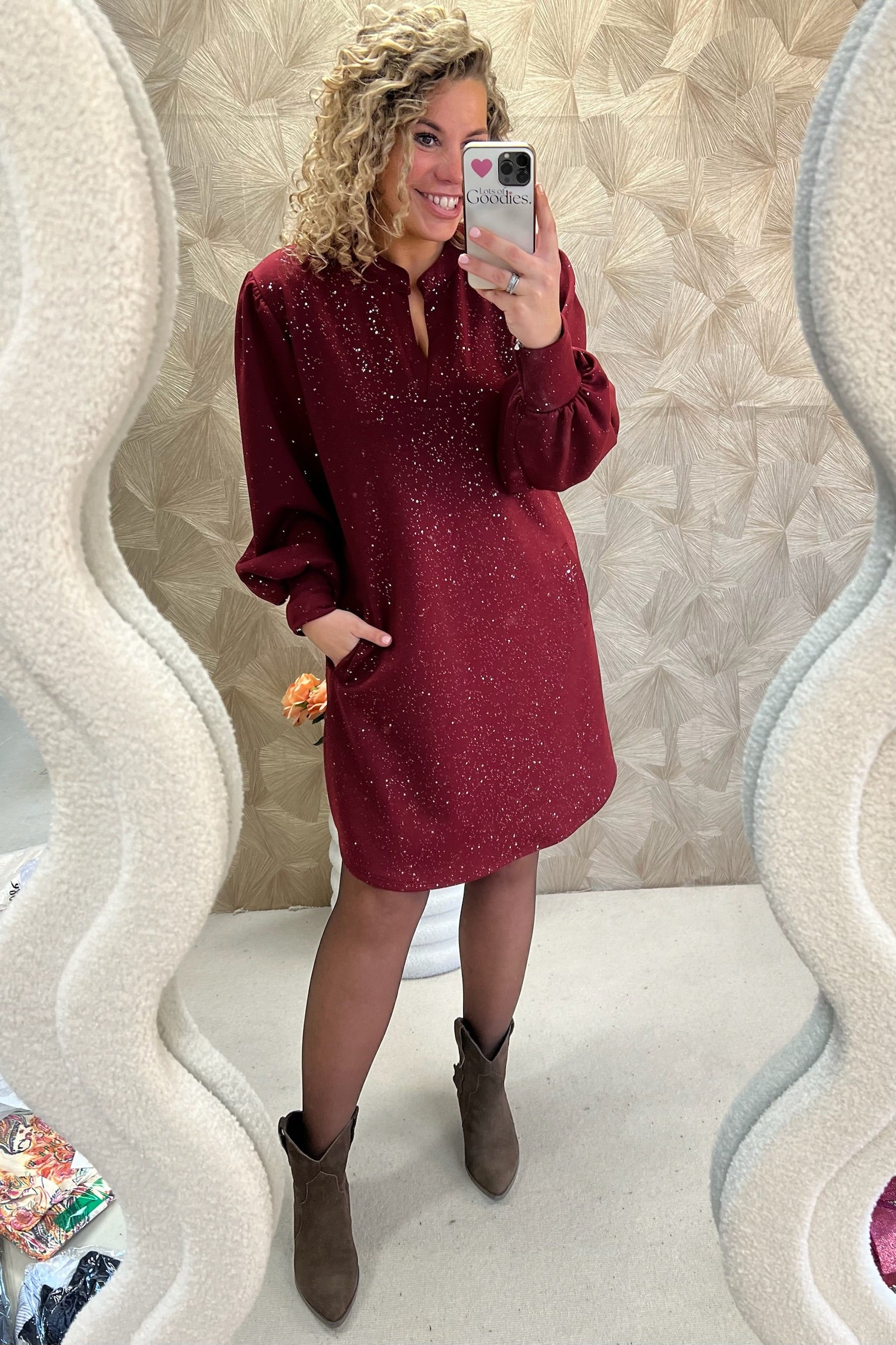 Deze jurk is het helemaal! Onze bestseller: de perfect basic dress, maar dan in een mooie v-hals sparkle met zakken! Shop hem online in bordeaux!
