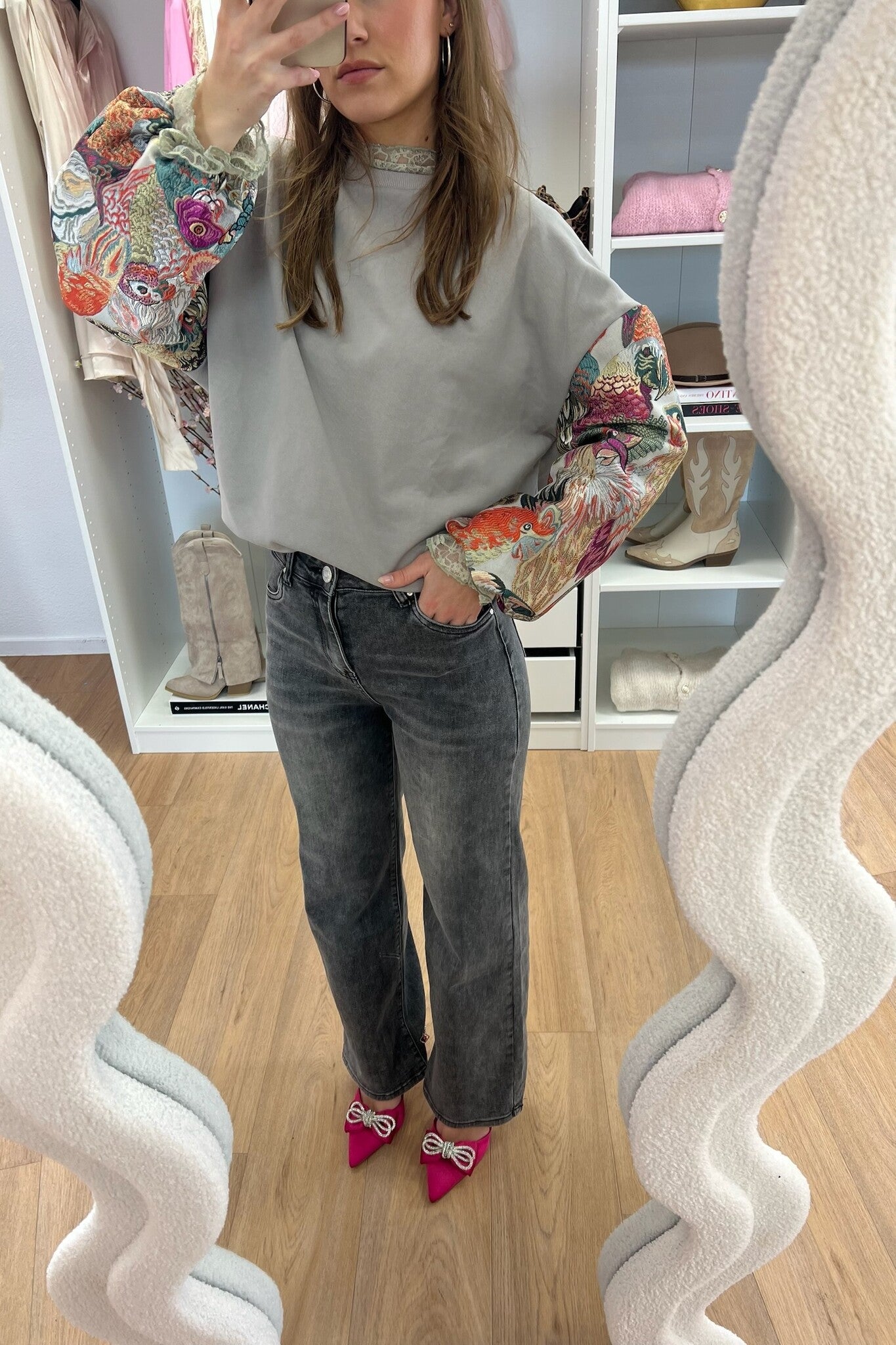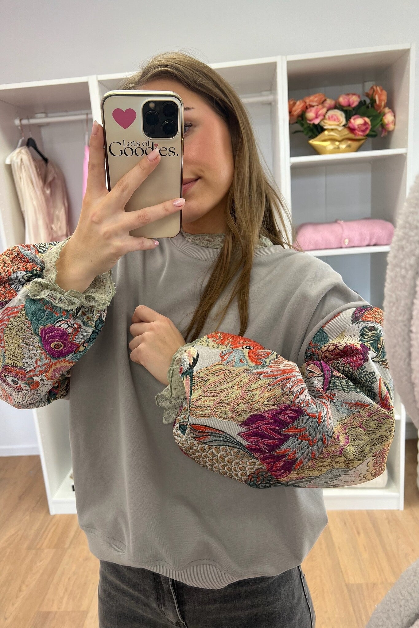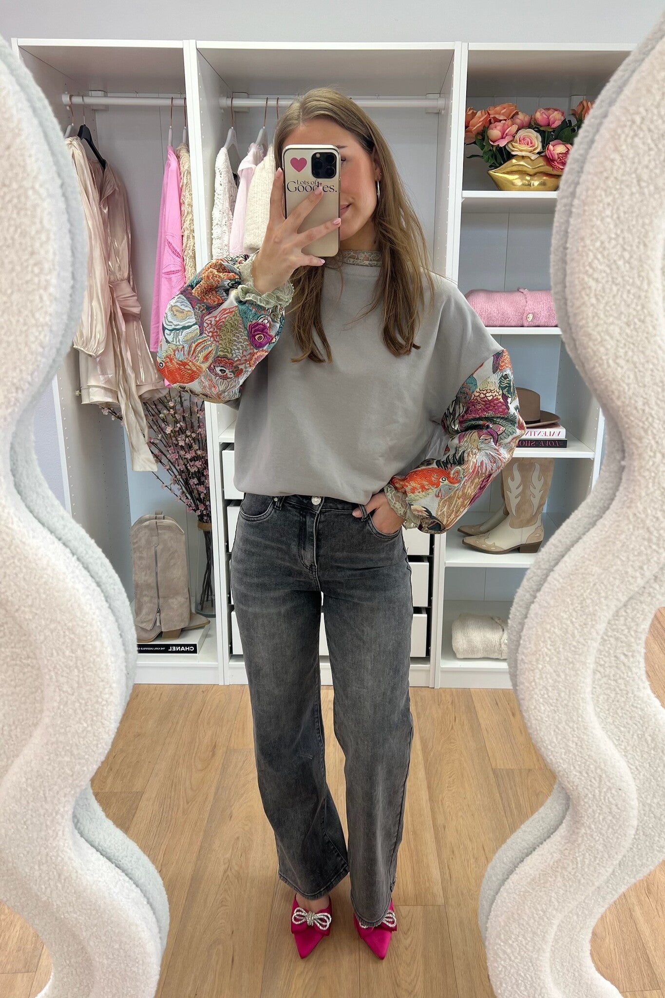 Deze leuke sweater met mooie print op de mouwen is een echte eyecatcher! Shop hem nu in Grey!