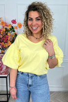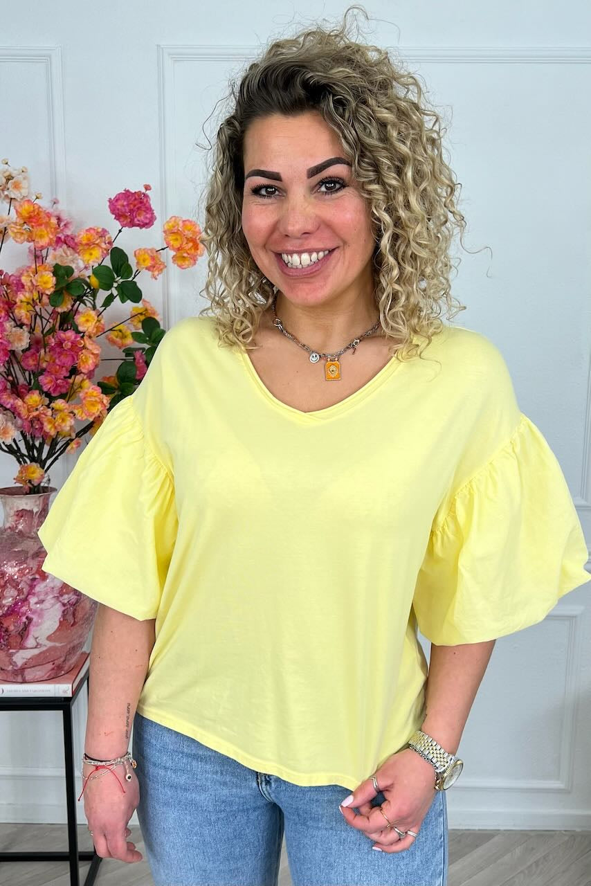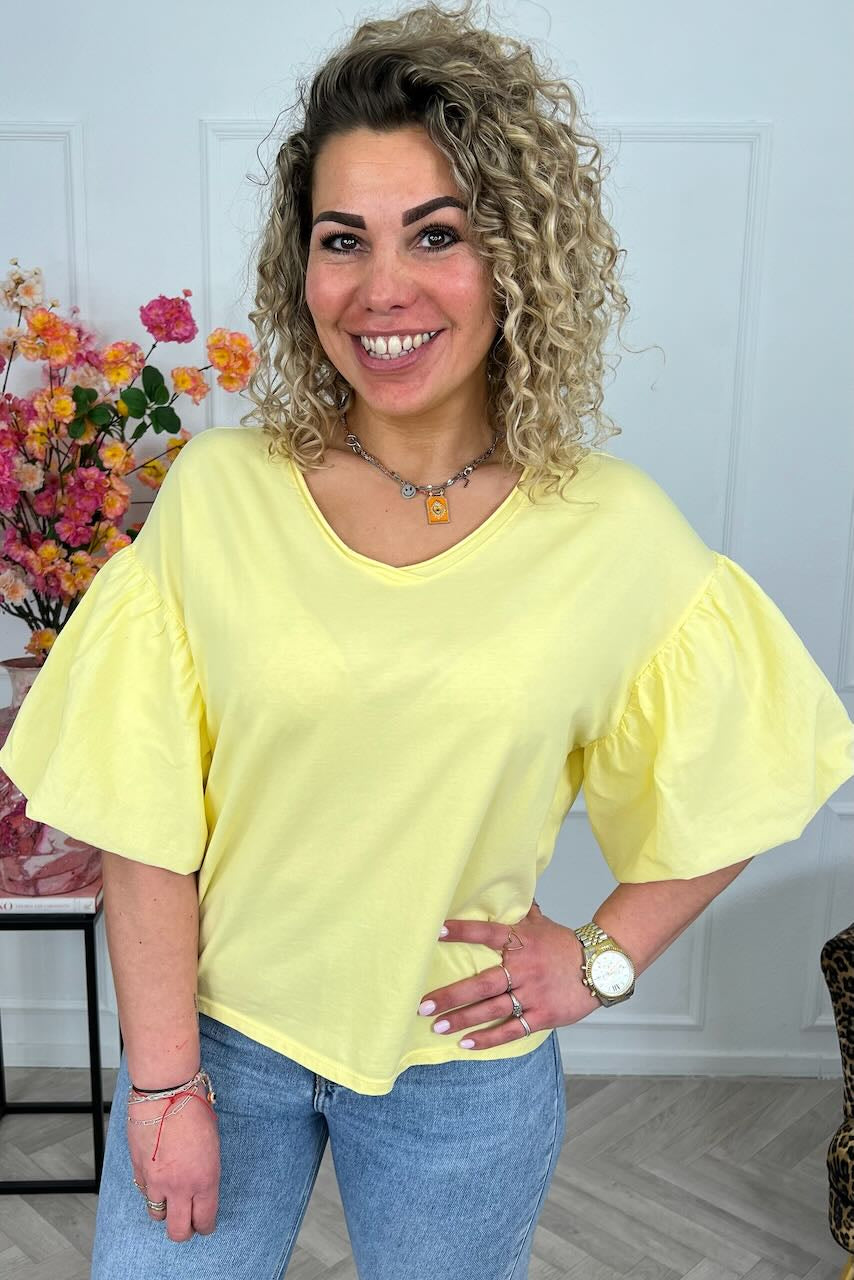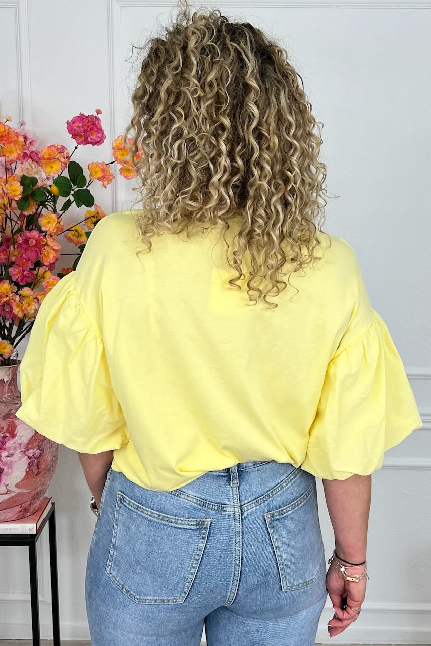 Dit fijne shirt heeft prachtige korte puffy mouwtjes en zit heerlijke! Shop hem nu in yellow!