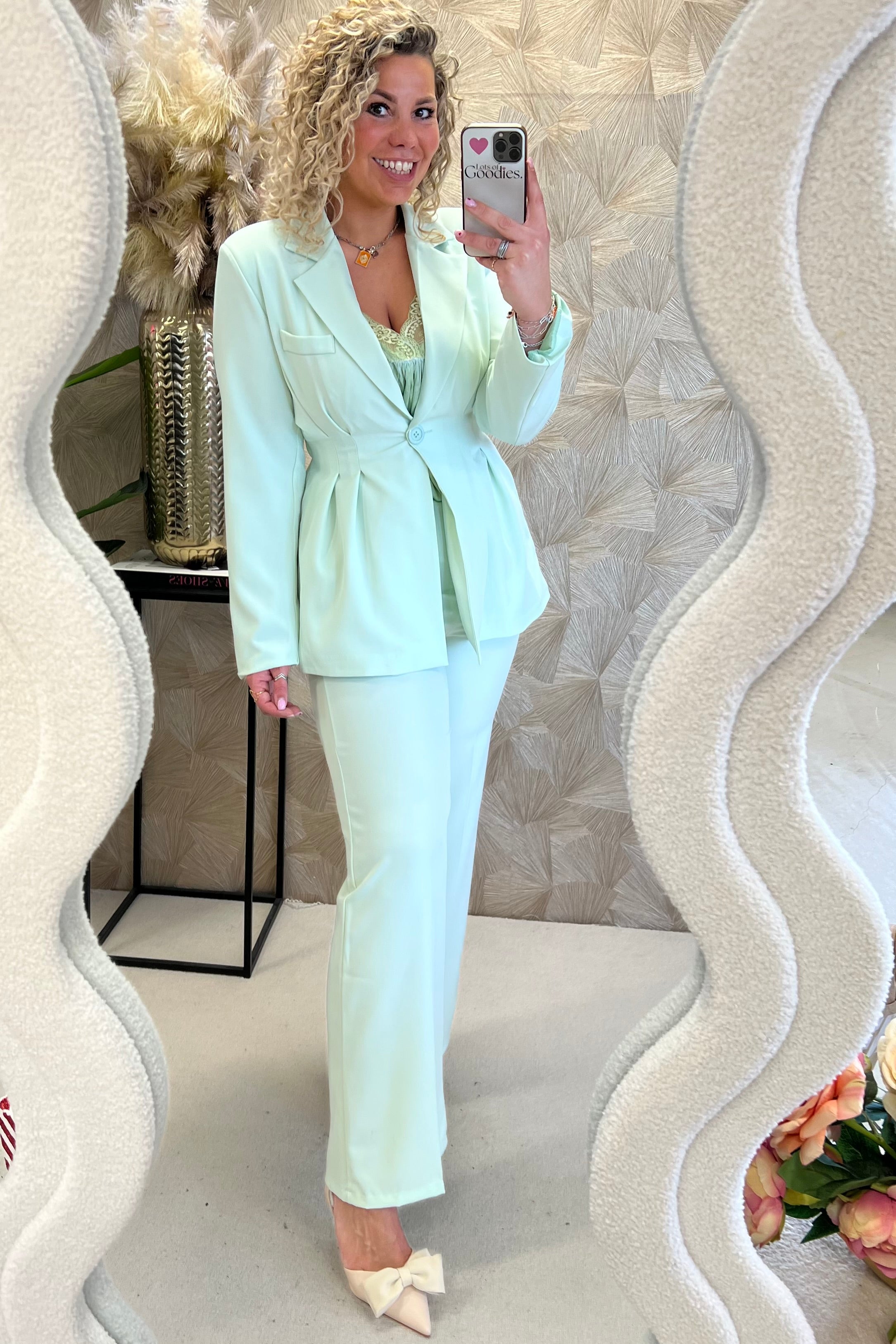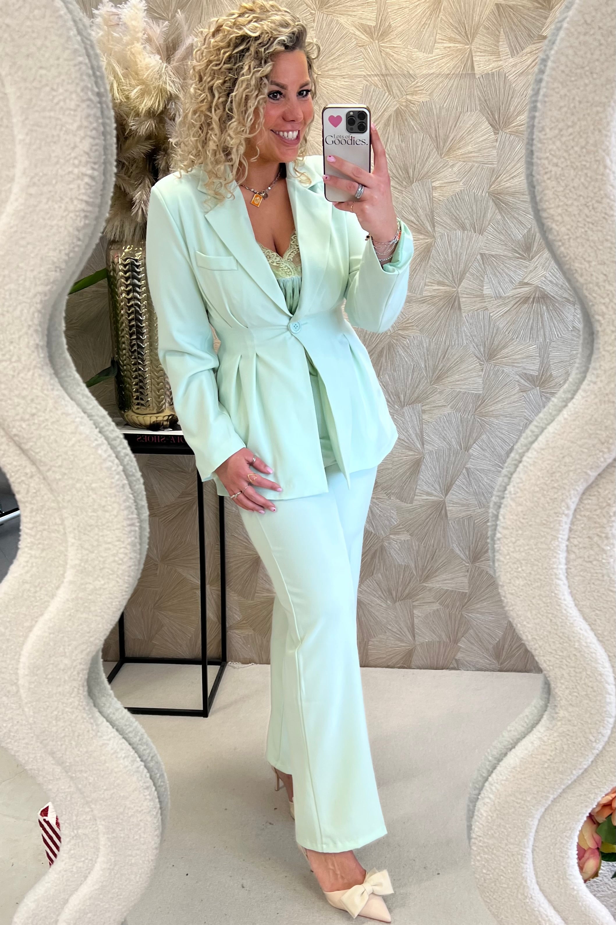 Dit suit bestaat uit een getailleerde blazer en pants, het ideale pak voor deze tijd van het jaar! Shop hem in light green!