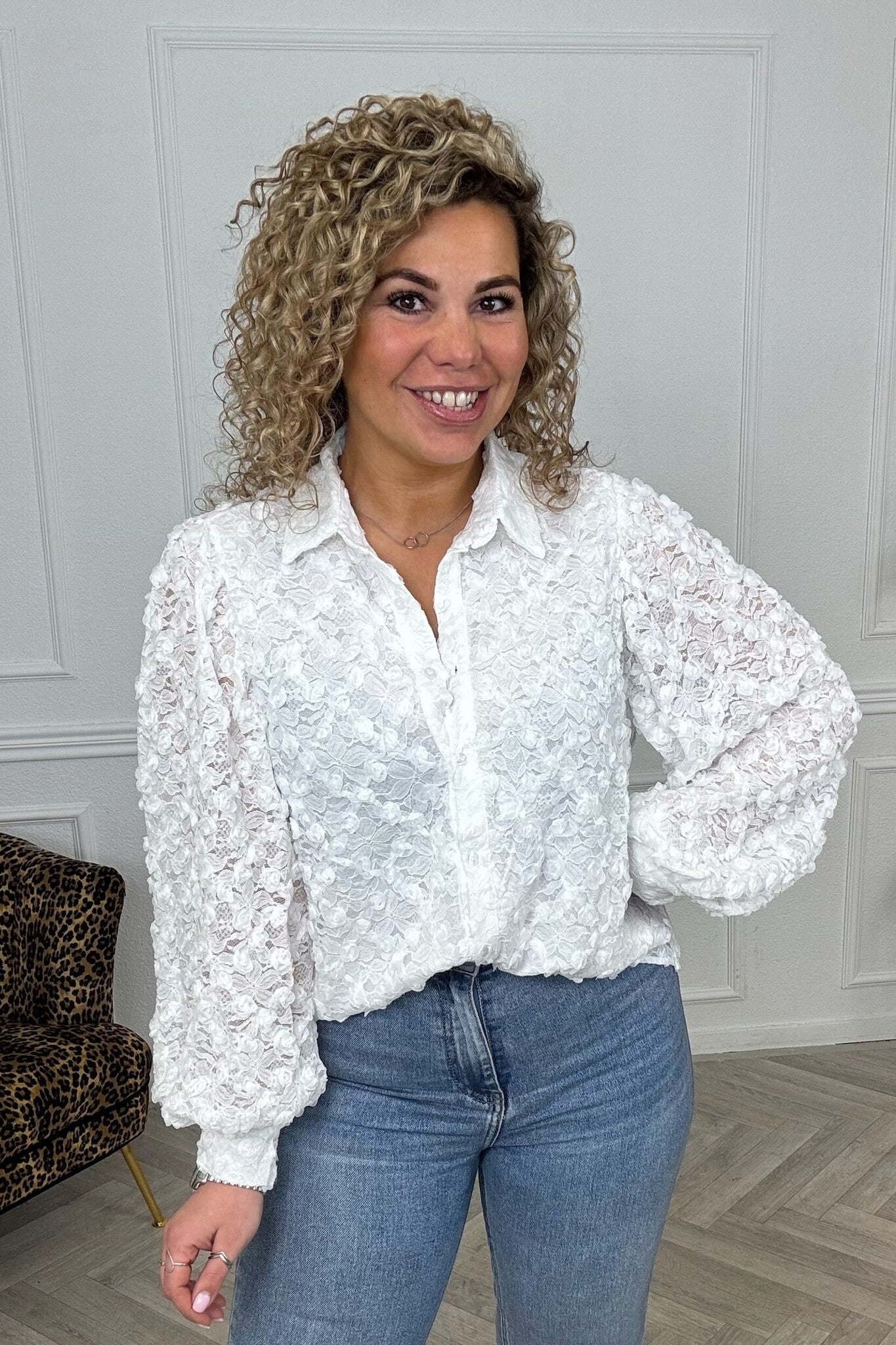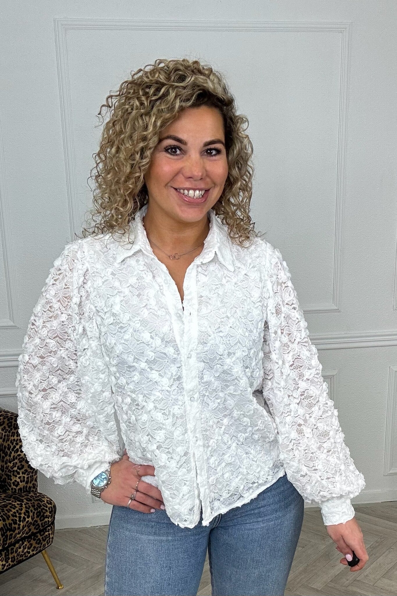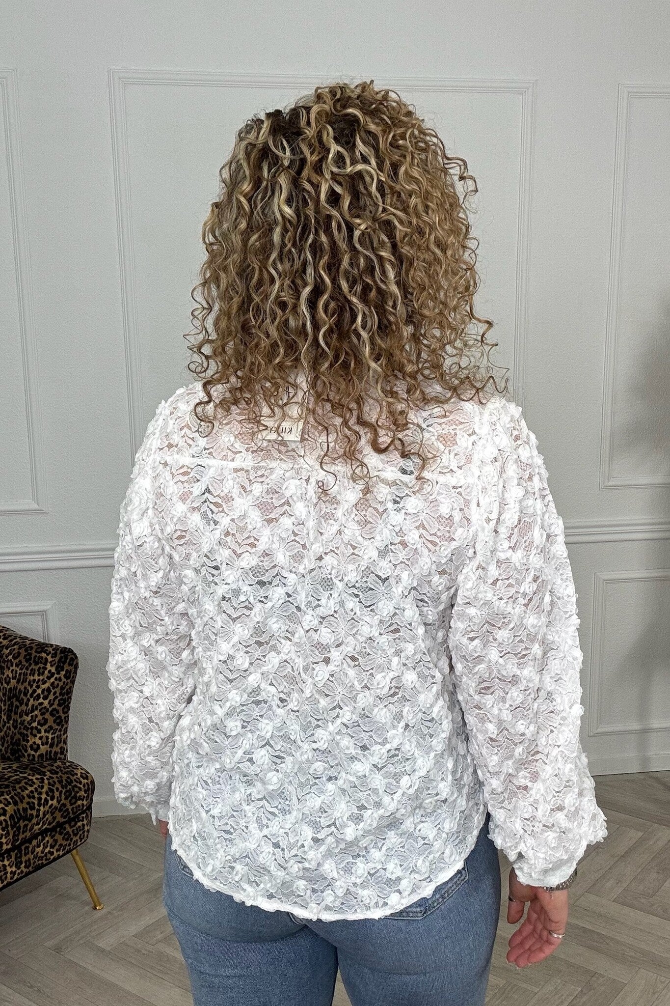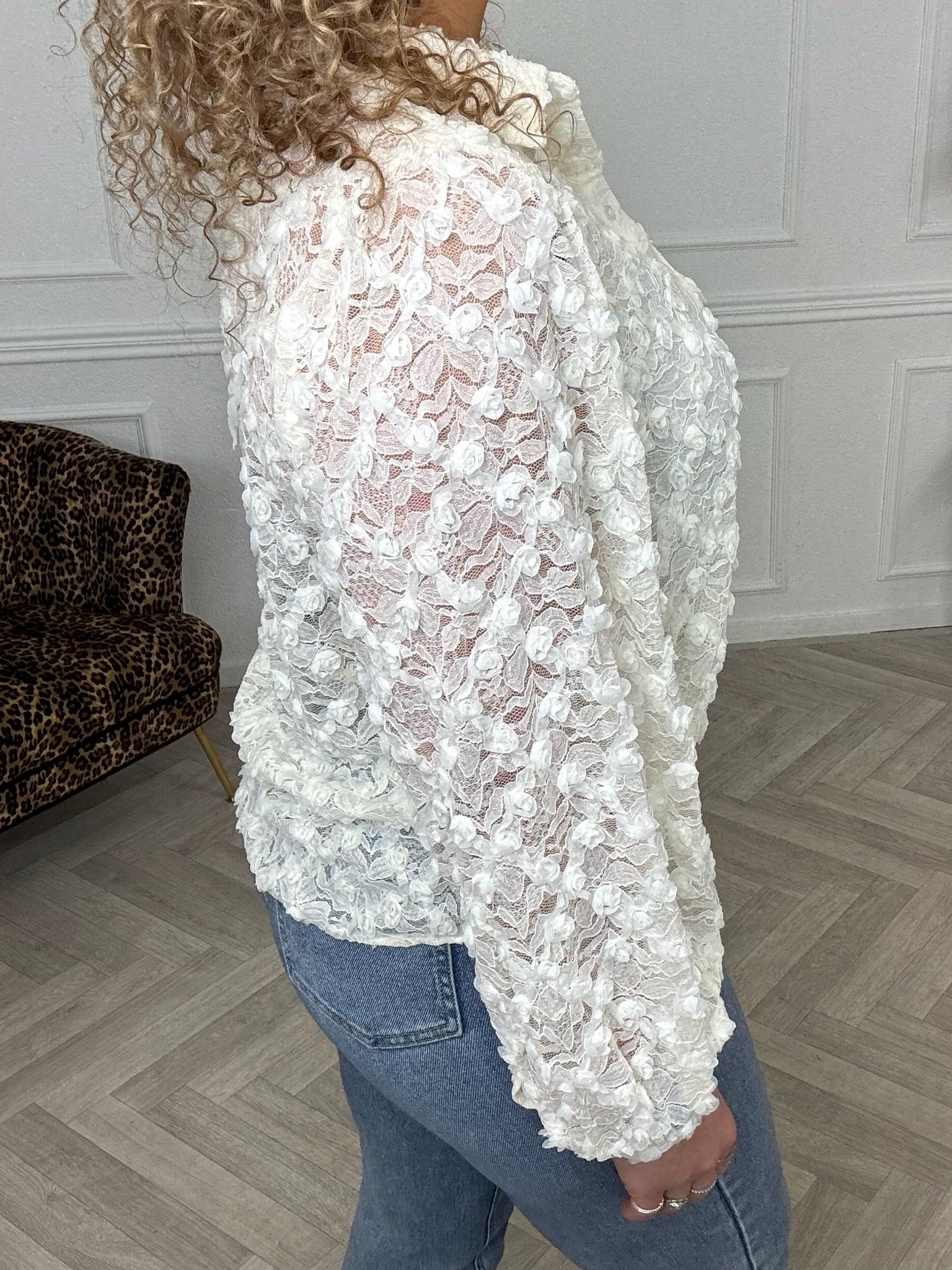 We hebben nu geweldige blouse binnen met super leuke bloemen verwerkt door de gehele blouse en een doorzichtige achterkant.