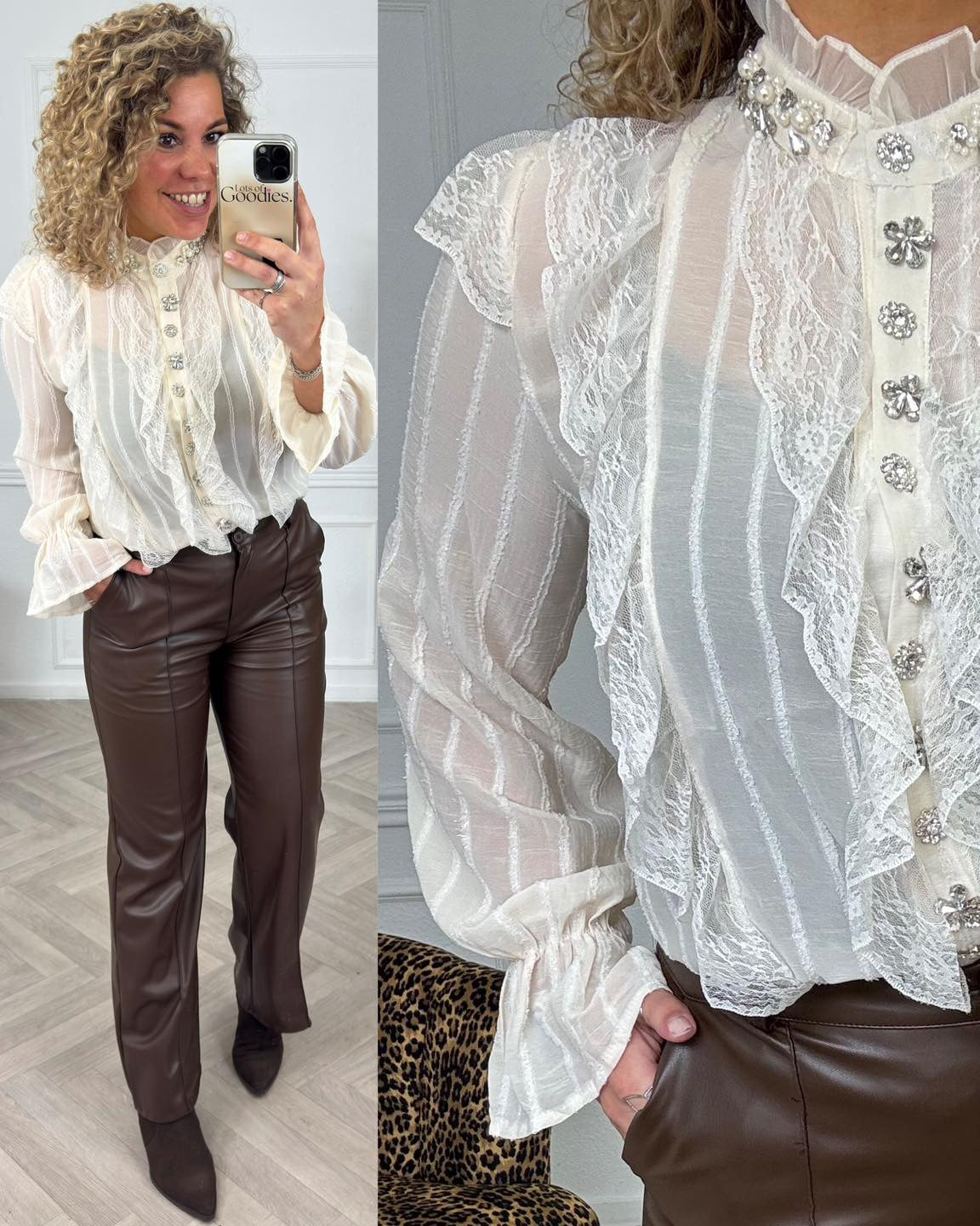 Een fantastische blouse, afgewerkt met ruffles en heerlijke glitter!! Shop de ruffle glitter blouse nu snel in beige!