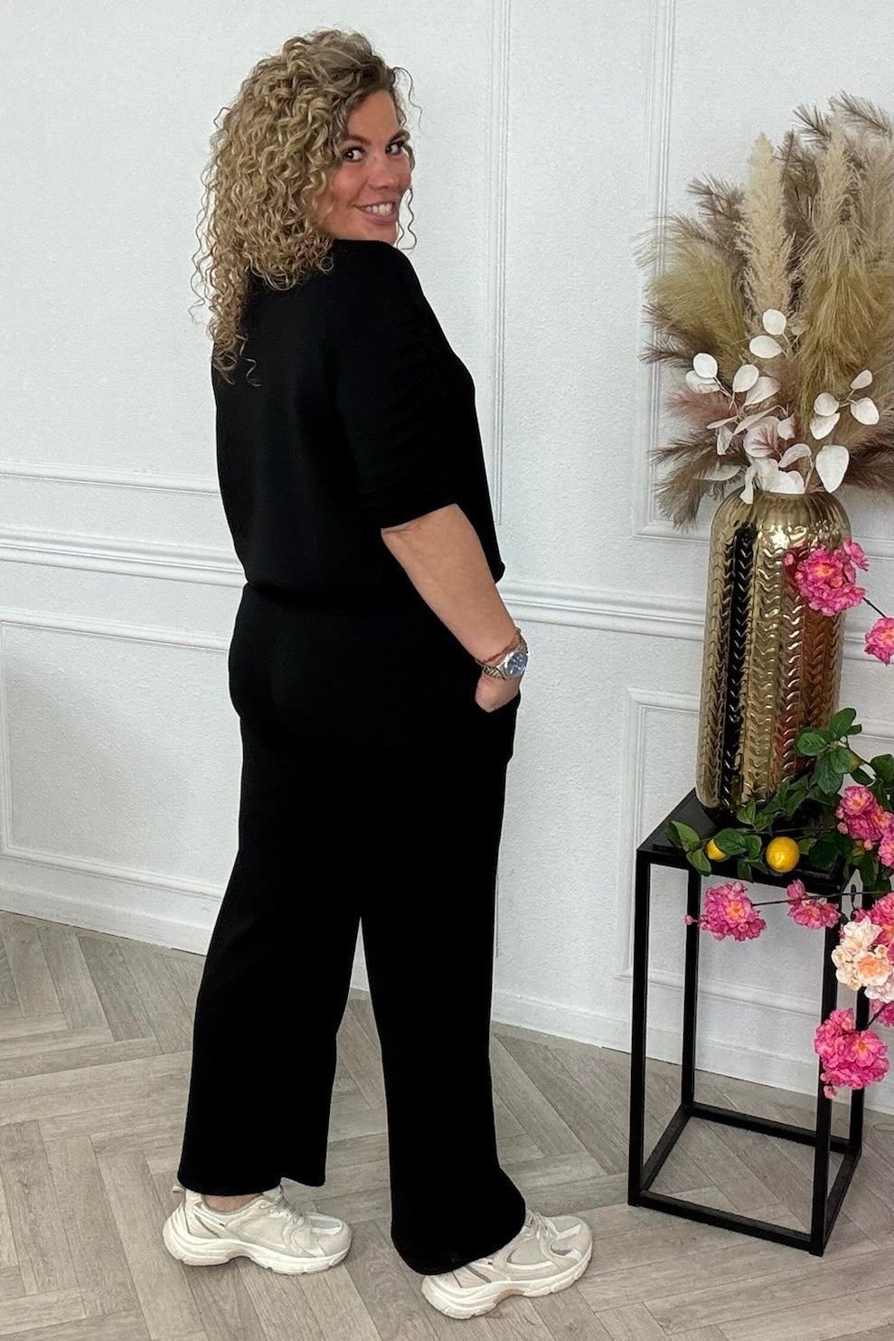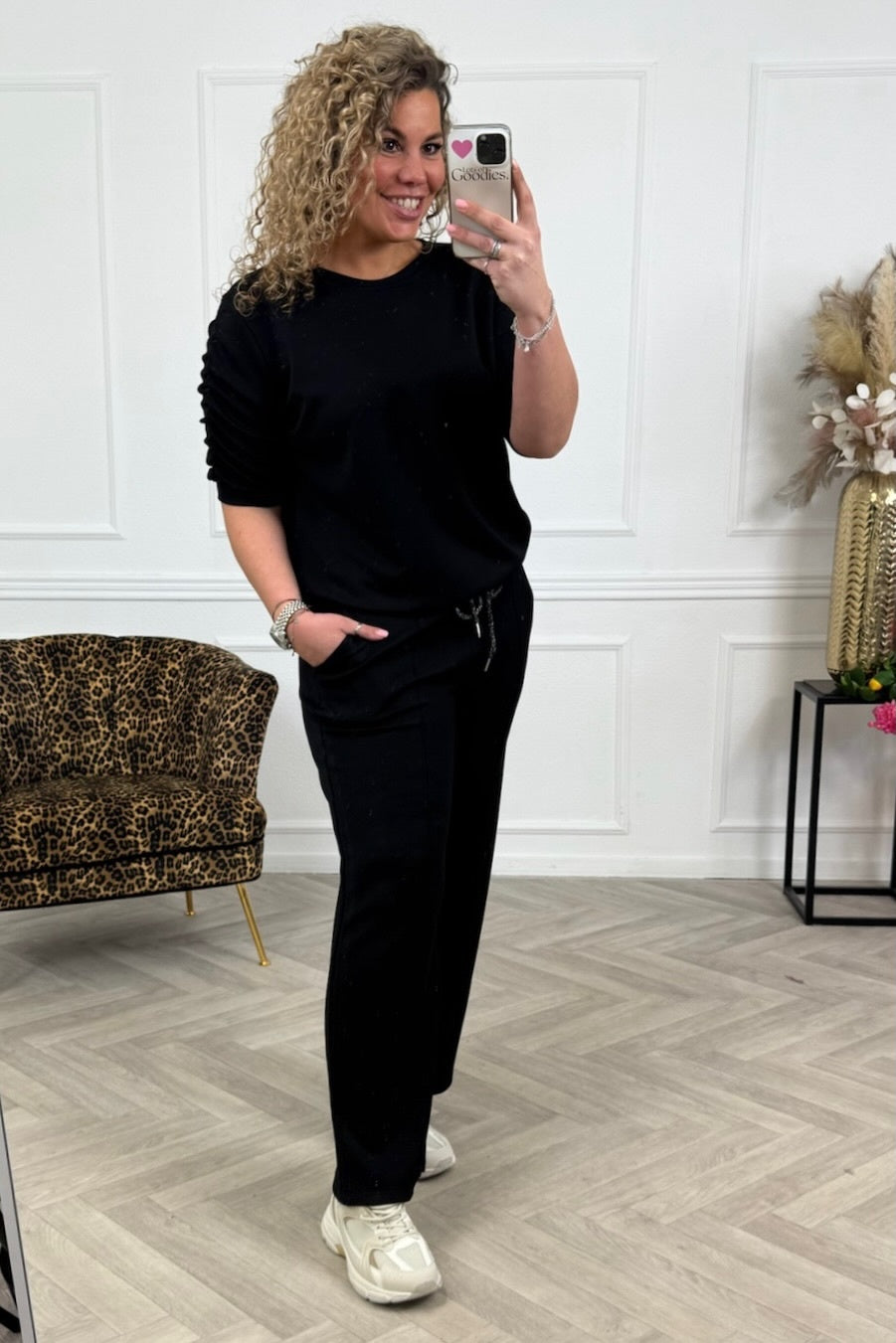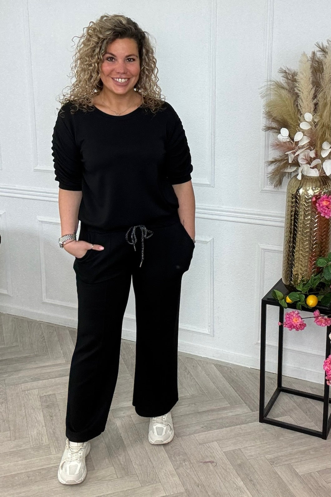 Deze heerlijke jogging set met ruffles op de mouw is super comfy en stijvol! Shop hem in black.