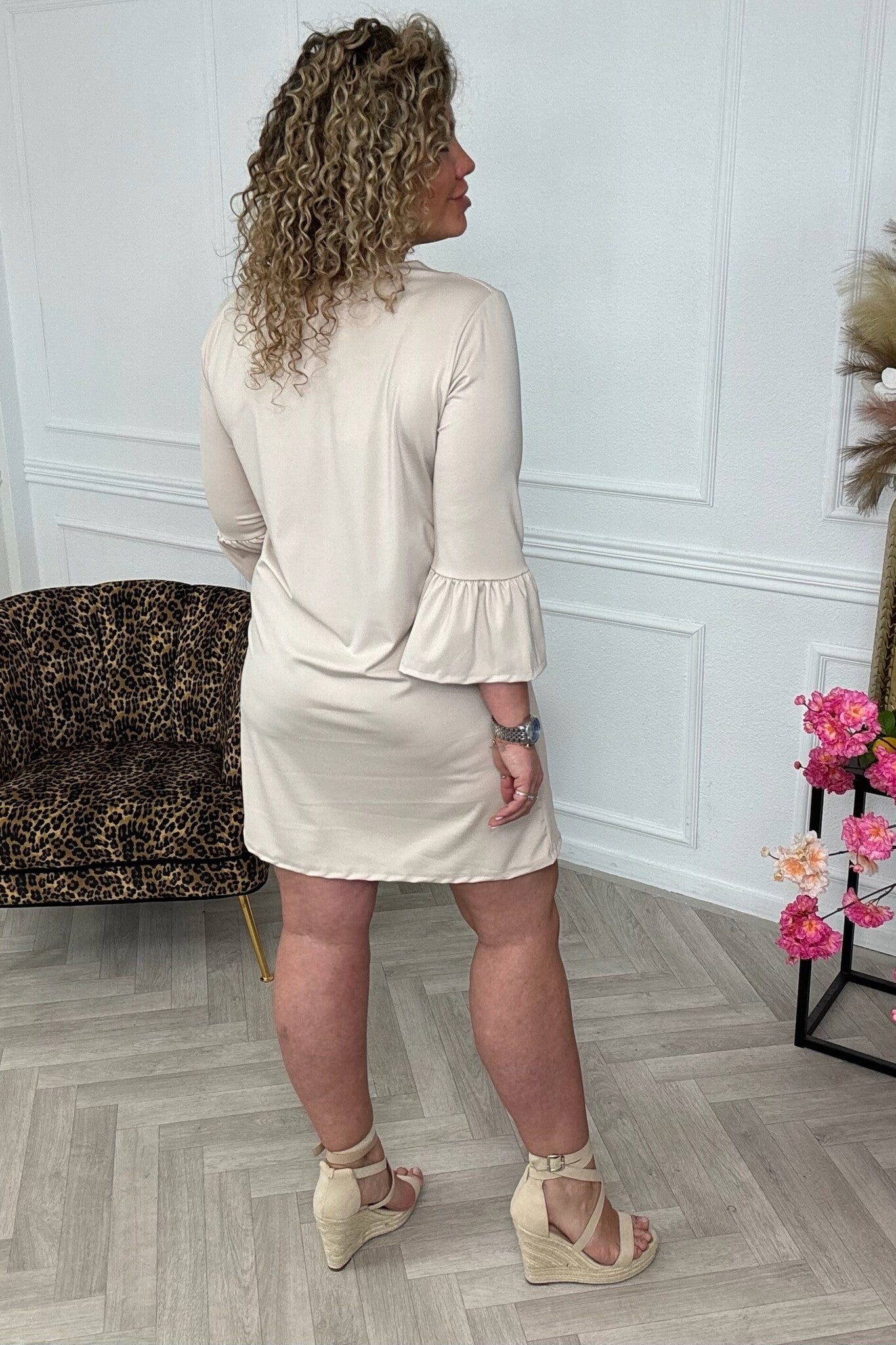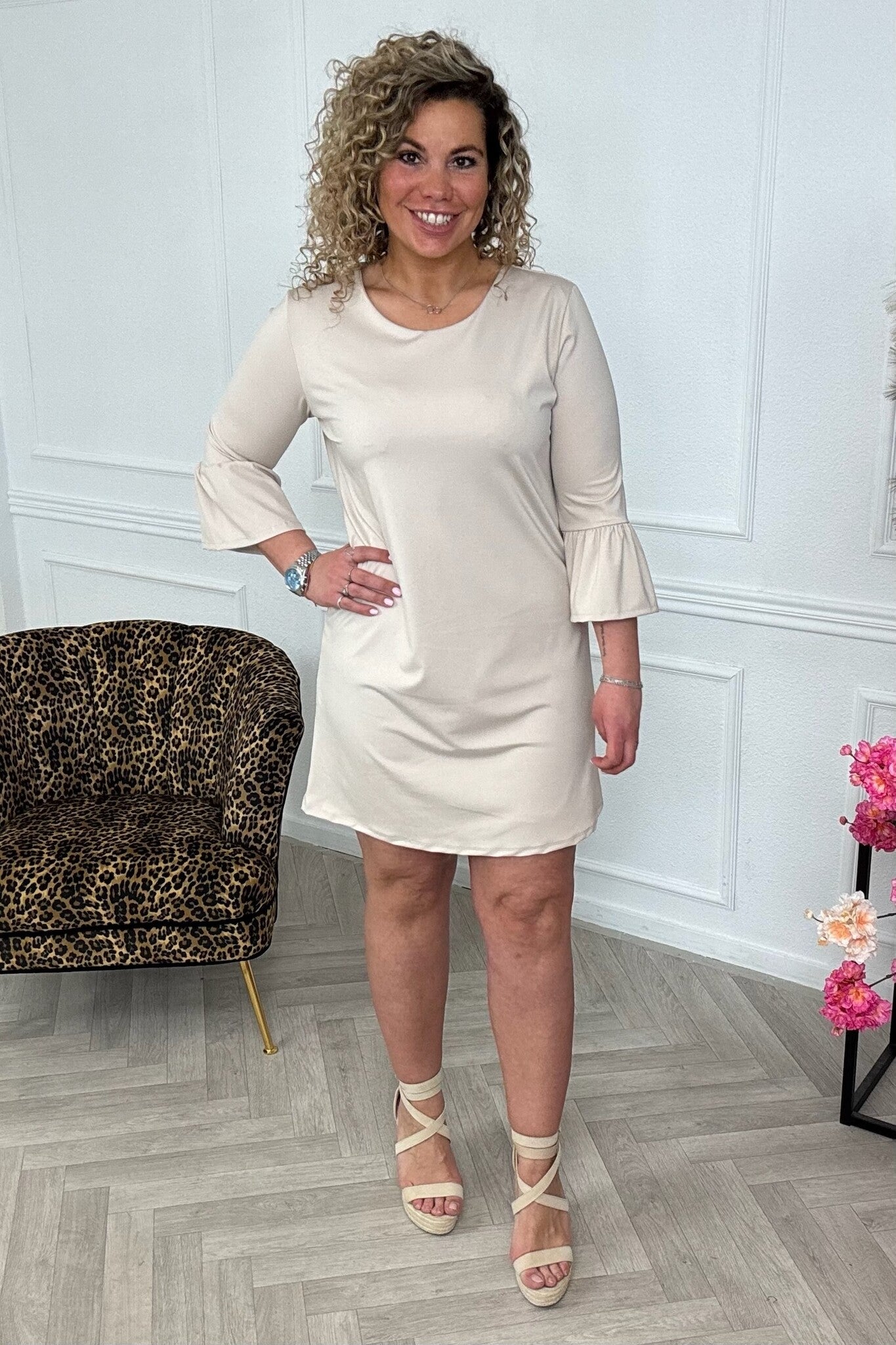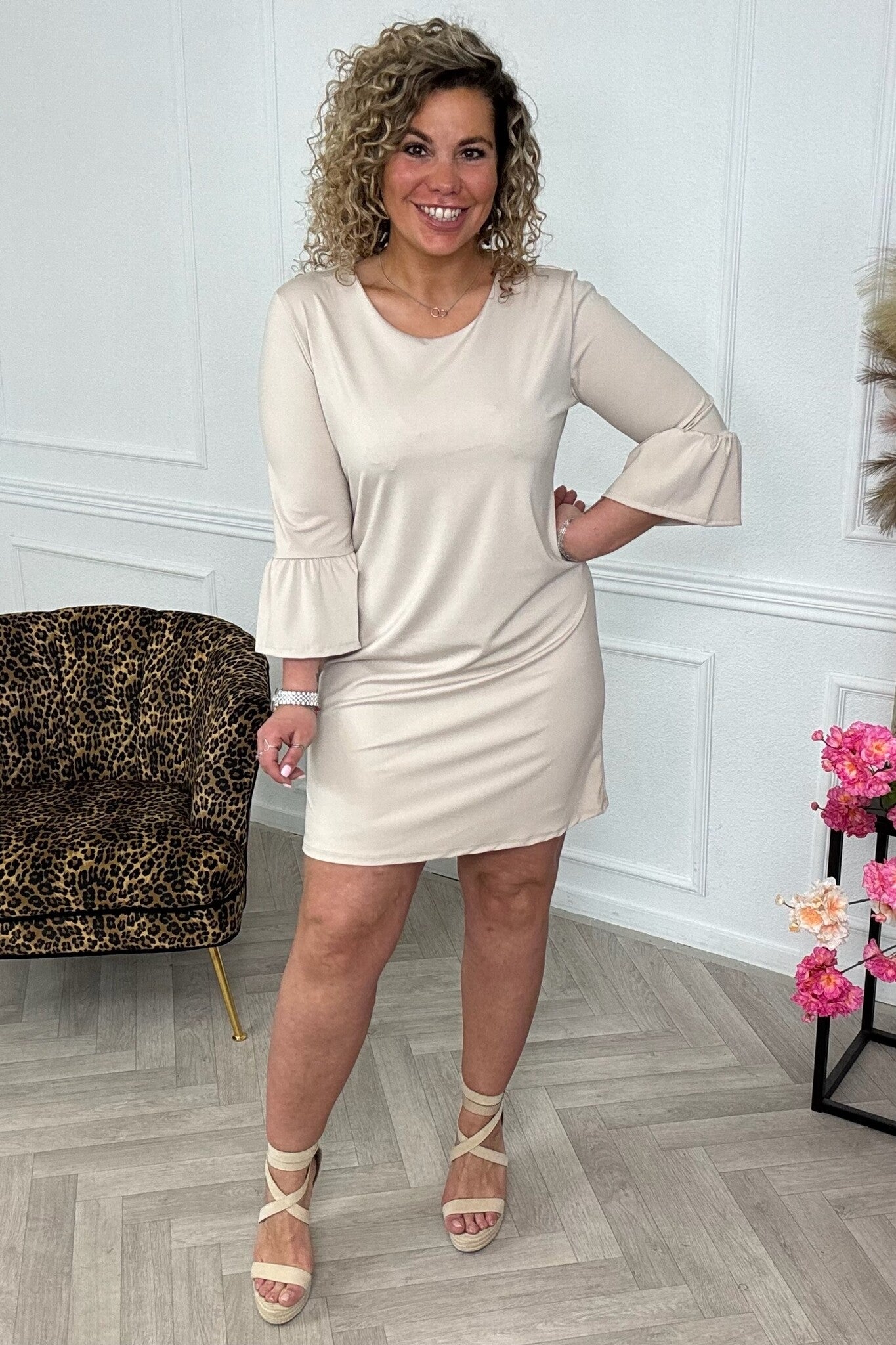 Dit prachtige jurkje is gemaakt van travelstof en heeft een mooi A-lijn model met een gave mouw! Shop hem nu online in Beige.