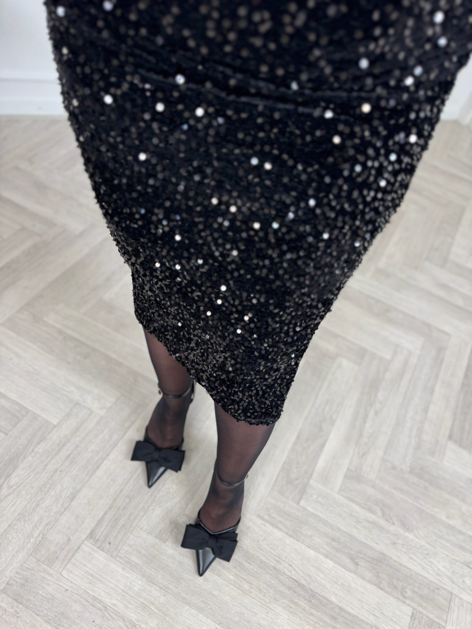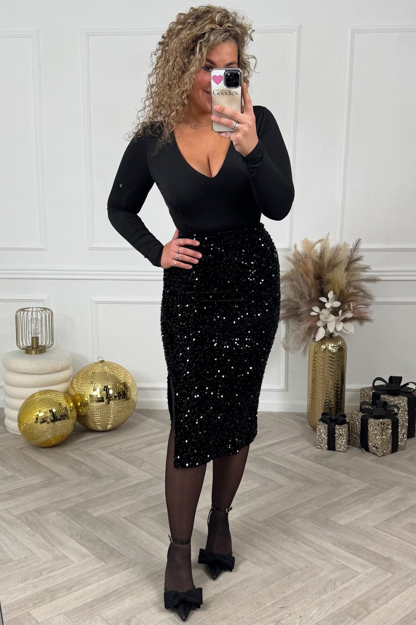 We love this skirt! Deze rok heeft mooie pailletten. Shop hem in black