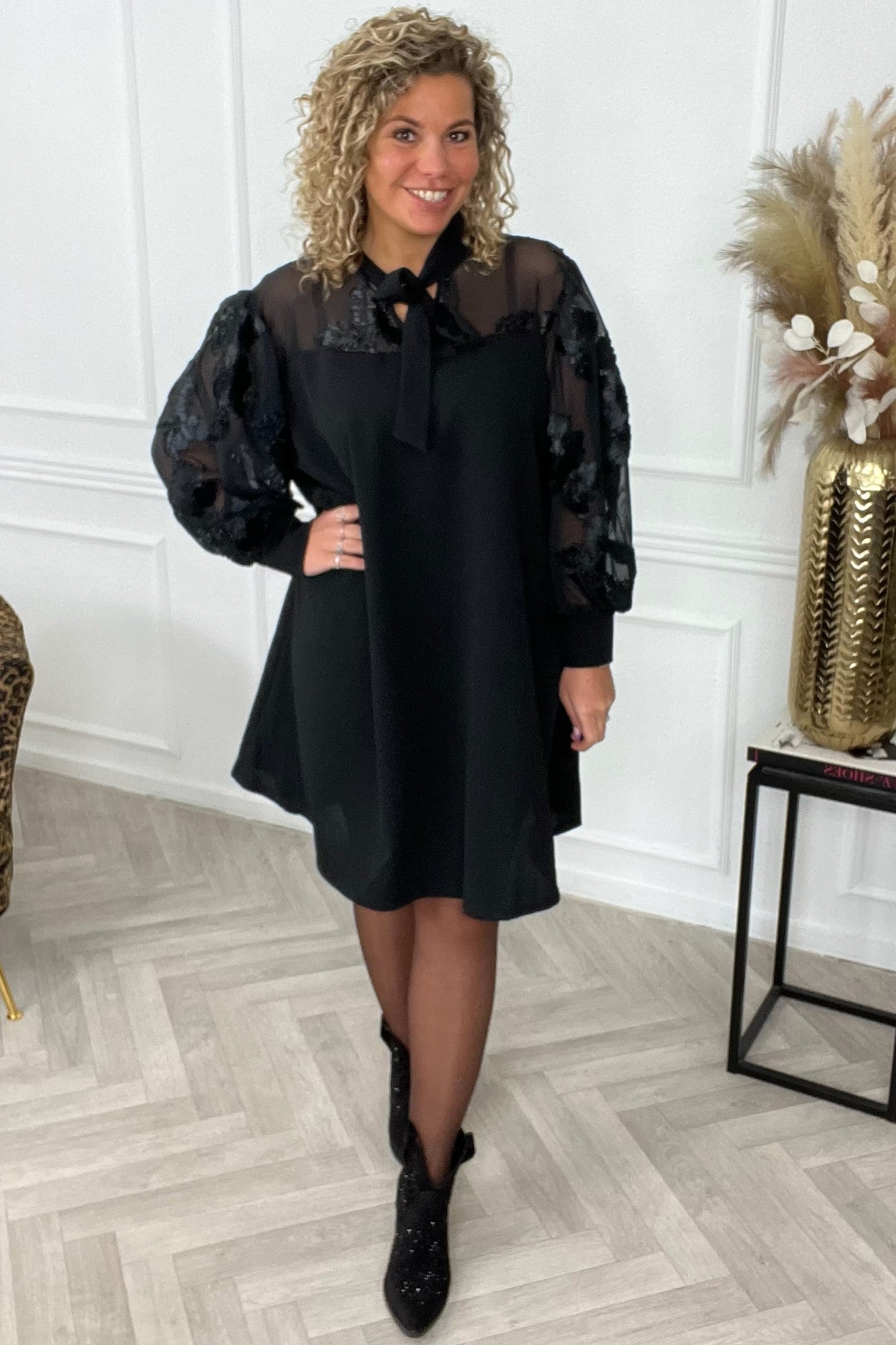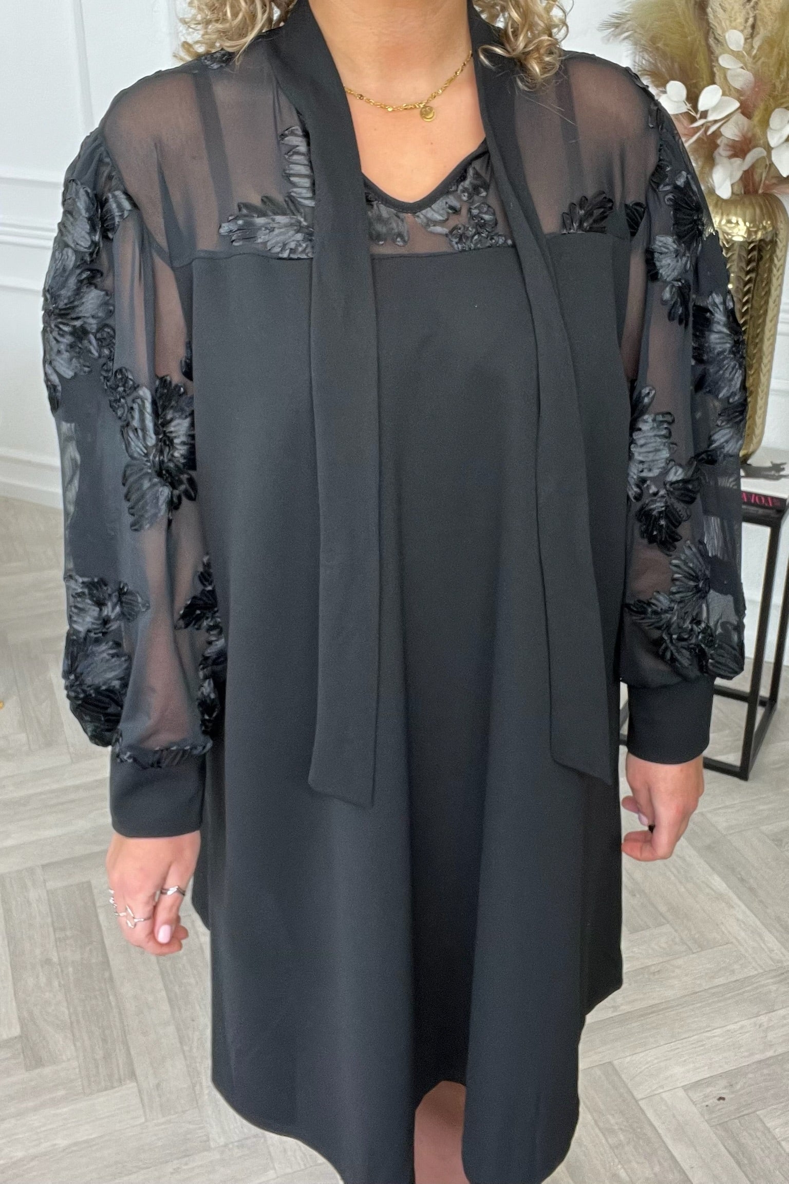 Een hele mooie jurk, met doorzichtige mouwen waar gave bloemen op zitten! De jurk heeft aan de voorkant een leuke strik om het af te maken. Shop de sheere flower strik dress nu snel in black!