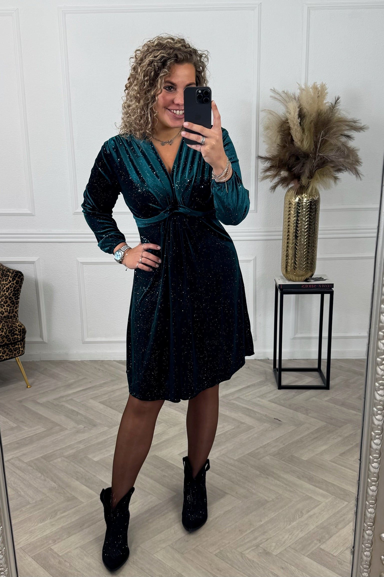 Wauw! Deze nieuwe velvet dress met sparkle is nu te krijgen in meerdere kleuren! Wil jij schitterend aan de feesttafel zitten? Shop de short knotted velvet sparkle dress dan nu snel in green!