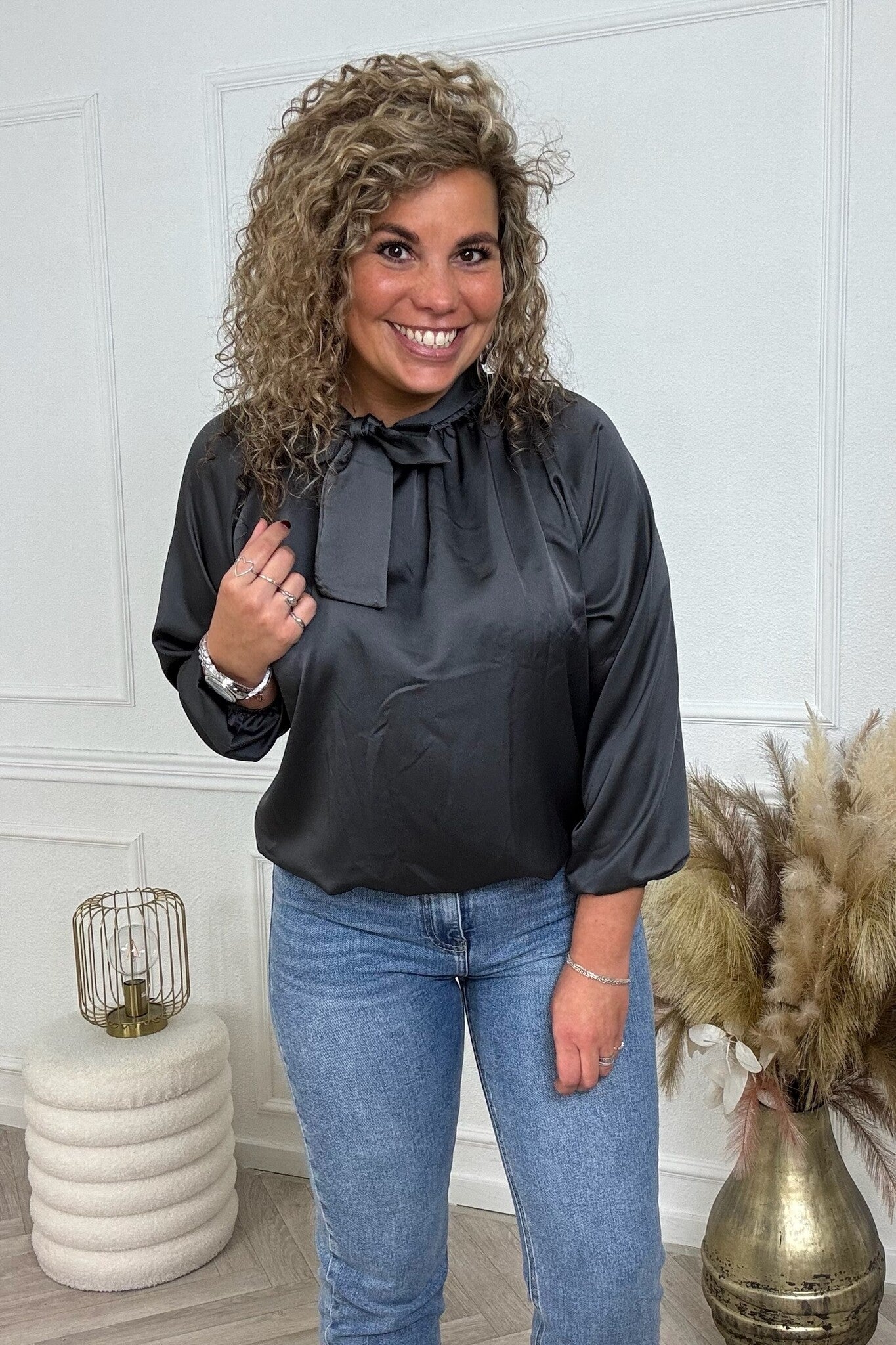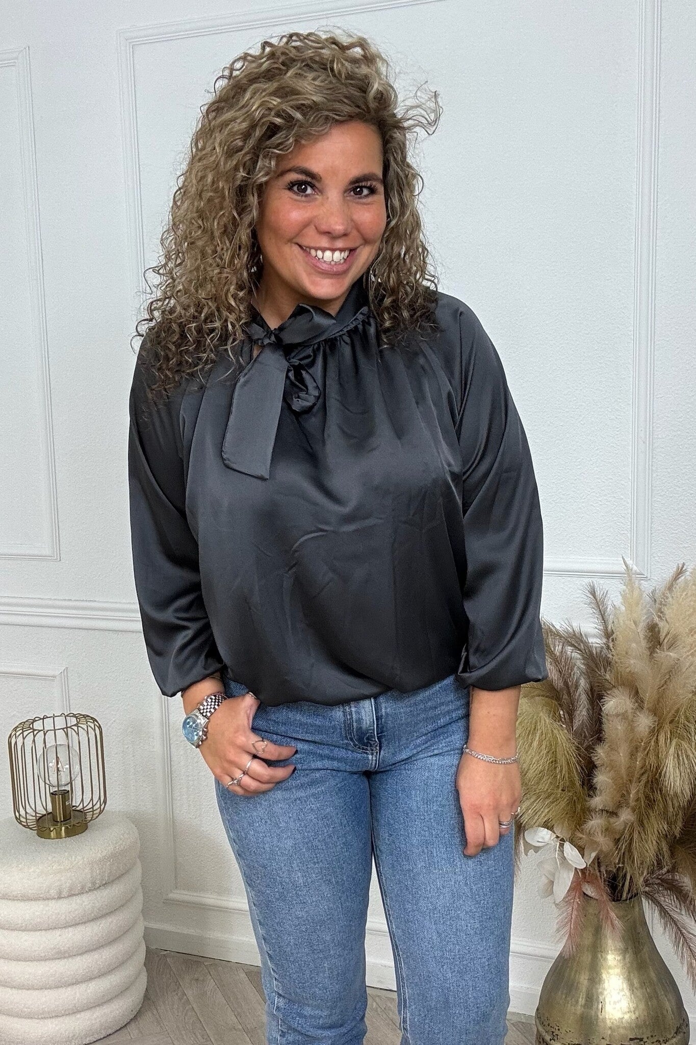 We hebben een superleuke classy blouse binnen met een chique strik detail! Shop hem nu in dark grey.