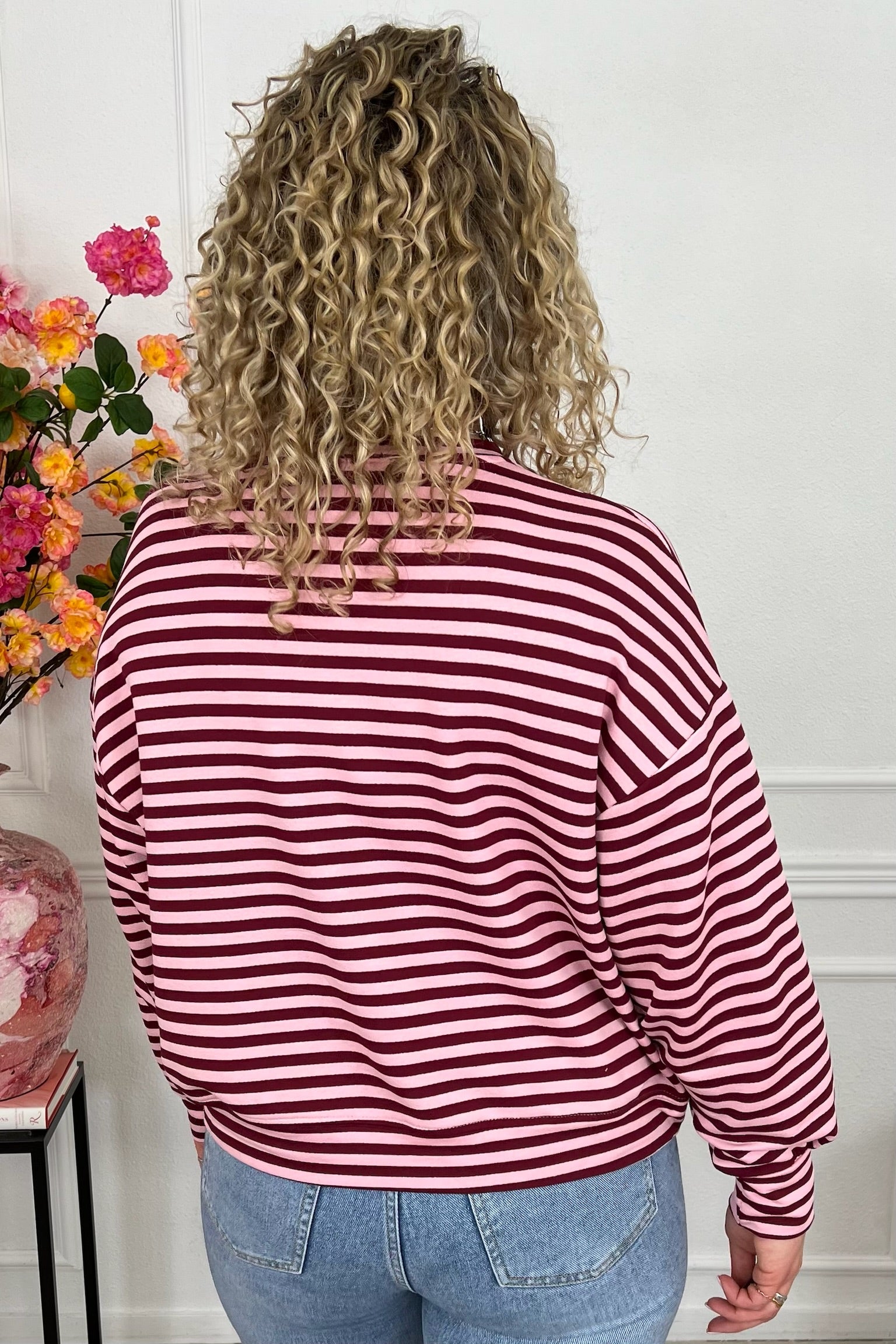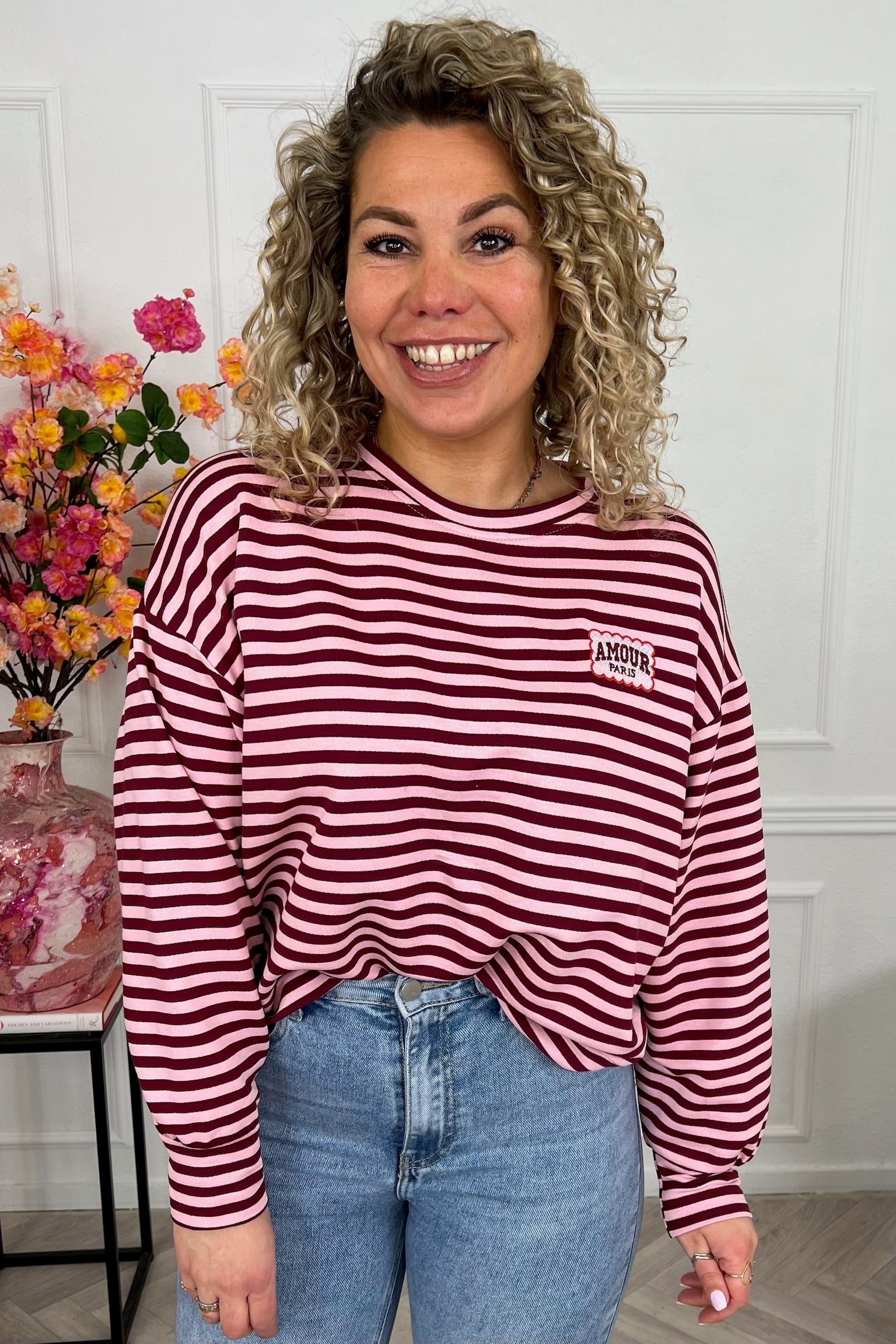 Dit heerlijke gestreepte shirt met mooi AMOUR-embleem erop, shop je in de vrolijkste kleurtjes, zoals bordeaux/pink!