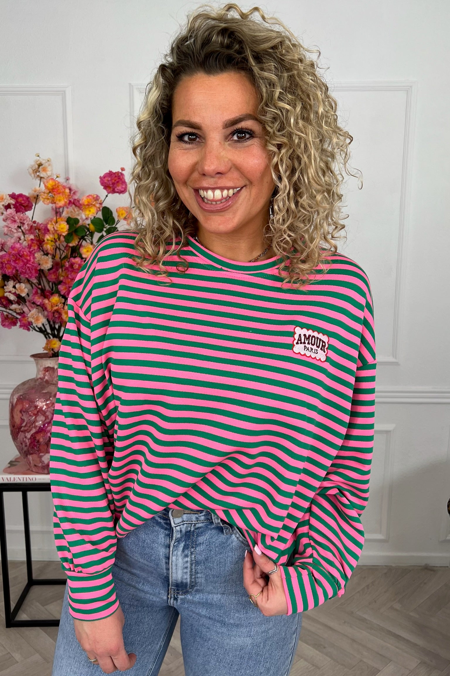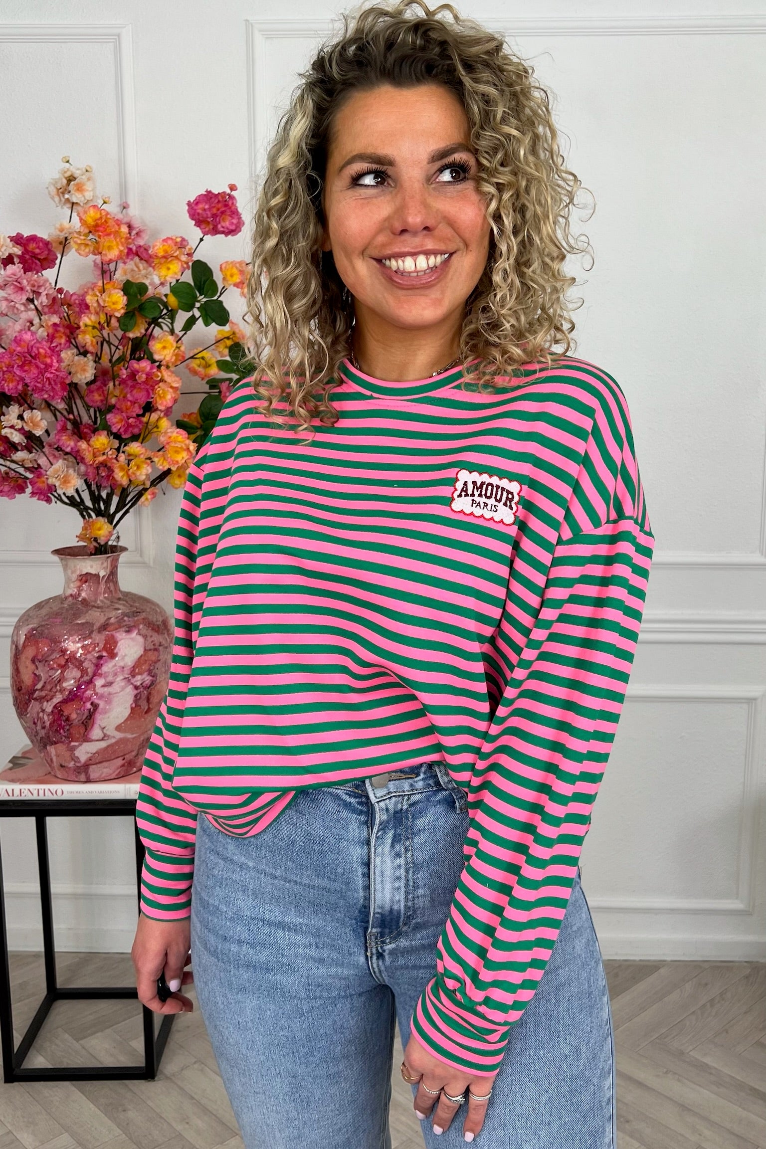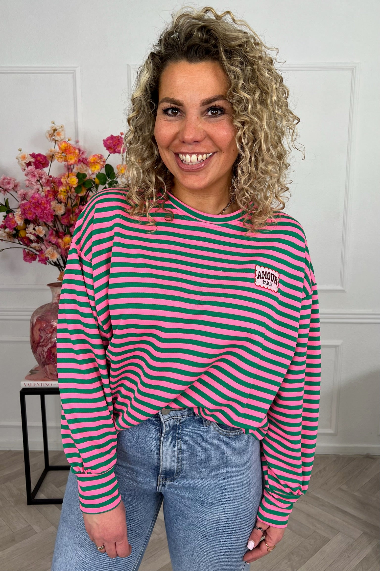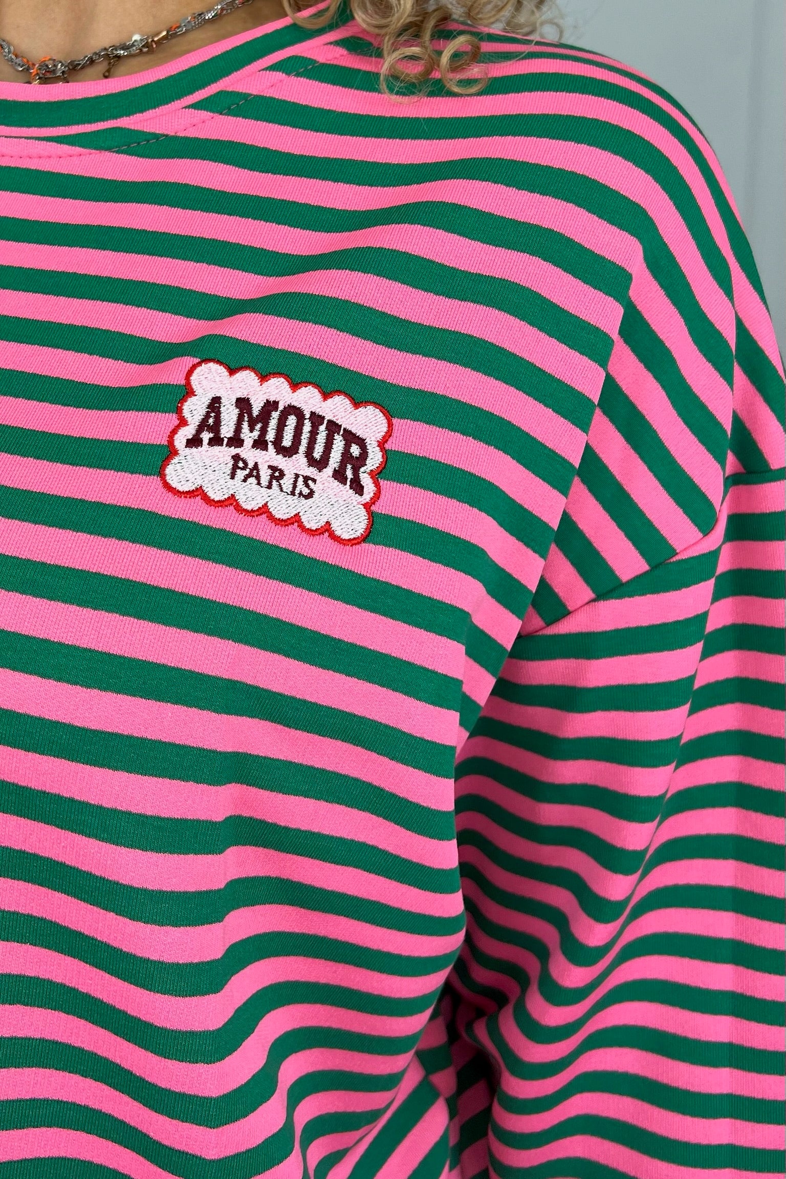 Dit heerlijke gestreepte shirt met mooi AMOUR-embleem erop, shop je in de vrolijkste kleurtjes, zoals fuchsia/green!