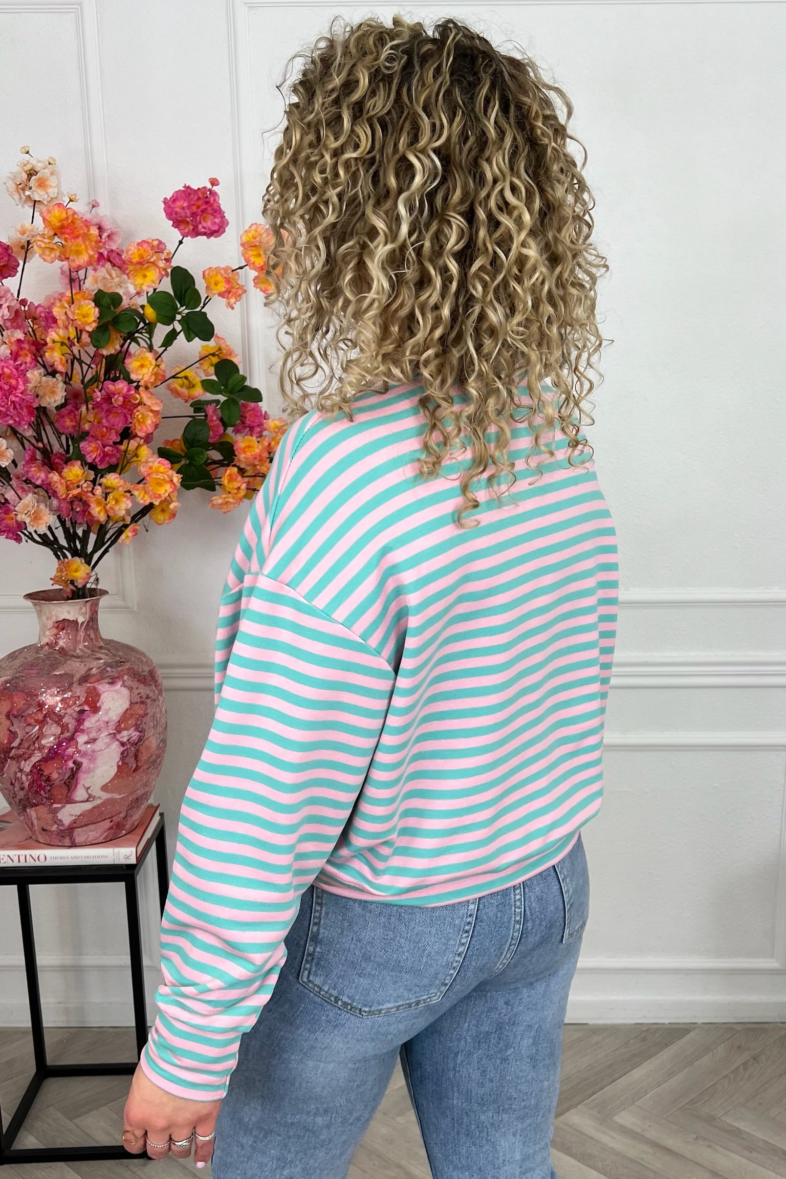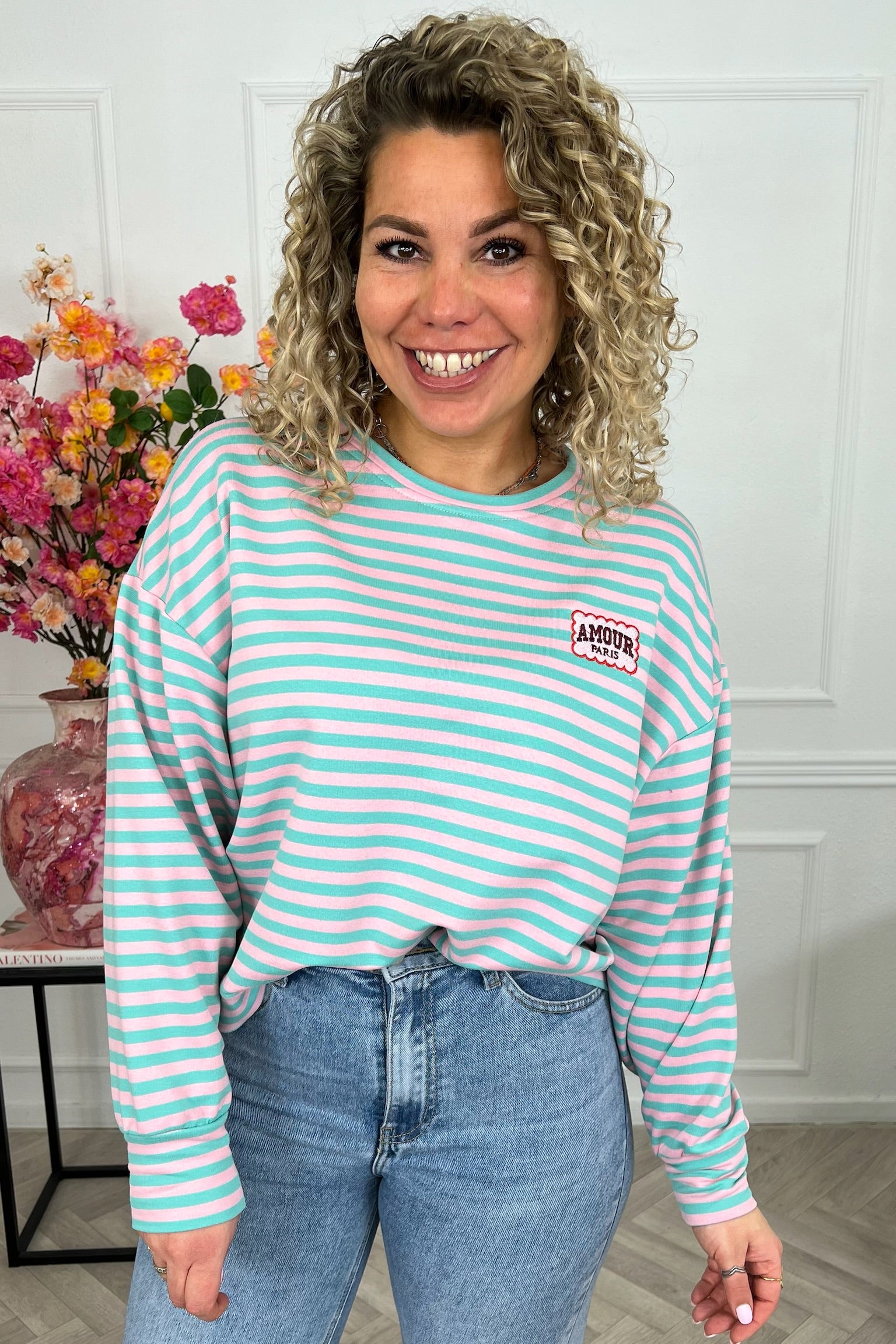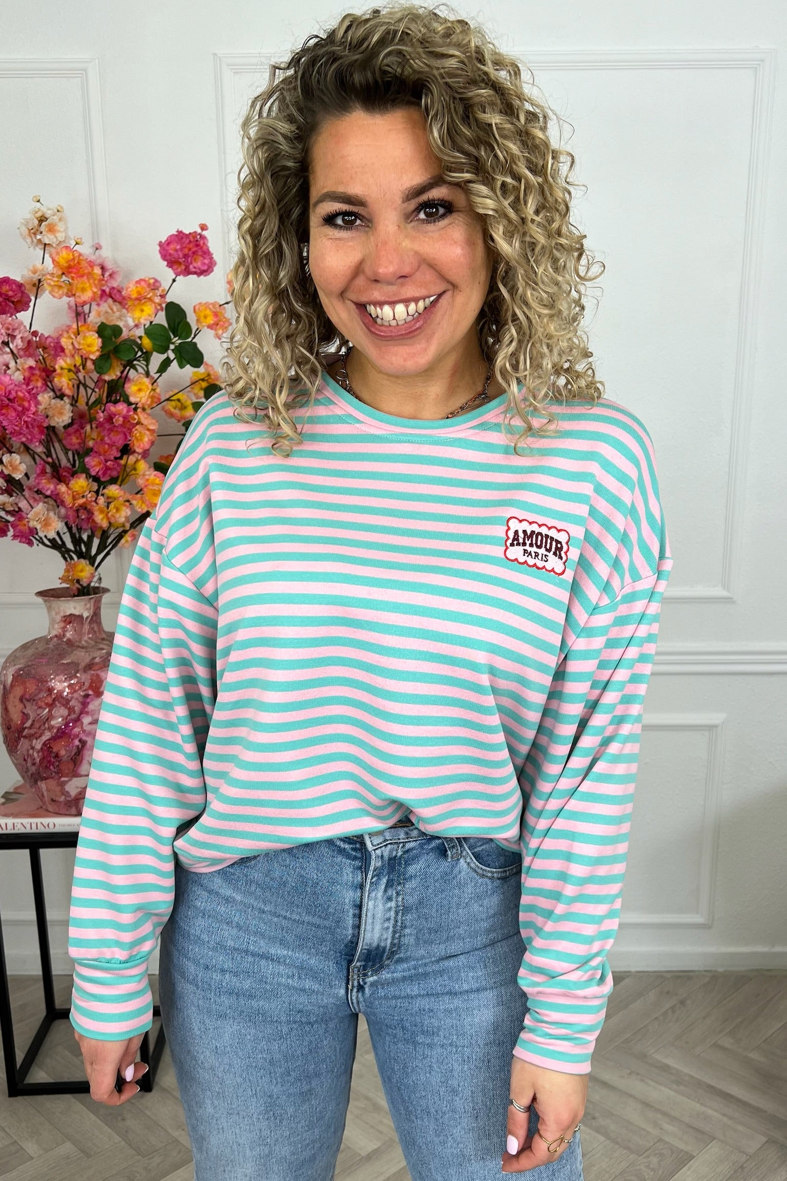 Dit heerlijke gestreepte shirt met mooi AMOUR-embleem erop, shop je in de vrolijkste kleurtjes, zoals turquoise/pink!