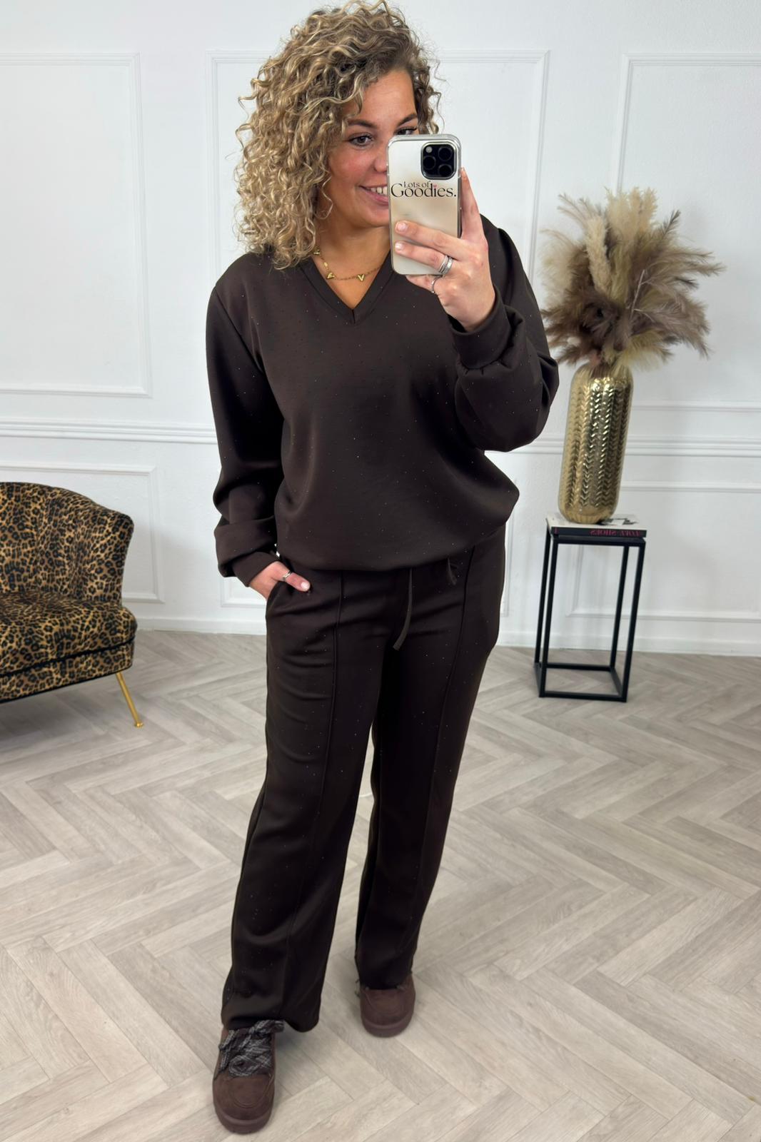 Let's get this comfy party started! Deze heerlijke comfy set heeft leuke glitterstuds over het hele pak. Het pak bestaat uit de sweater en de pants, shop hem in brown!