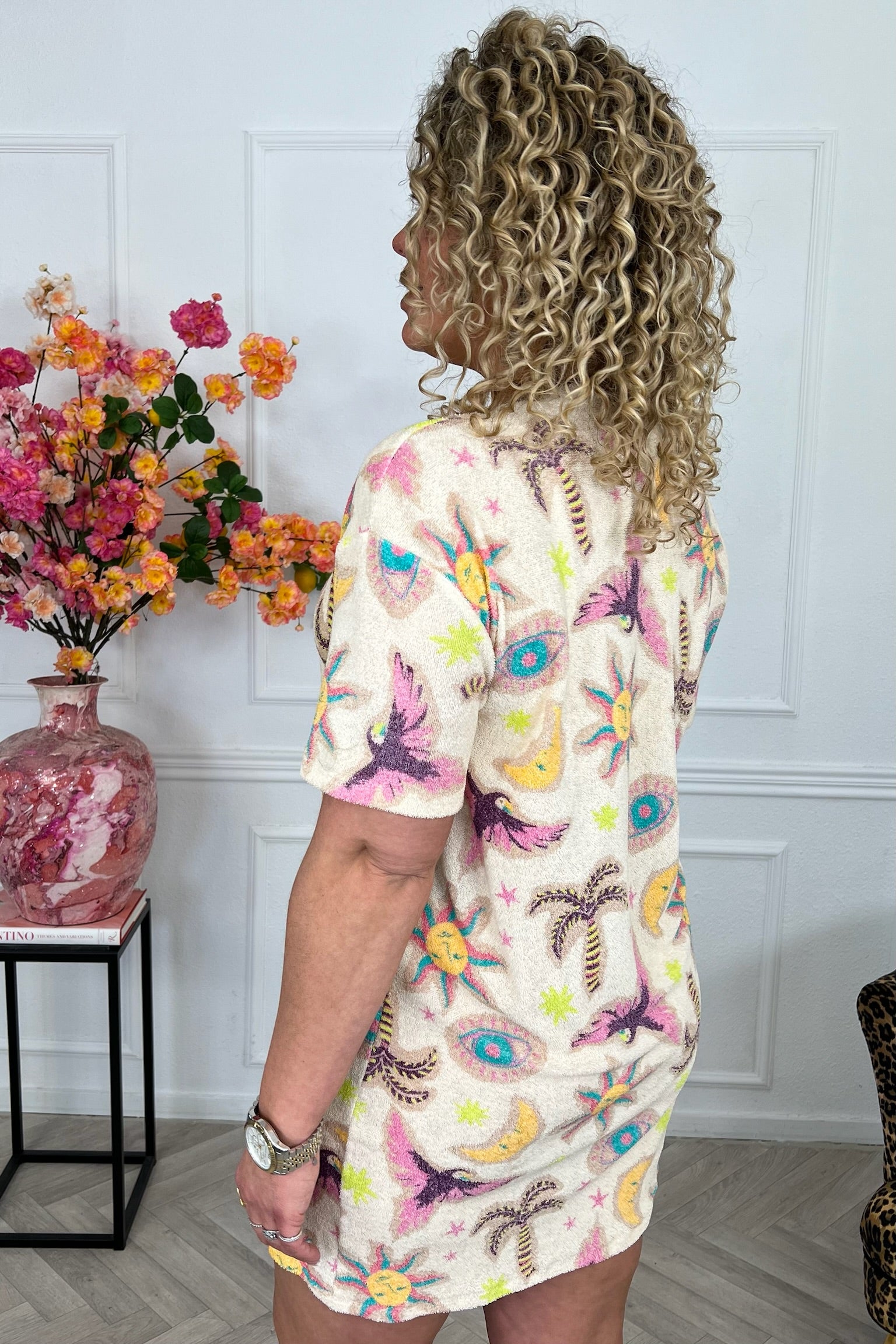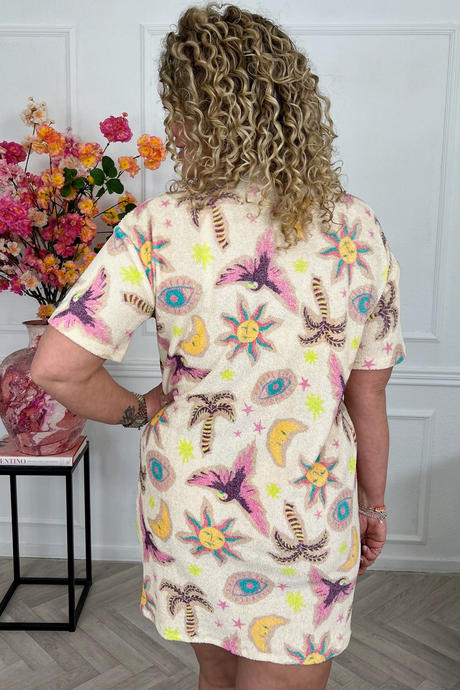 Terry is Engels voor badstof: de heerlijk zachte stof waarvan dit jurkje gemaakt is! Shop hem met een mooie print in beige! LET OP: LEVERDATUM 19-3
