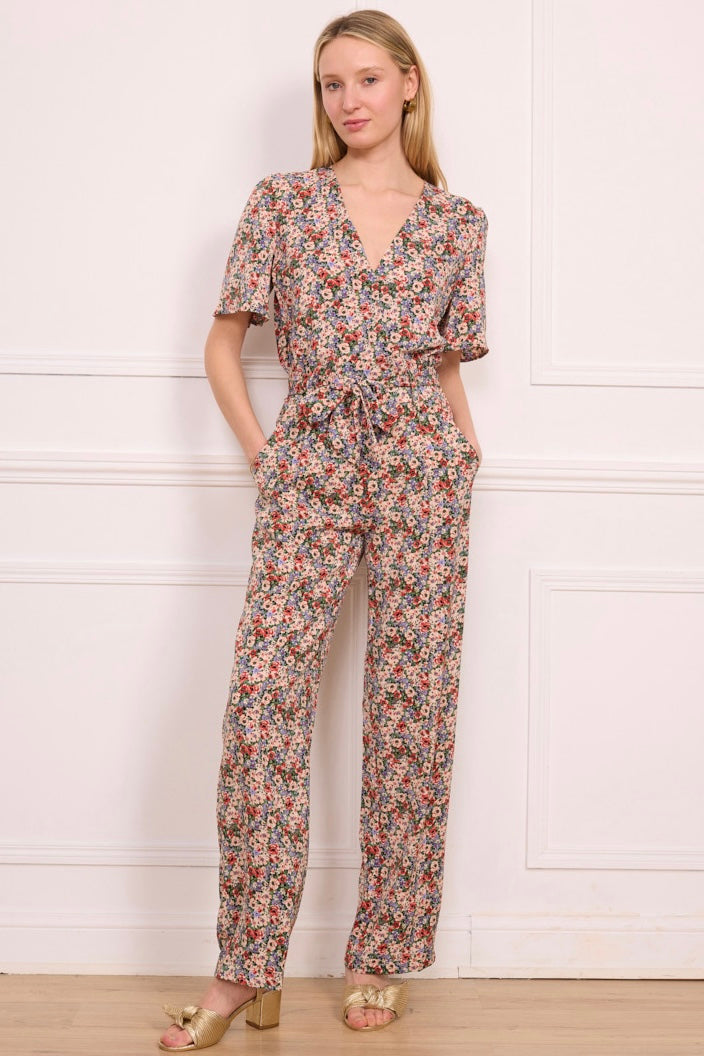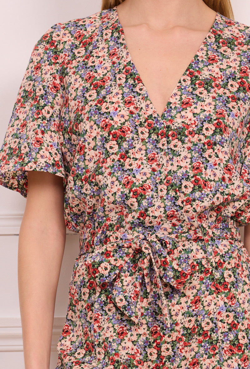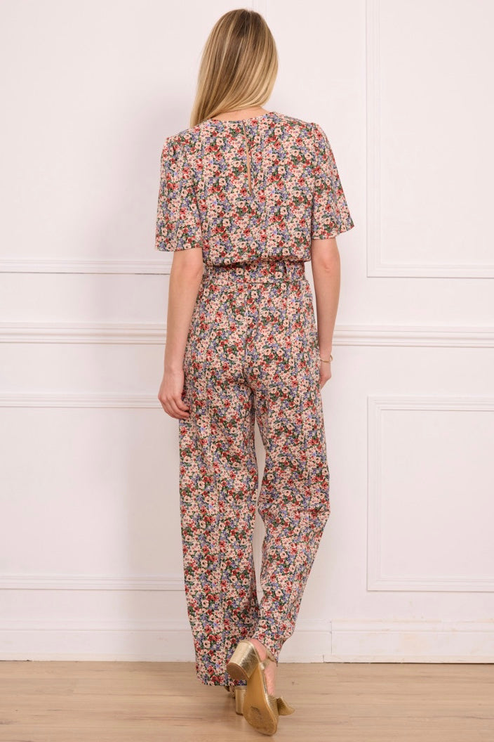 Een supermooi v-hals flower jumpsuit, we love it! Met korte mouwen en een ceintuur. Shop hem nu in beige!