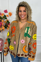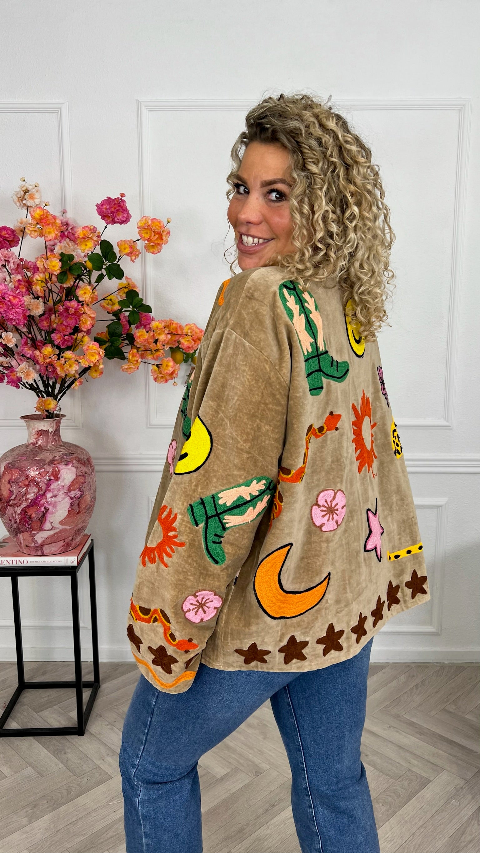 Wauw! Dit fantastische jasje is gemaakt van 100% katoen en valt lekker oversized. Hij heeft een leuke geborduurde print met onder andere smileys en cowboylaarzen, shop hem nu in beige!