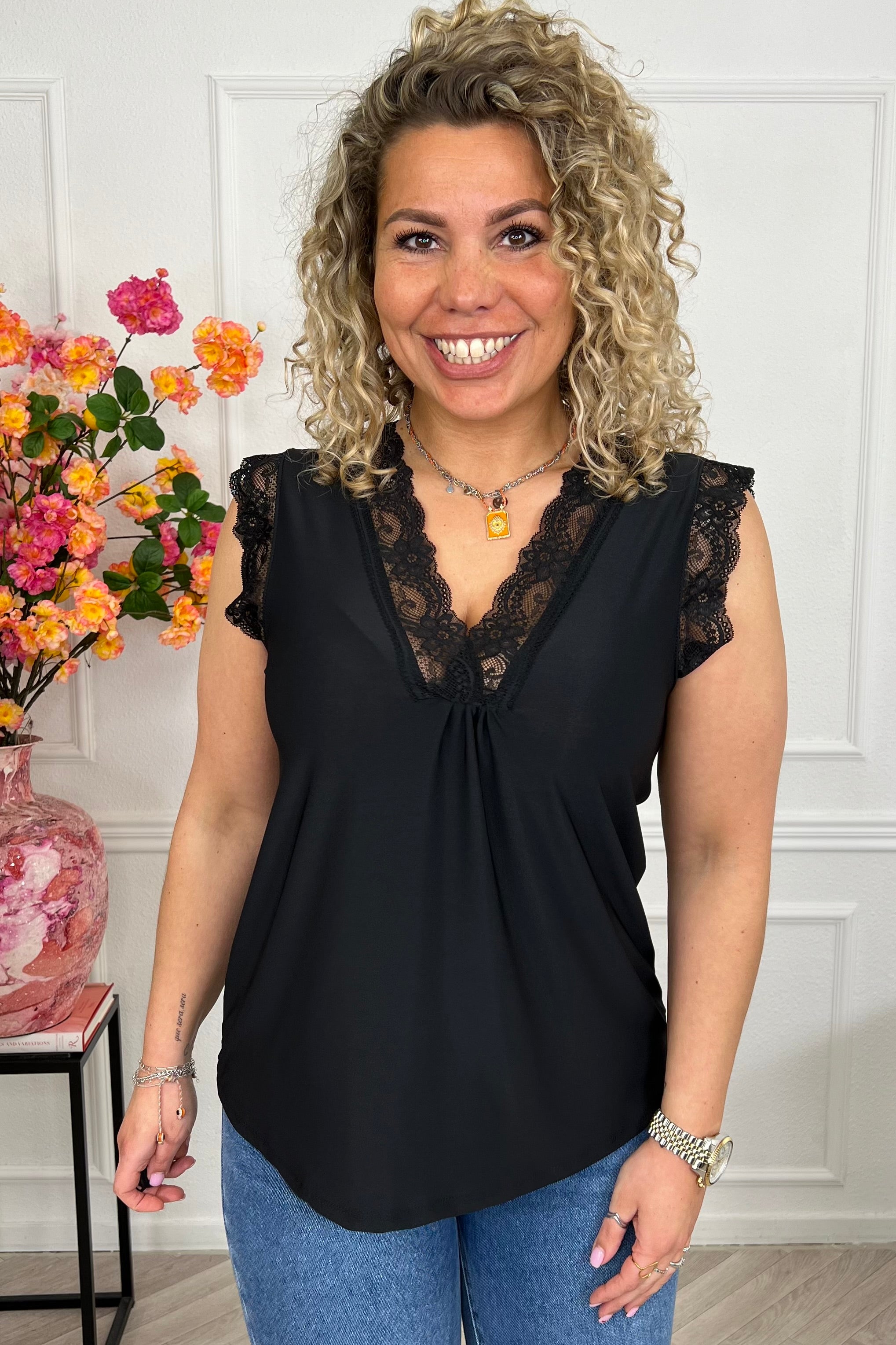 Heerlijke zomerse top met lace details, gemaakt van 100% viscose en ideaal voor ergens onder of lekker in de zomer! Shop hem in black!