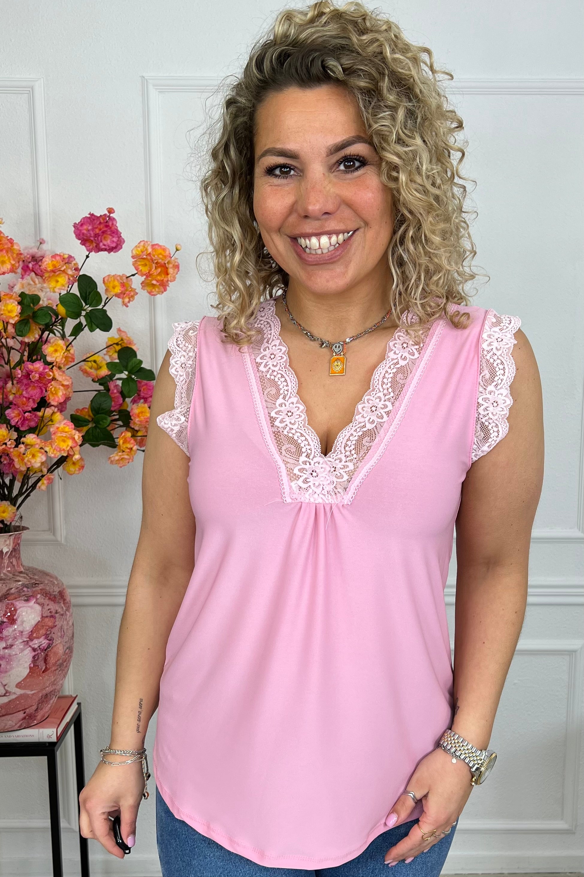 Heerlijke zomerse top met lace details, gemaakt van 100% viscose en ideaal voor ergens onder of lekker in de zomer! Shop hem in light pink!