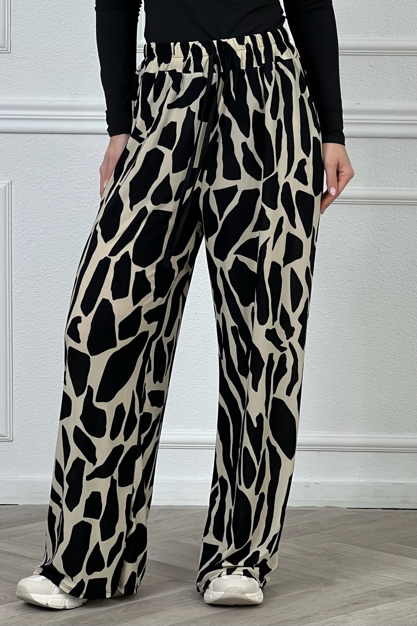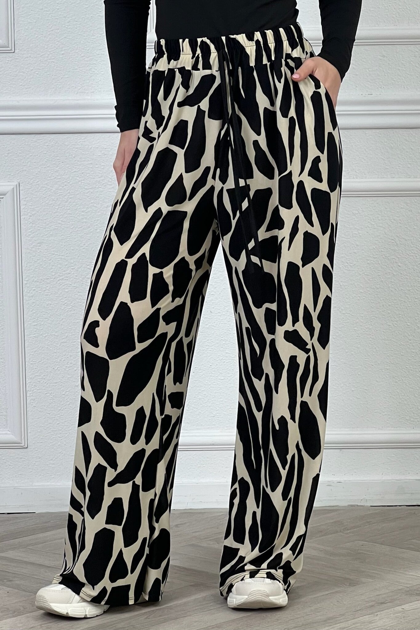 Een mooie wijdvallende broek met een elastieke band en twee touwtjes voor de sier! In een gave print met giraffepatroon! Shop hem in black/beige!