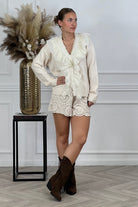 Deze amazing sweater heeft een leuk ruffle detail, so cute! Shop hem nu in beige.