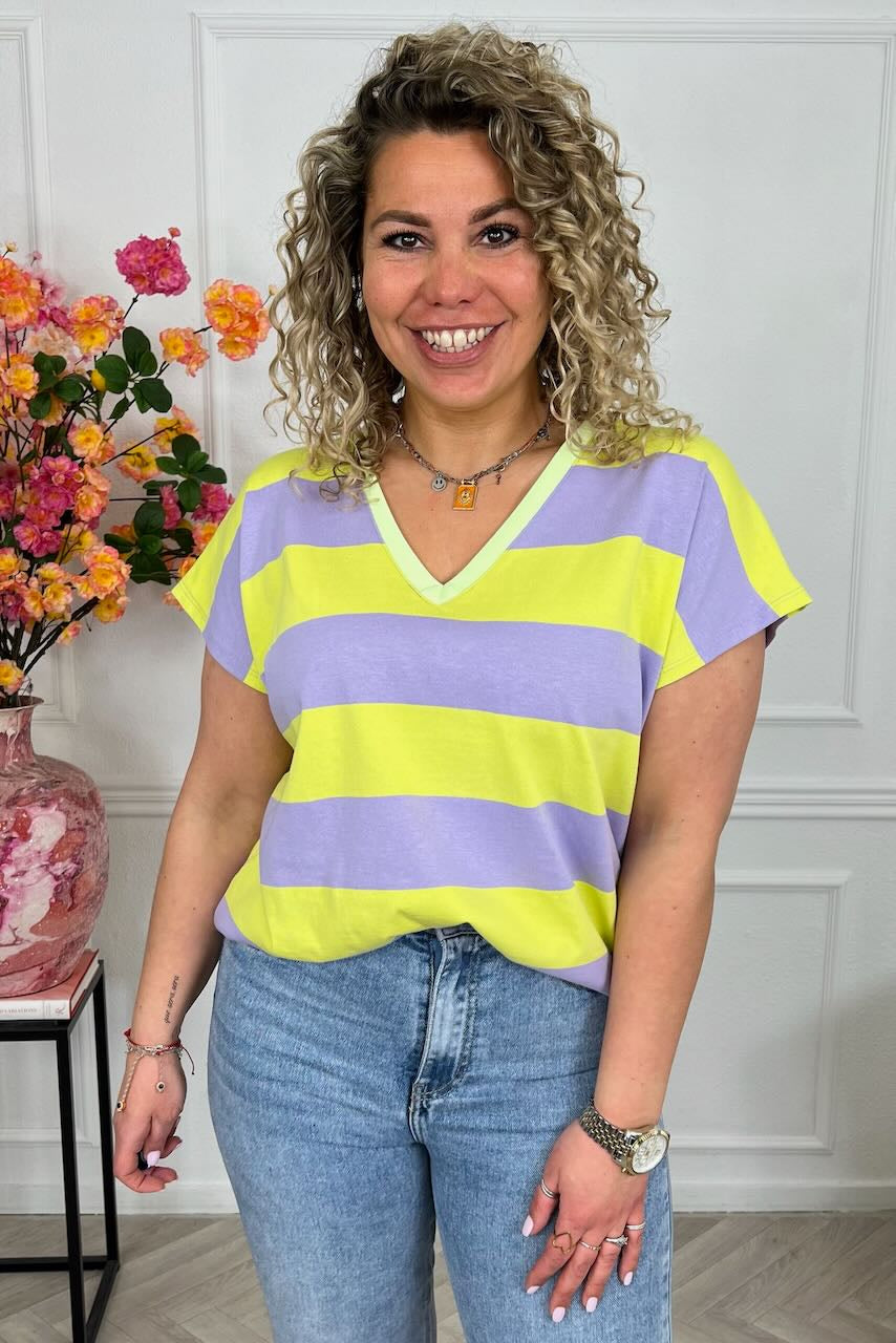Deze fijne V Neck shirts zijn ideaal voor zonnige dagen en helemaal on trend! Shop ze in prachtige kleuren, zoals lime/lila!